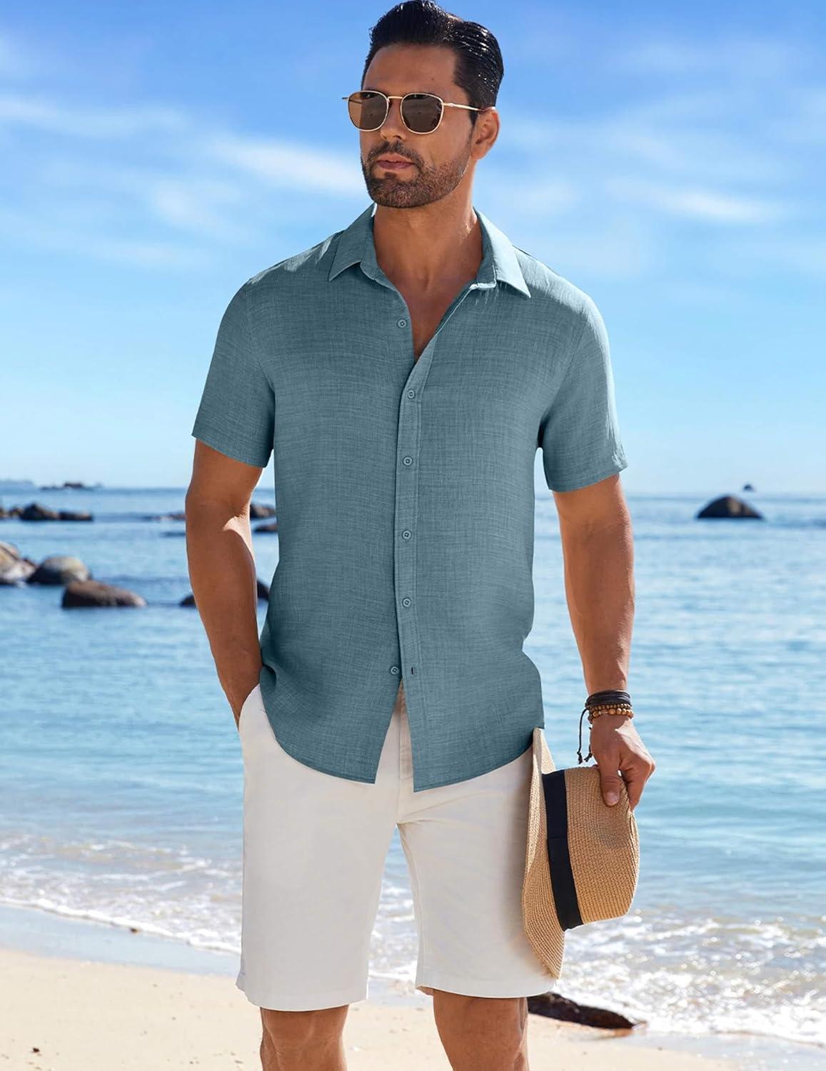 COOFANDY Men’s Casual Button Down Shirts Short Sleeve Textured Summer Beach Shirt(Clear Blue)
