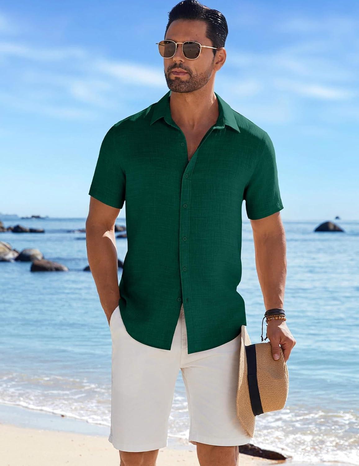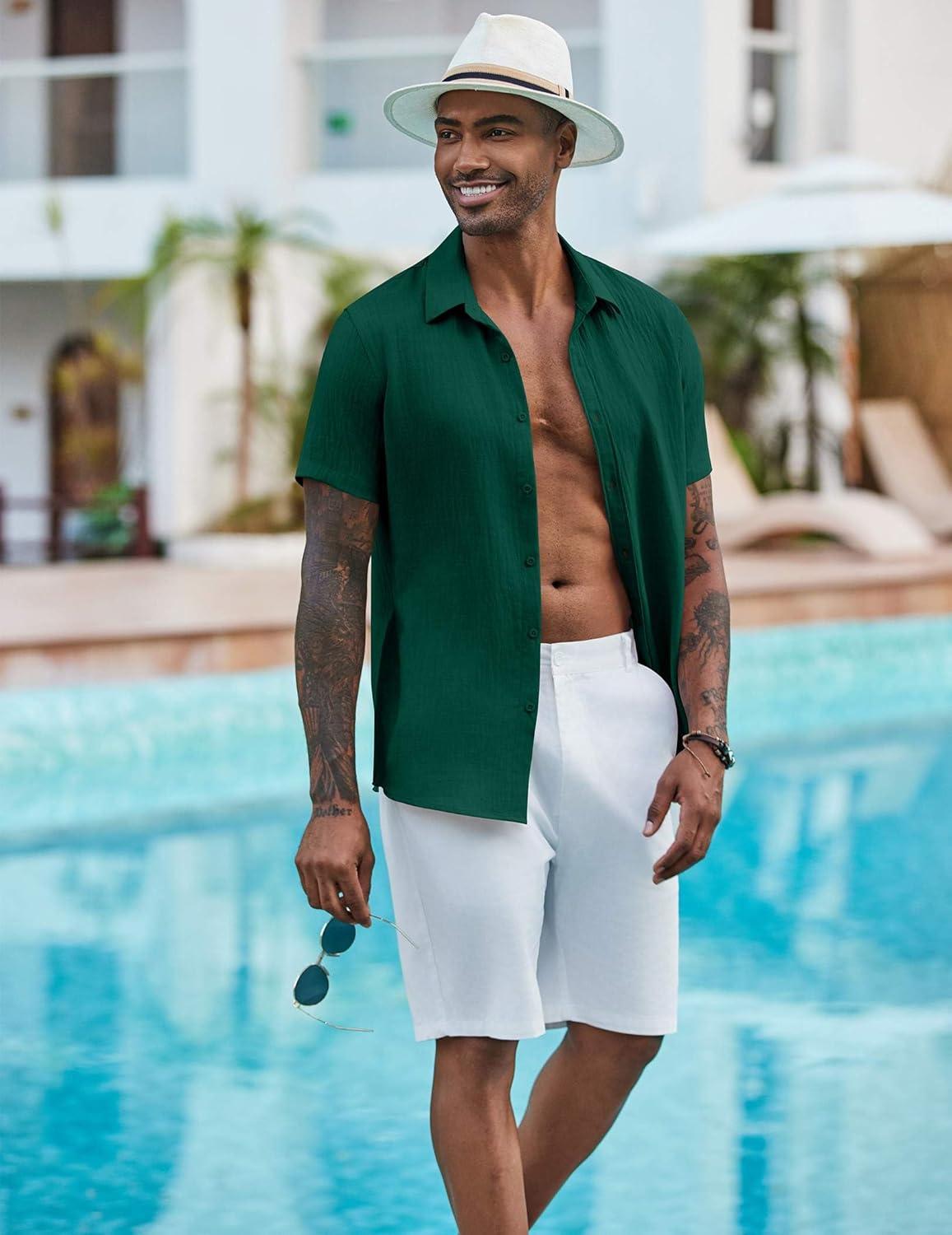 COOFANDY Men's Casual Button Down Shirts Short Sleeve Textured Summer Beach Shirt(Dark Green)