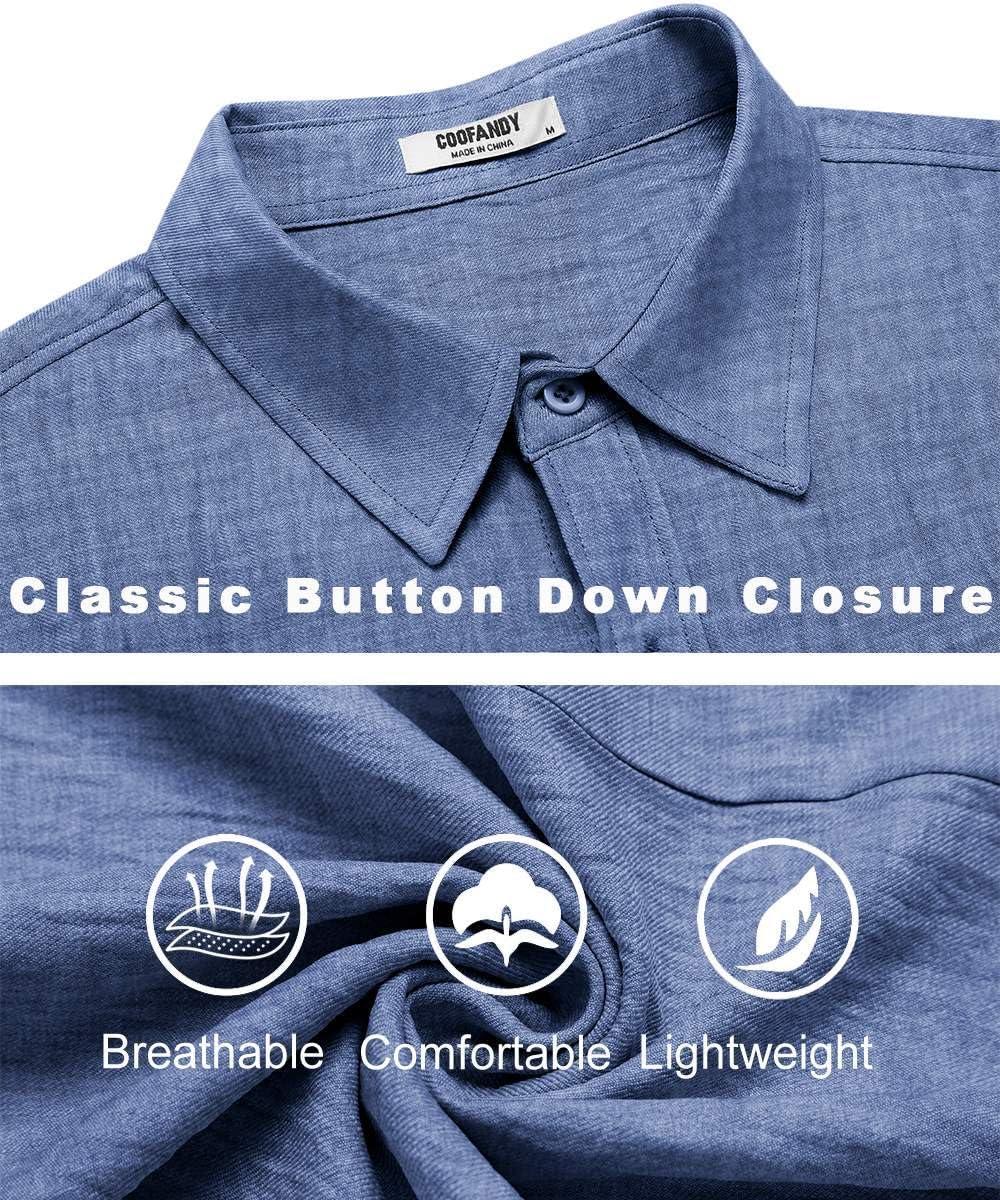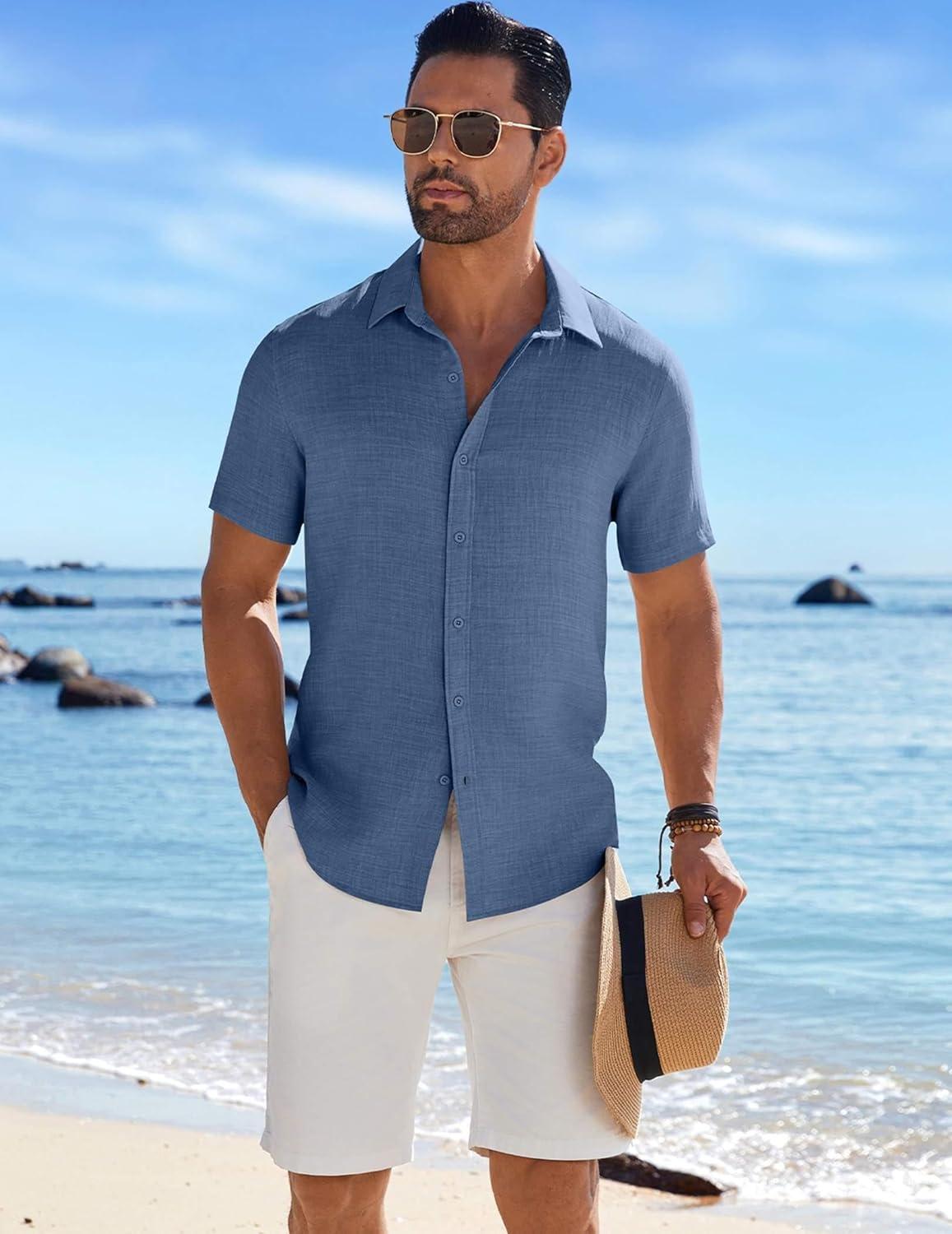 COOFANDY Men's Casual Button Down Shirts Short Sleeve Textured Summer Beach Shirt(Denim Blue)