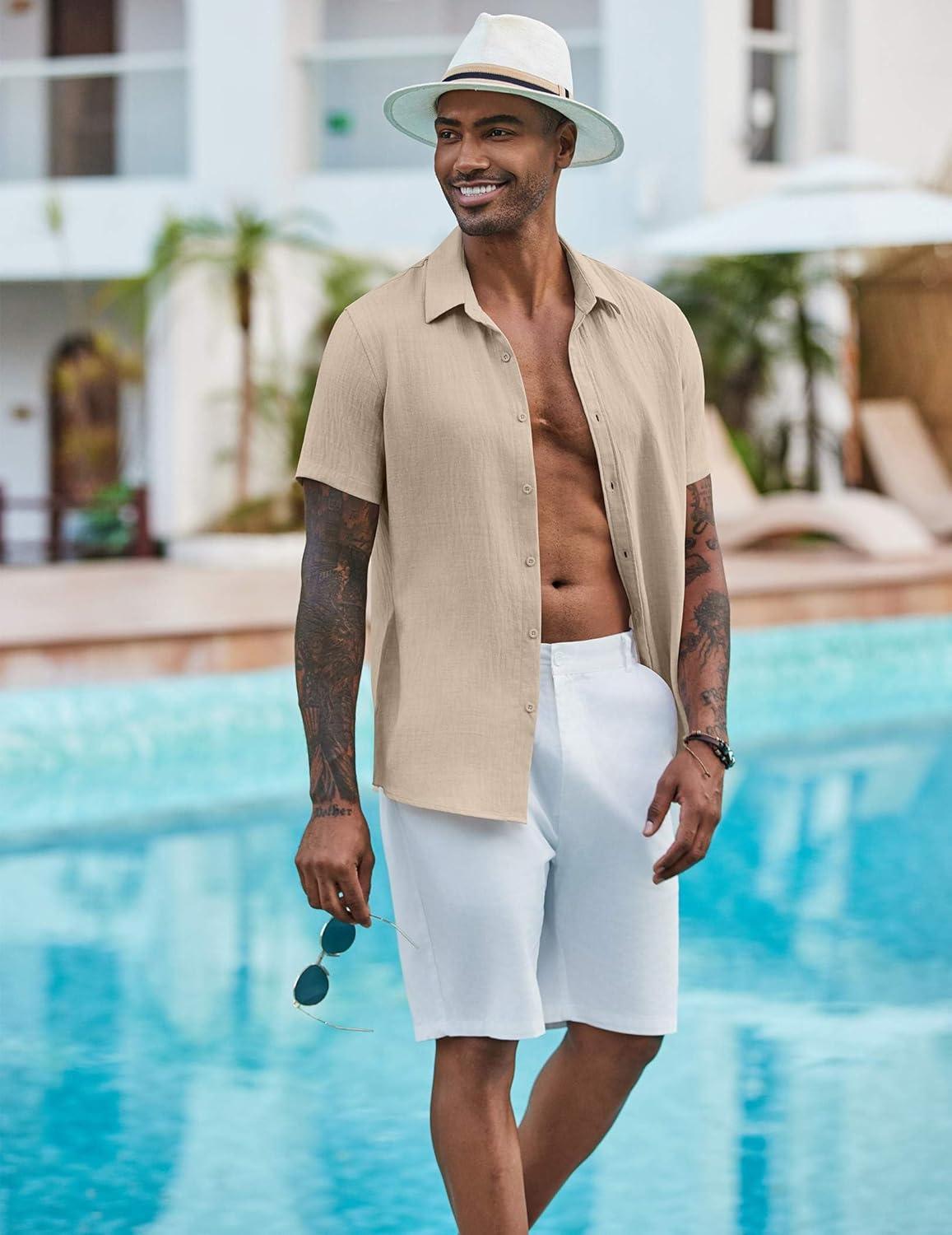 COOFANDY Men’s Casual Button Down Shirts Short Sleeve Textured Summer Beach Shirt(Light Khaki)