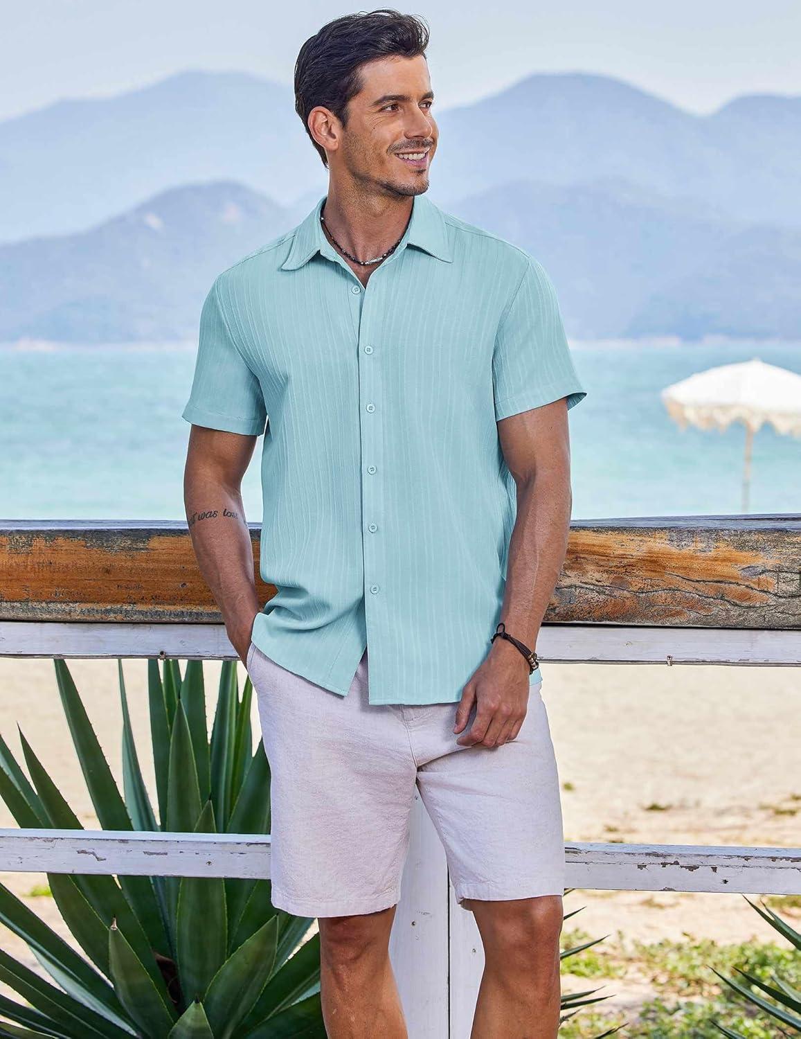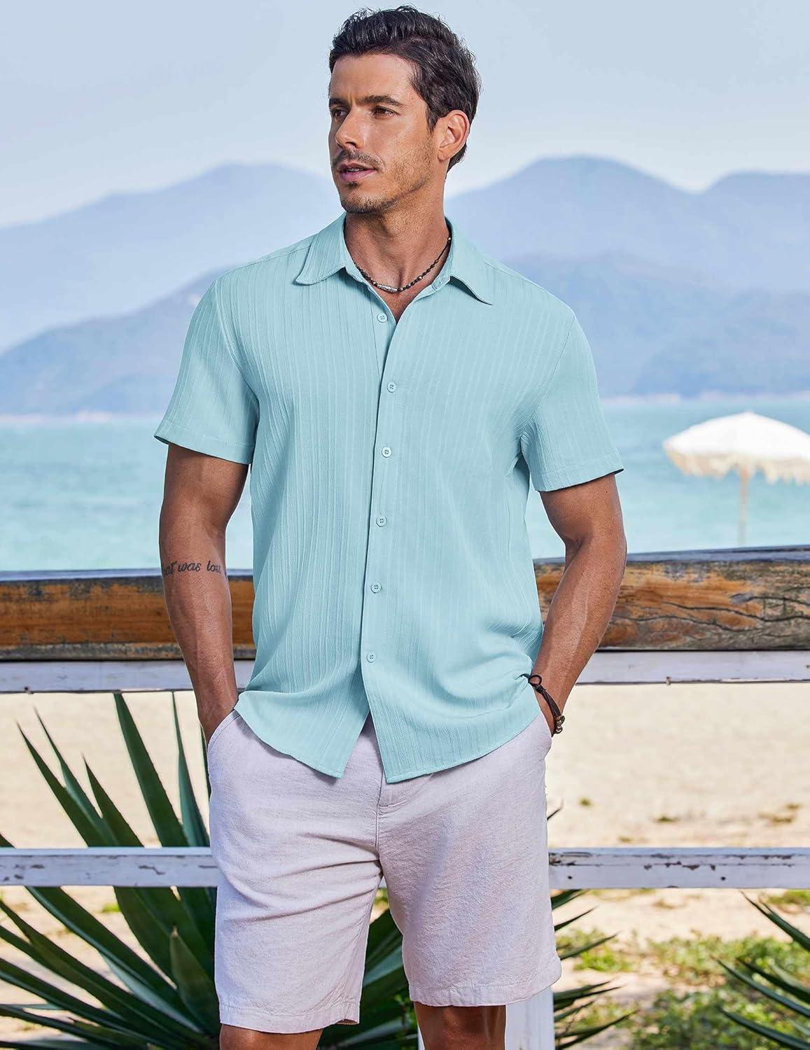 COOFANDY Men’s Casual Button Down Shirts Short Sleeve Textured Summer Beach Shirts(Baby Blue)