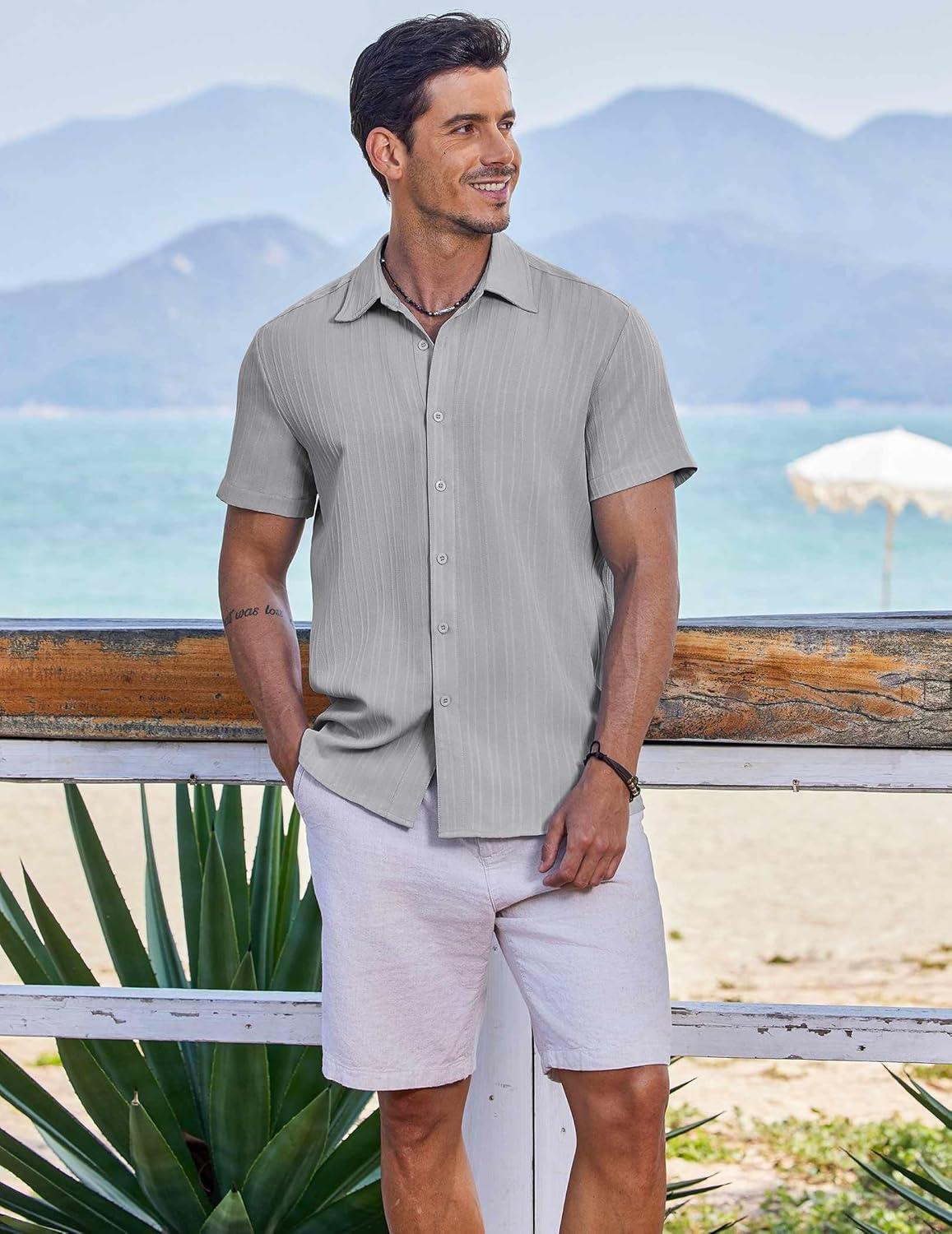 COOFANDY Men’s Casual Button Down Shirts Short Sleeve Textured Summer Beach Shirts(Light Grey)