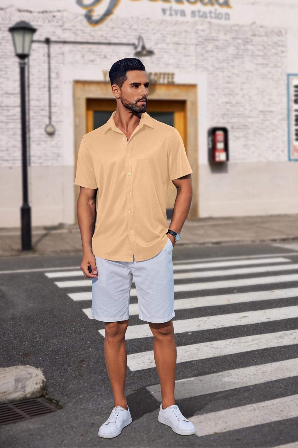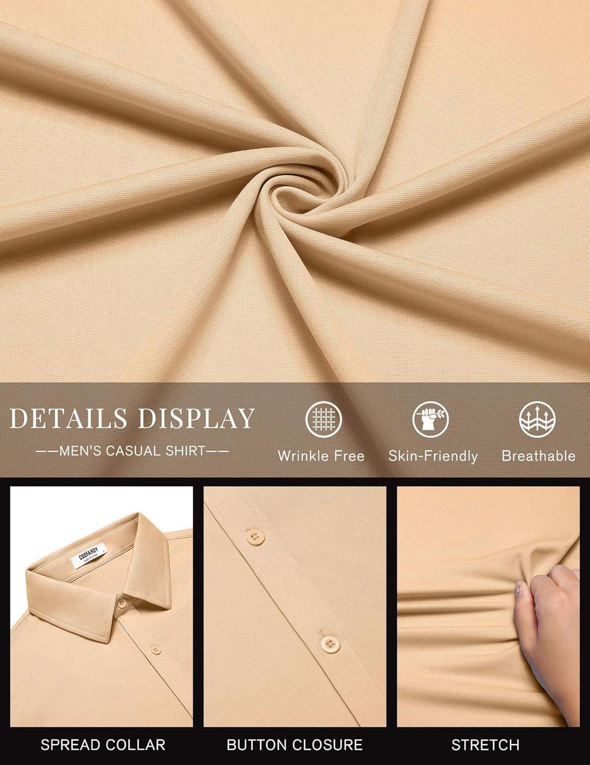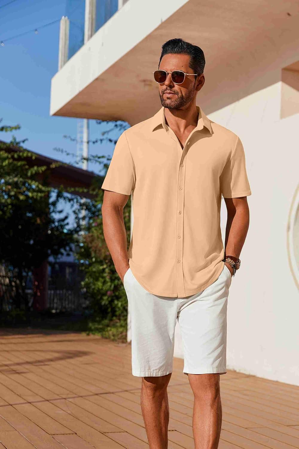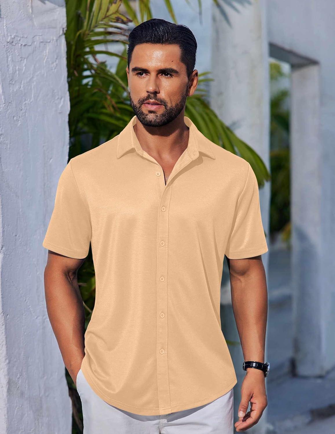 COOFANDY Mens Casual Button Down Shirts Short Sleeve Wrinkle Free Shirt Untucked Summer Stretch Dress Shirt(Light Tan)