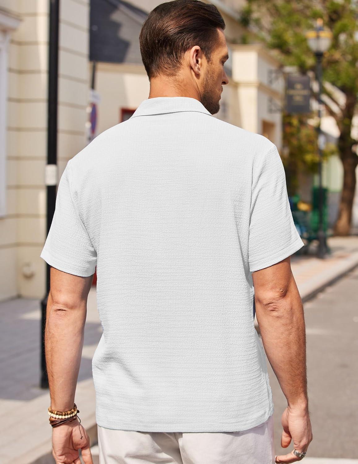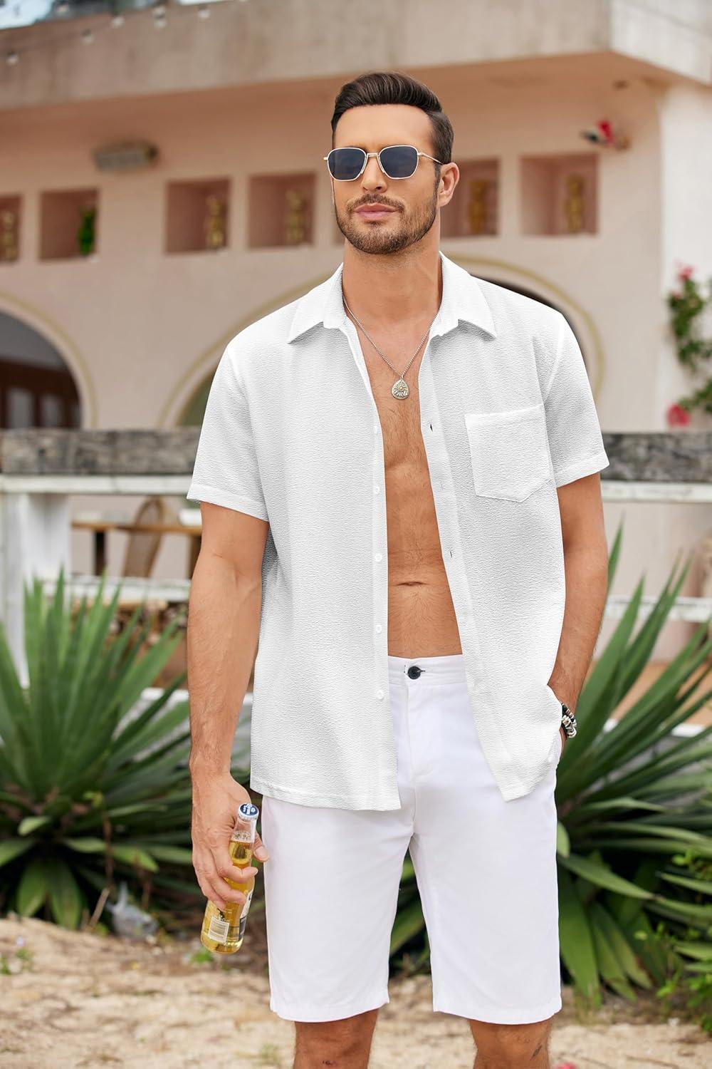 COOFANDY Men's Casual Button Down Short Sleeve Shirt Textured Summer Beach Vacation Shirt(A-white)