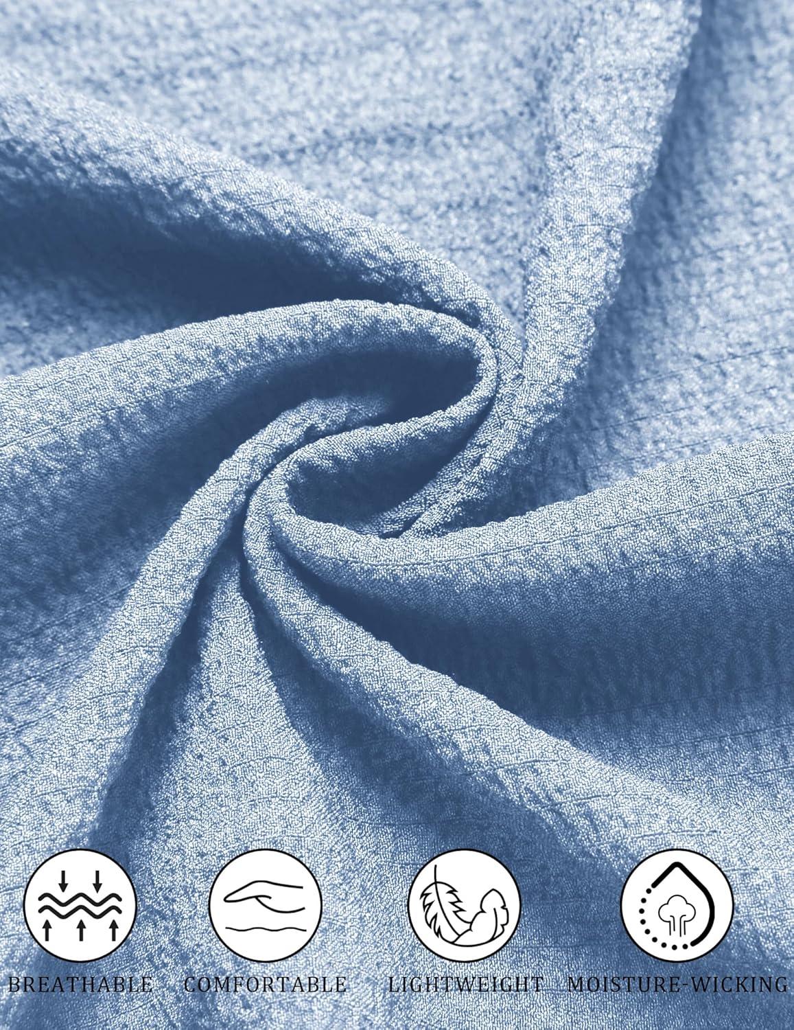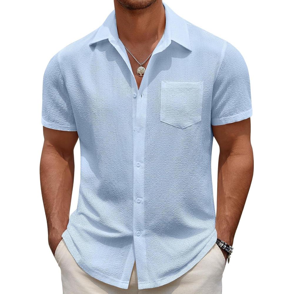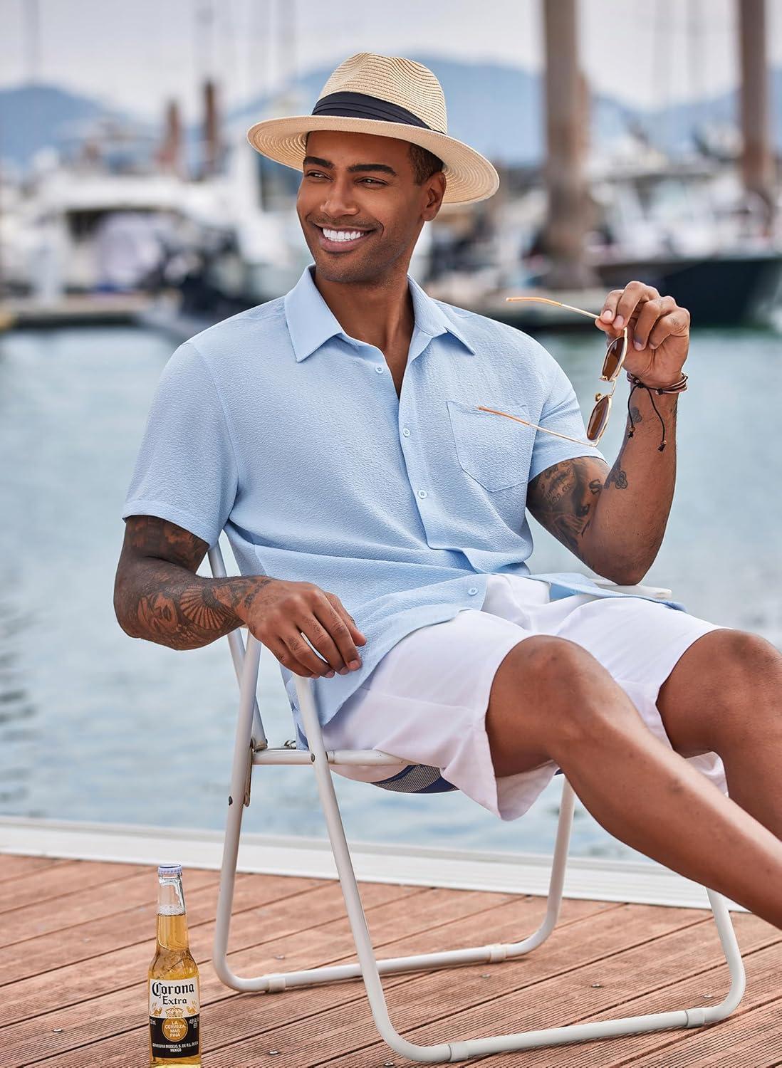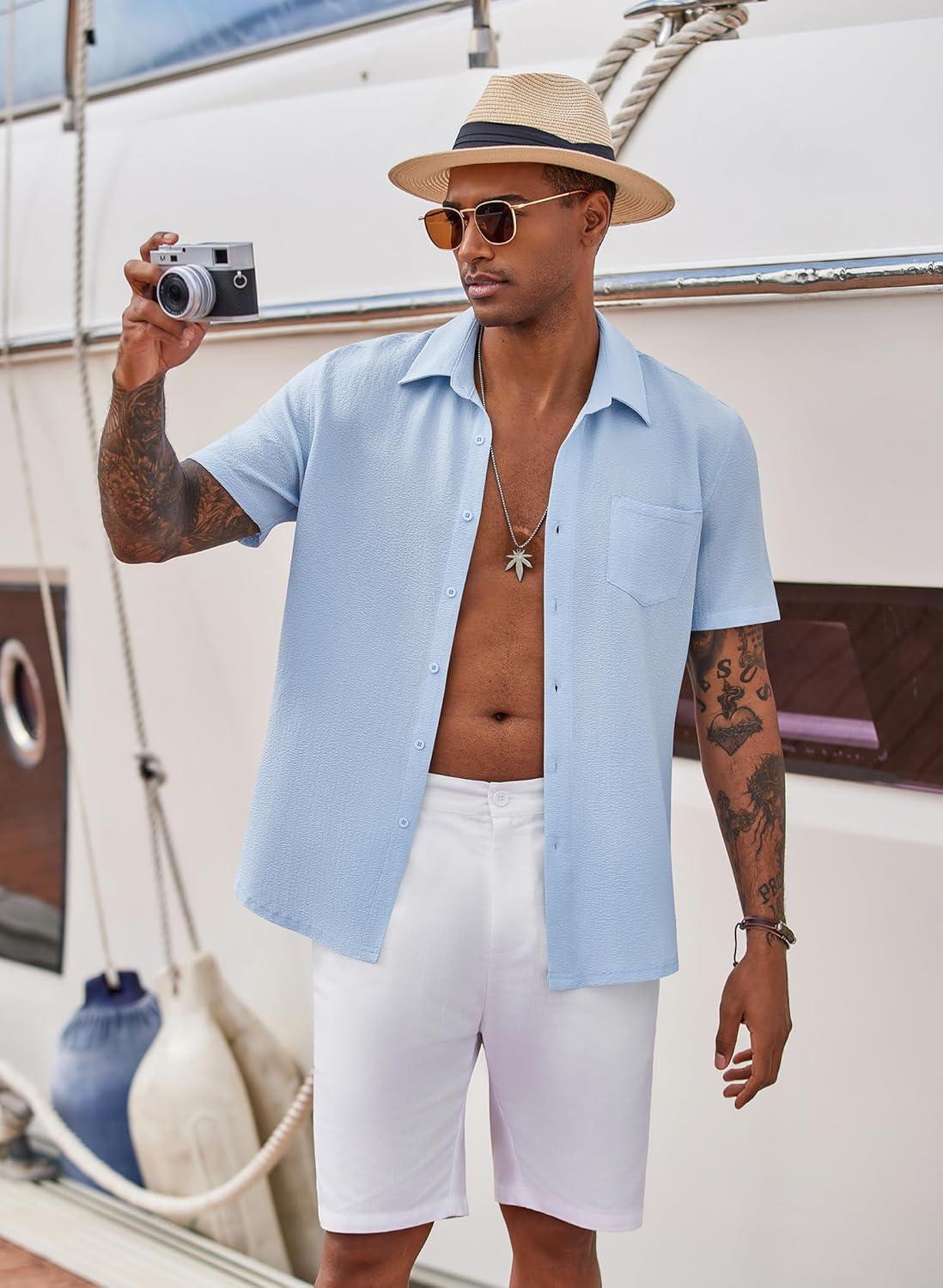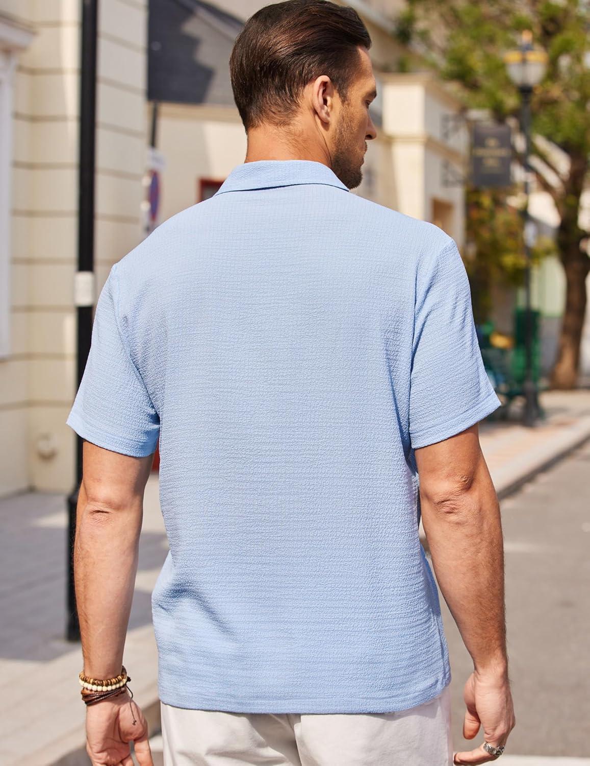 COOFANDY Men's Casual Button Down Short Sleeve Shirt Textured Summer Beach Vacation Shirt(Light Blue)