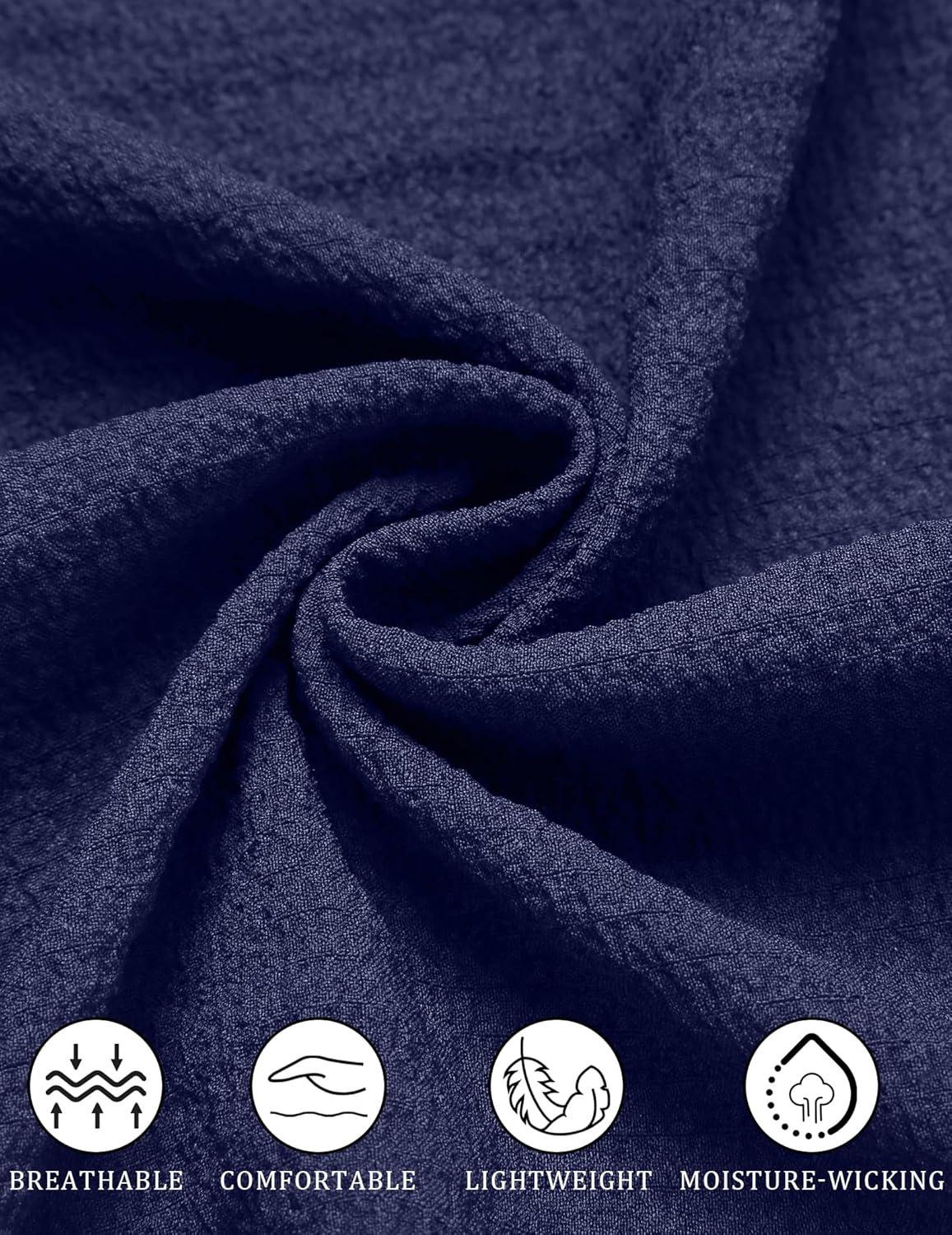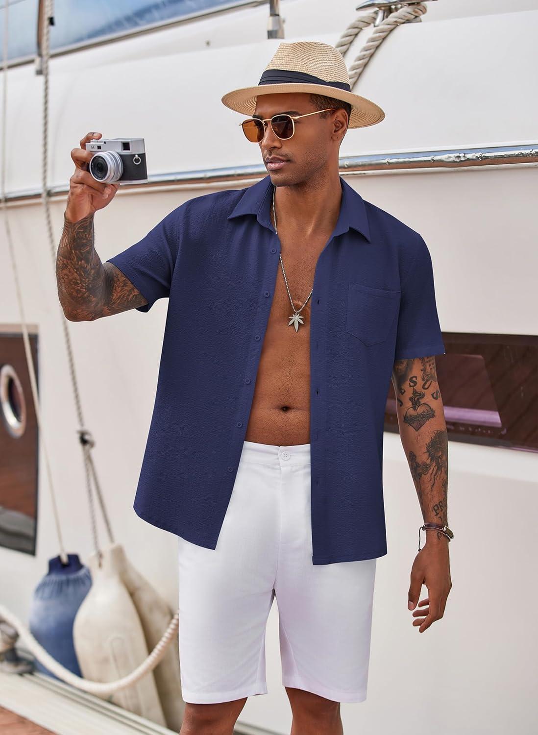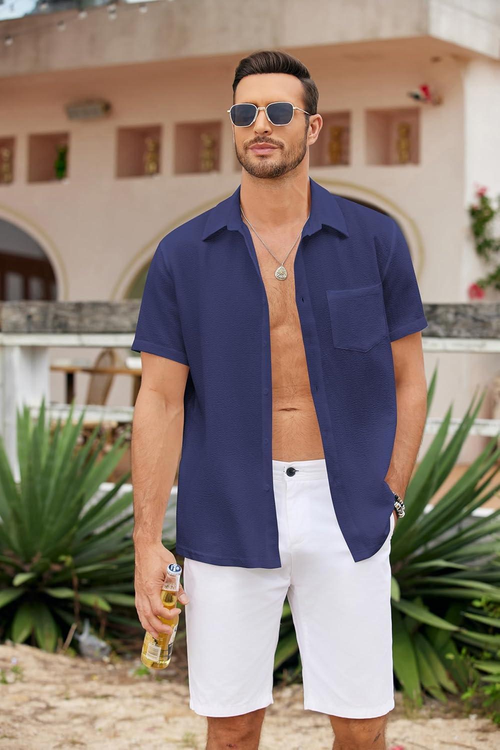 Score big savings on COOFANDY Men’s Casual Button Down Short Sleeve Shirt Textured Summer Beach Vacation Shirt(Navy Blue) during our back-to-school sale. Limited quantities available.