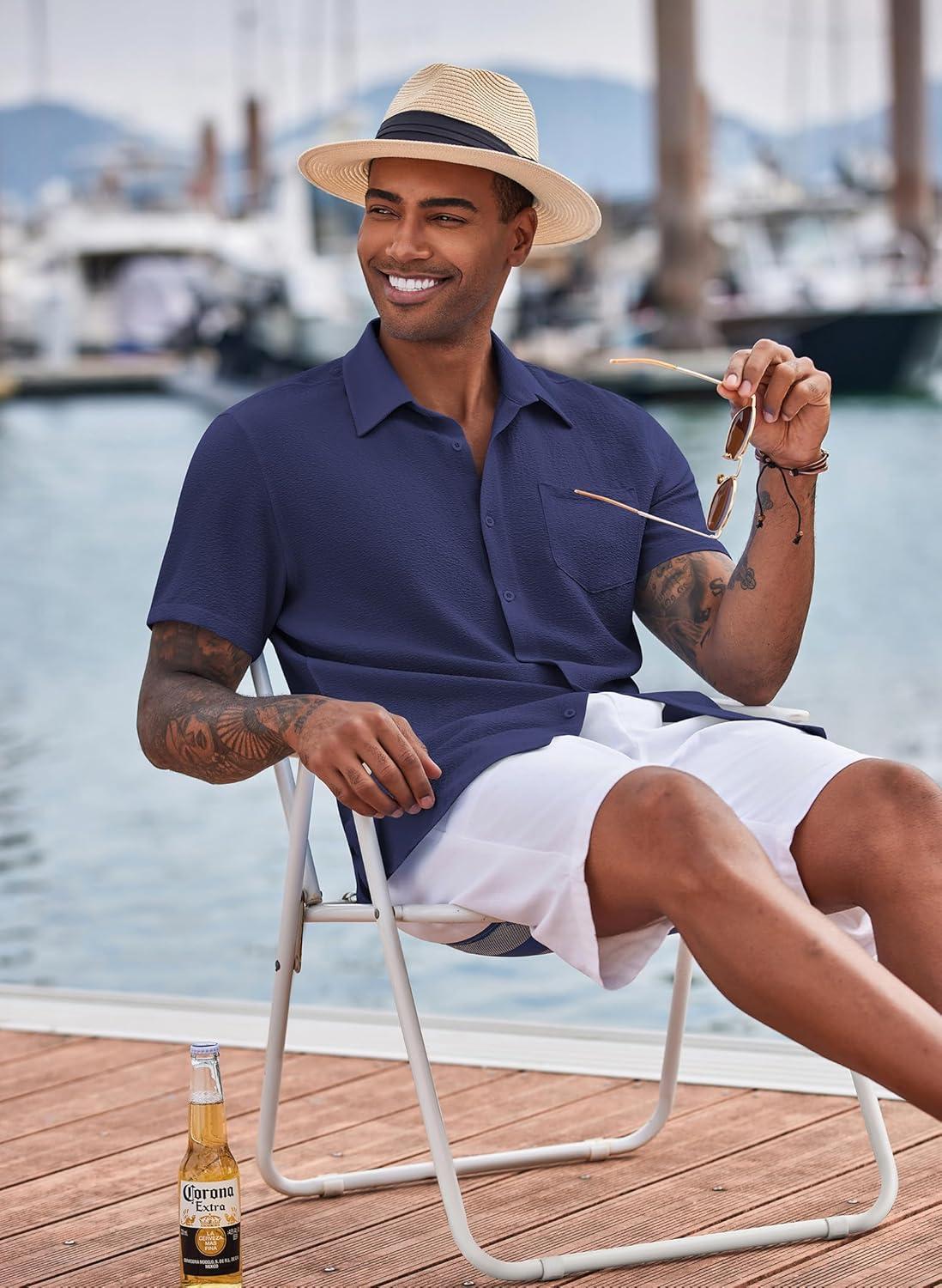 COOFANDY Men’s Casual Button Down Short Sleeve Shirt Textured Summer Beach Vacation Shirt(Navy Blue)