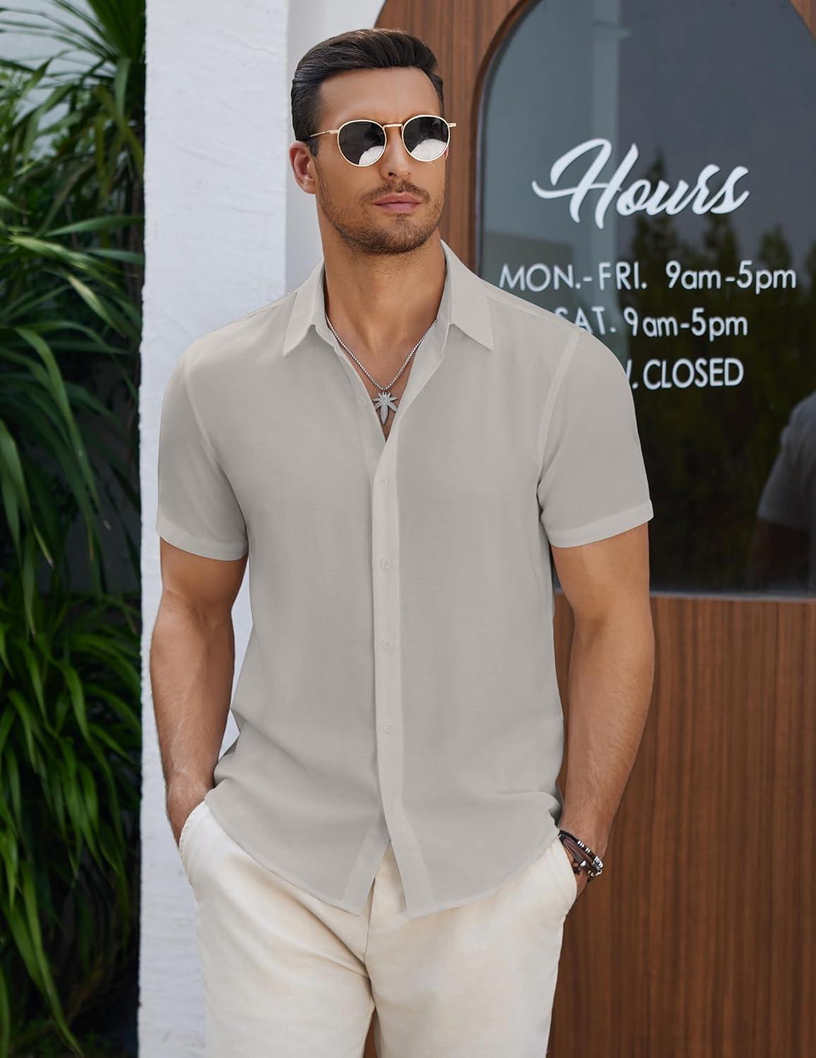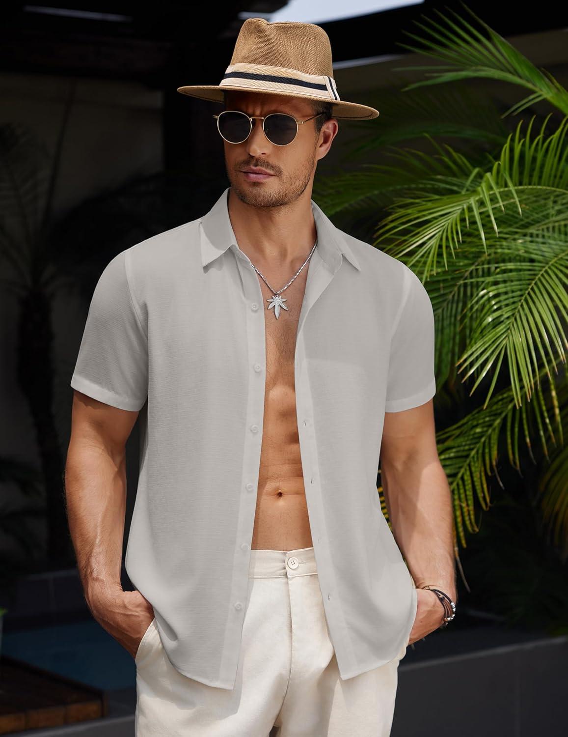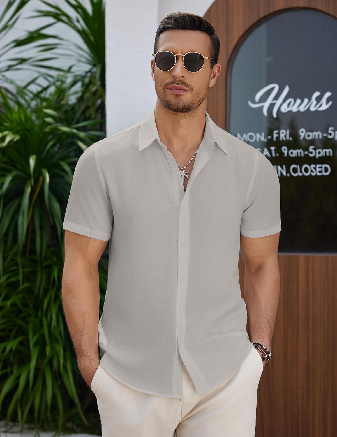 COOFANDY Men's Casual Button Down Short Sleeve Shirts Summer Beach Wedding Shirt Vacation Cotton Shirts(Light Gray)