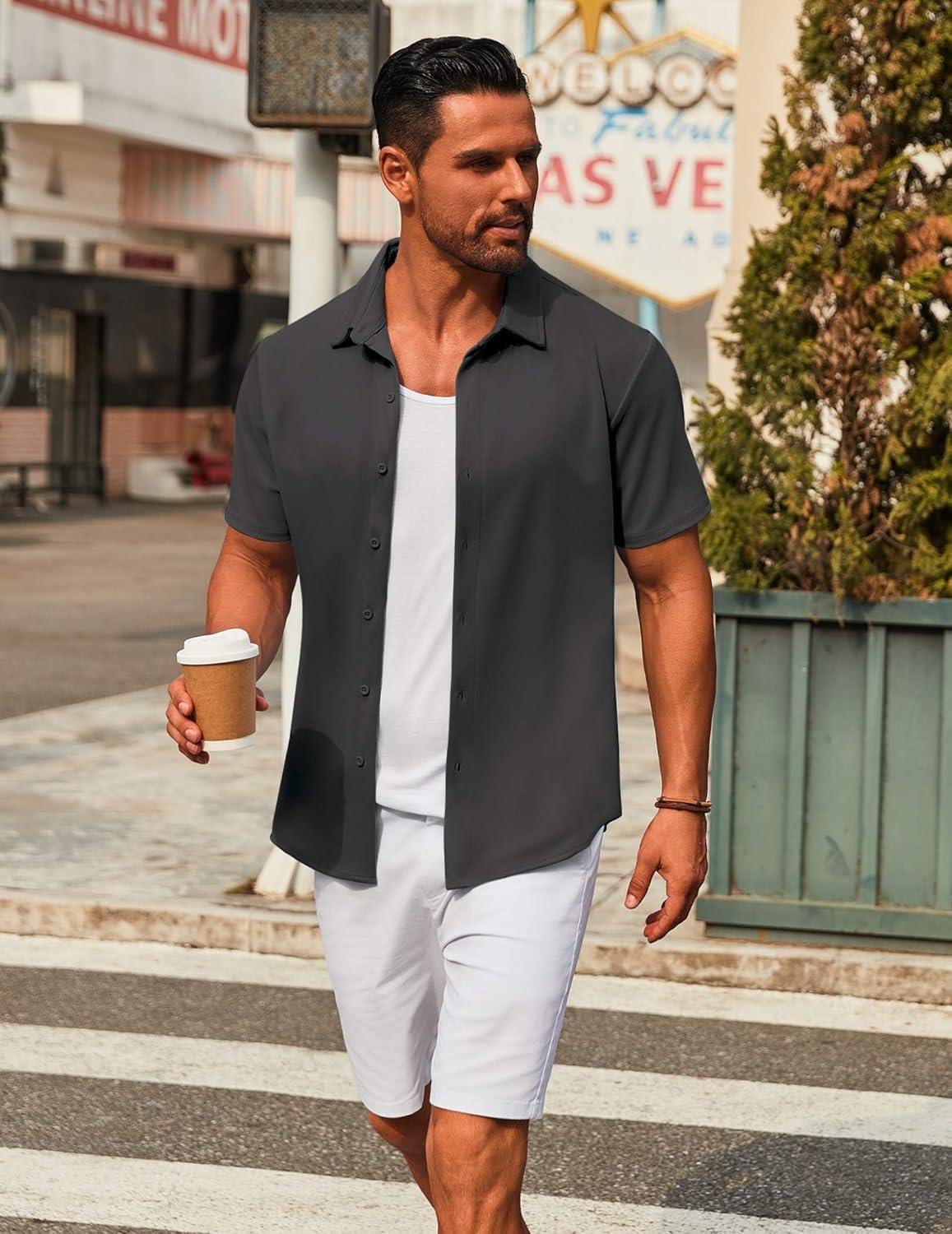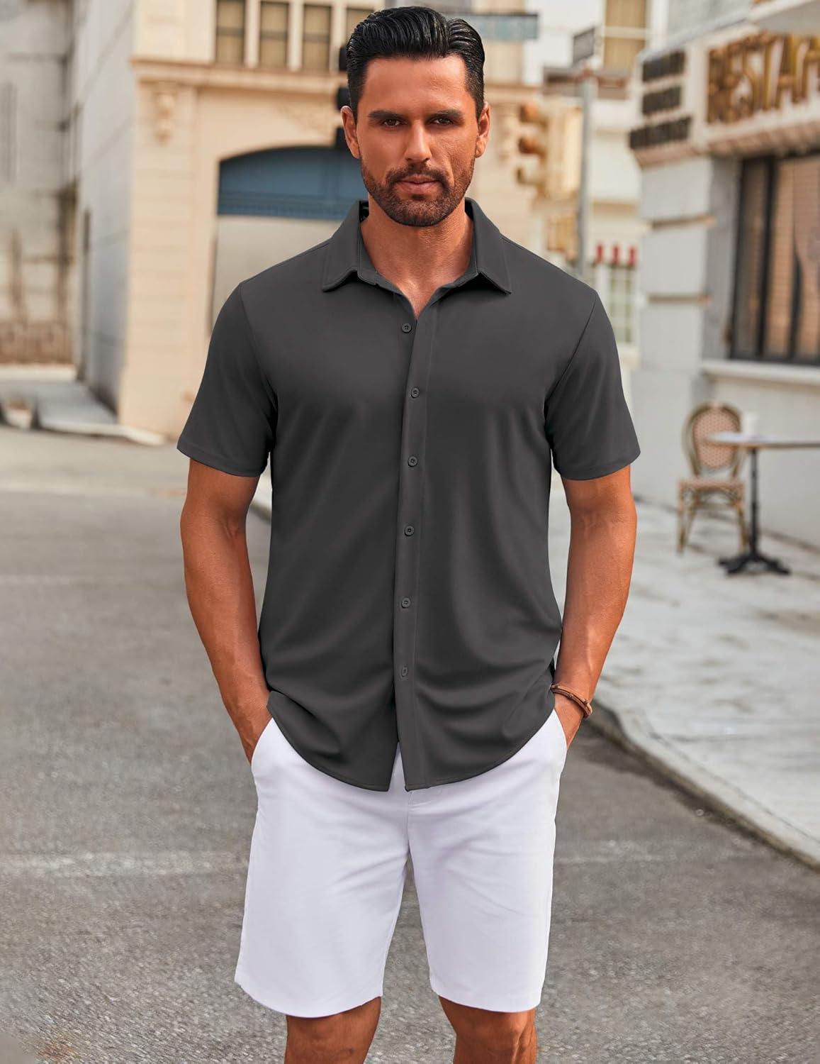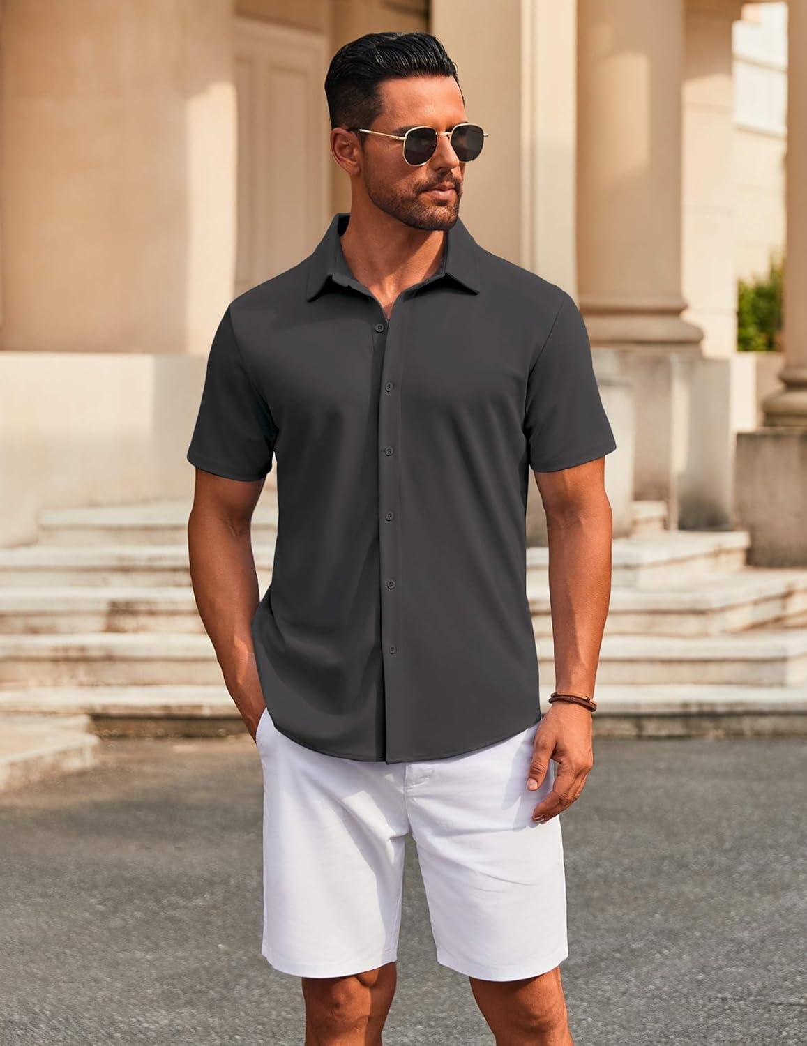 COOFANDY Men’s Casual Button Down Short Sleeve Shirts Untucked Wrinkle Free Shirt Stretch Dress Shirts(Dark Grey)