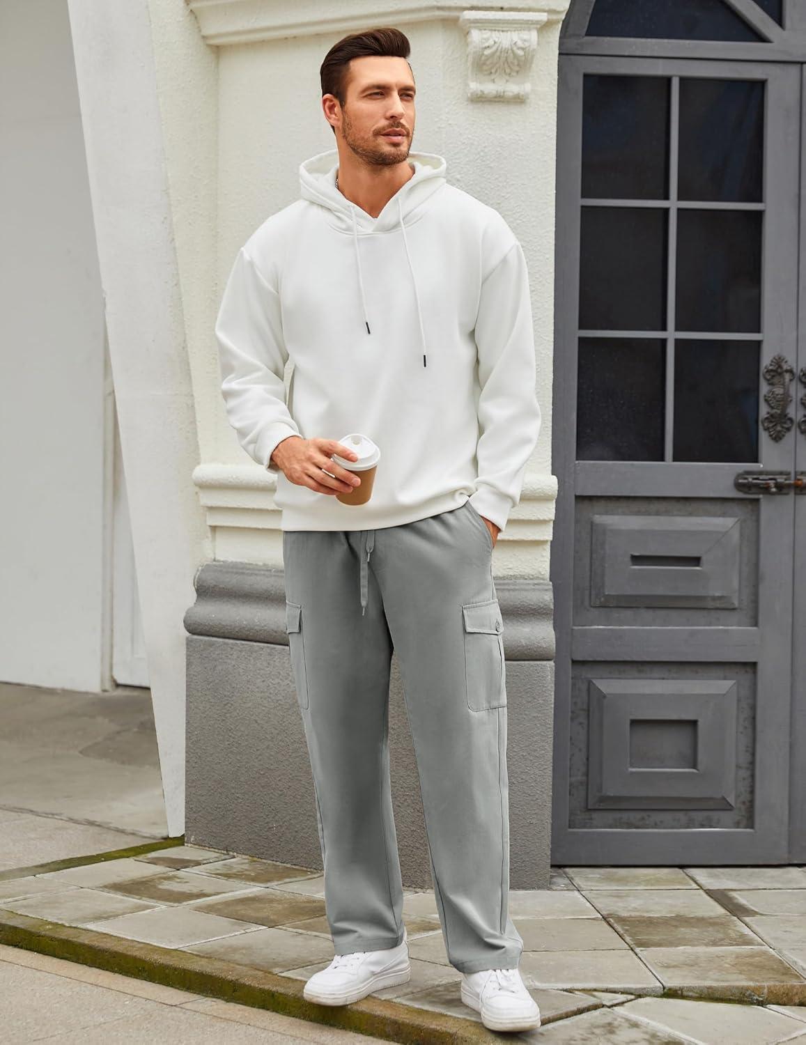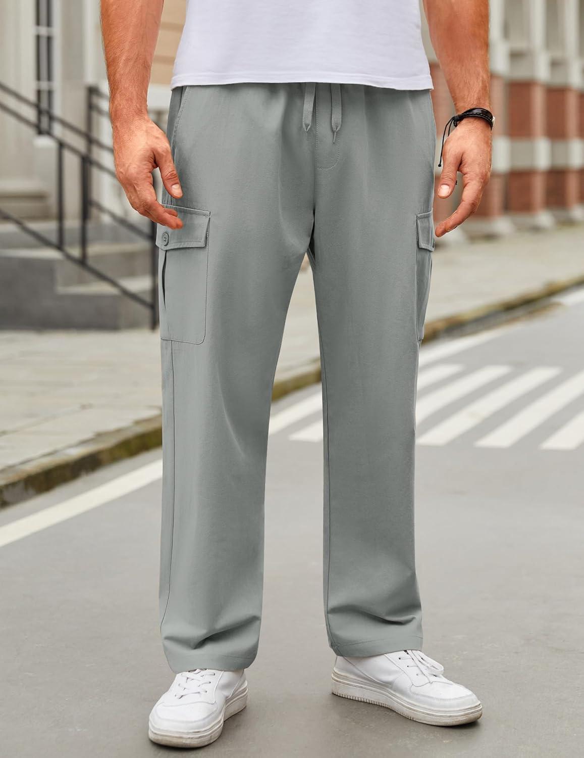 COOFANDY Mens Casual Cargo Pants Relaxed Fit Outdoor Hiking Pants Cotton Drawstring Sweatpants with Pockets(Light Grey)