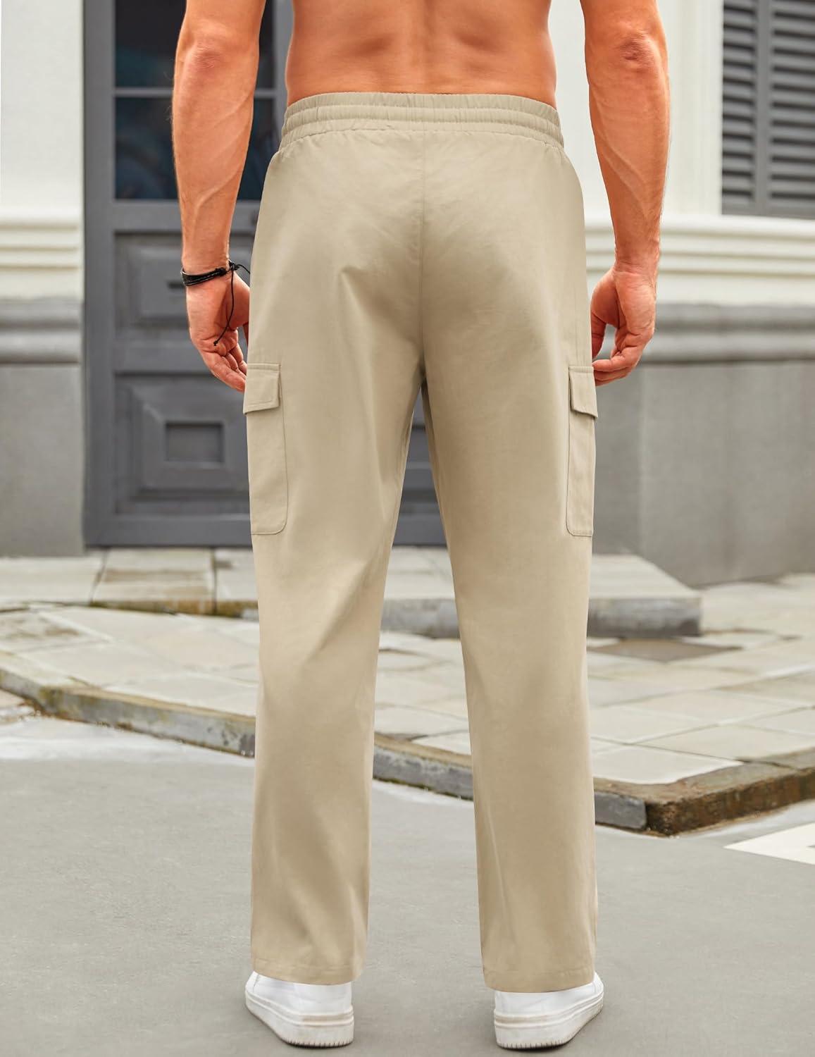 COOFANDY Mens Casual Cargo Pants Relaxed Fit Outdoor Hiking Pants Cotton Drawstring Sweatpants with Pockets(Light Khaki)