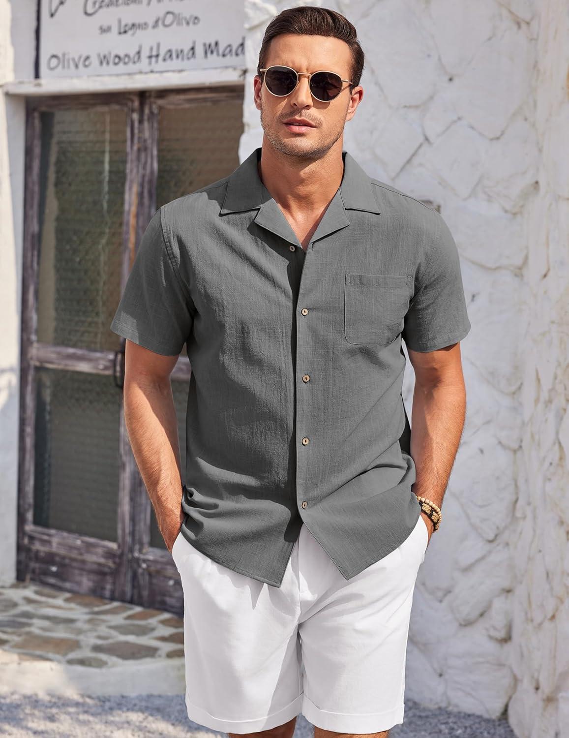 COOFANDY Mens Casual Cotton Linen Shirt Short Sleeve Button Up Shirts Summer Beach Top(Dark Gray)