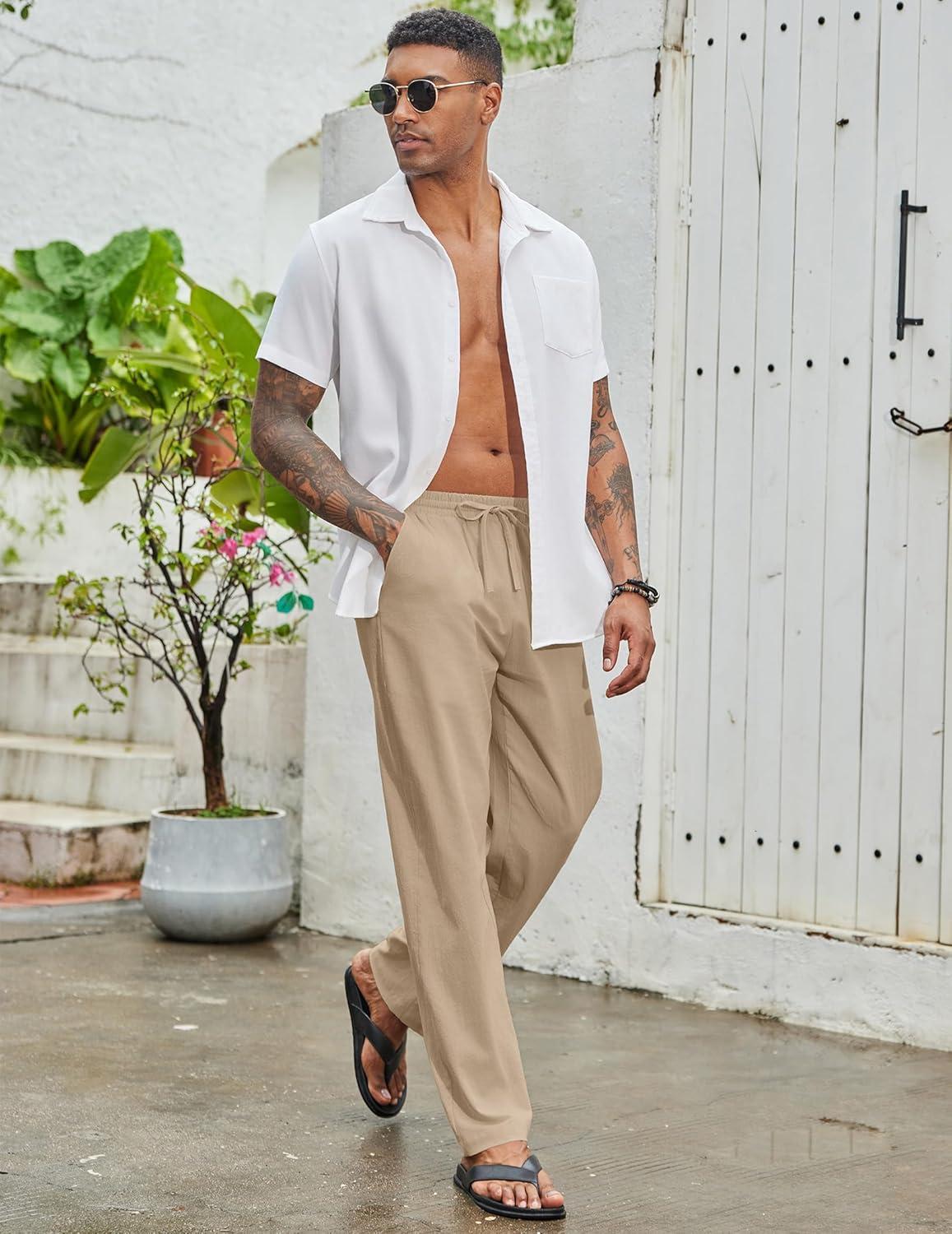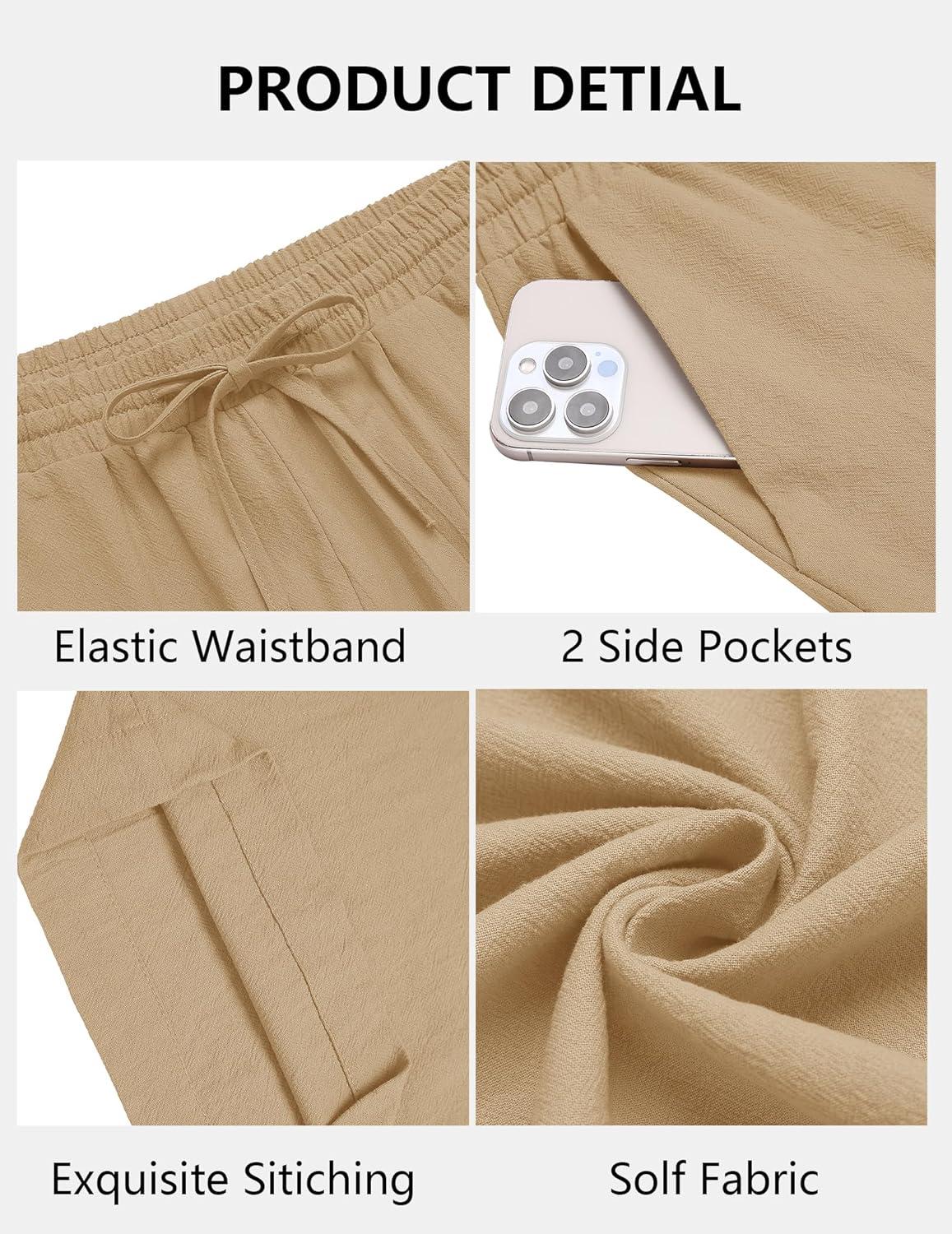COOFANDY Men’s Casual Cotton Pants Elastic Waist Drawstring Linen Beach Summer Pants Lightweight Yoga Trousers(Khaki)