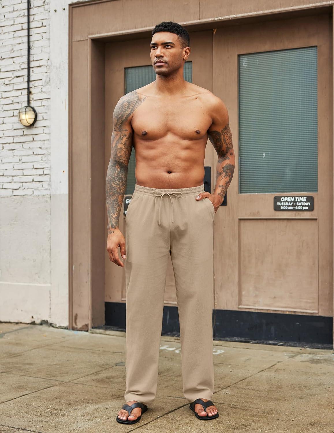 COOFANDY Men's Casual Cotton Pants Elastic Waist Drawstring Linen Beach Summer Pants Lightweight Yoga Trousers(Khaki)