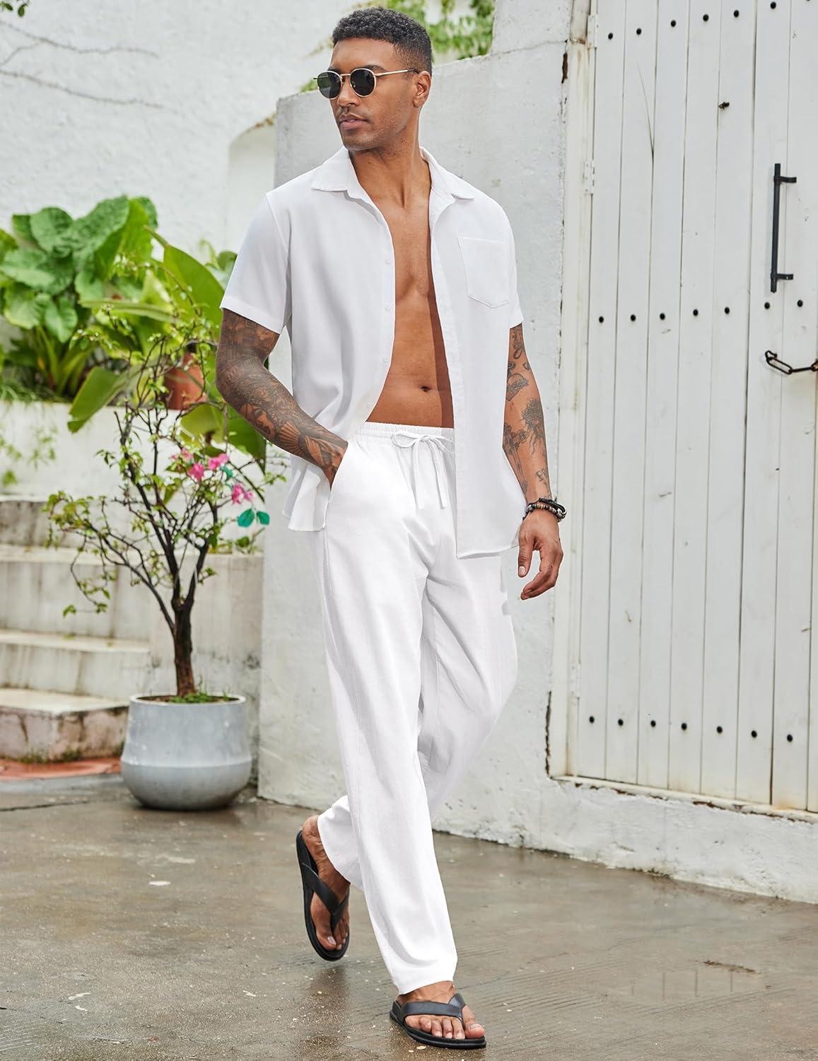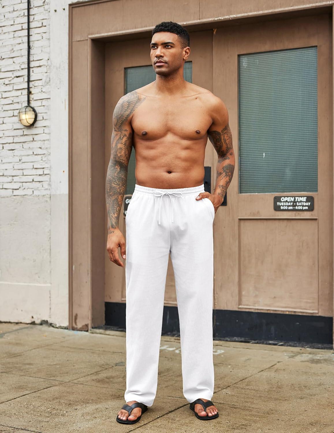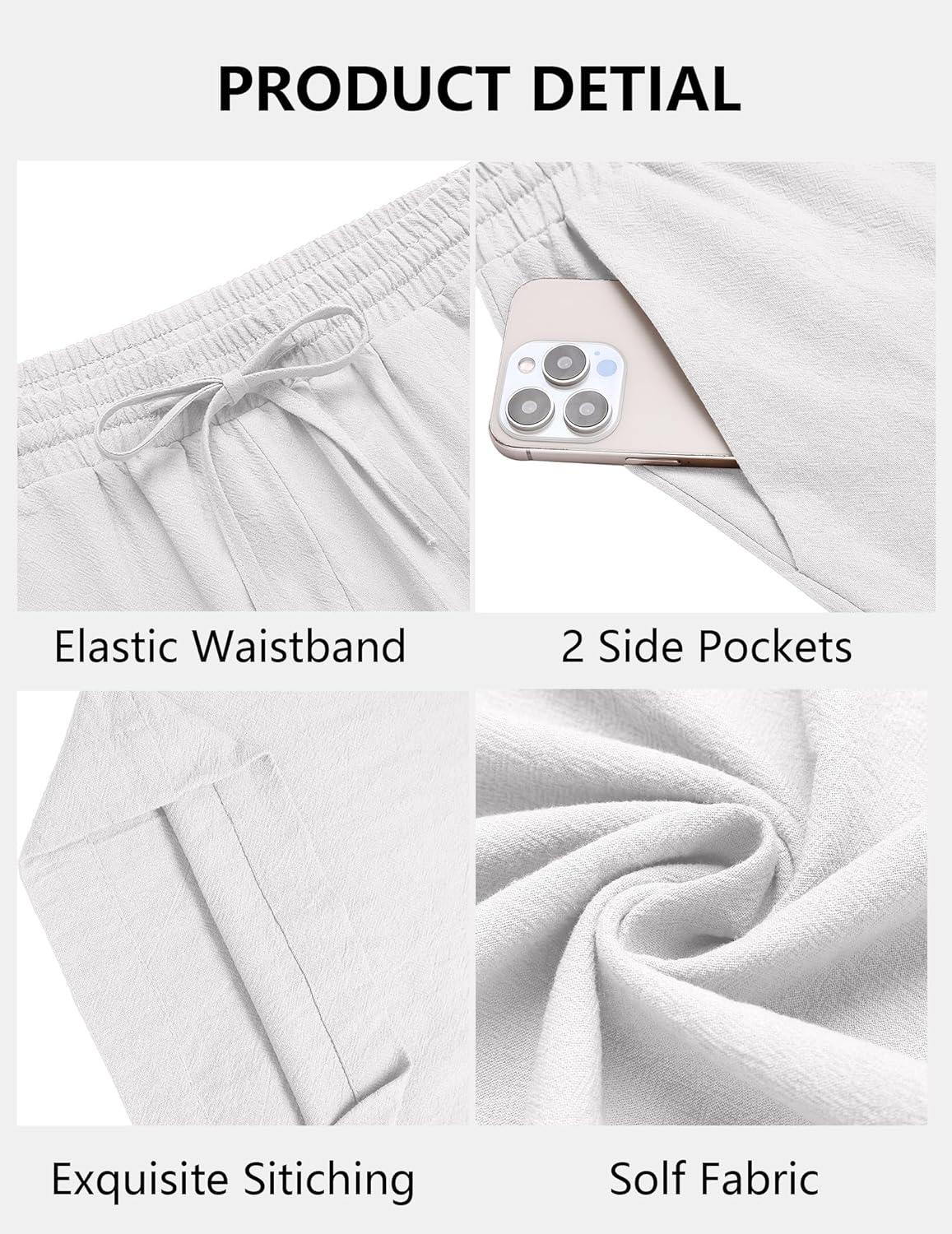 COOFANDY Men's Casual Cotton Pants Elastic Waist Drawstring Linen Beach Summer Pants Lightweight Yoga Trousers(White)