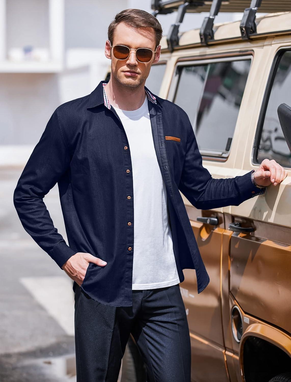 COOFANDY Men's Casual Dress Shirt Button Down Shirts Long-Sleeve Plaid Collar Denim Work Shirt(Type 01 Ultramarine Blue)