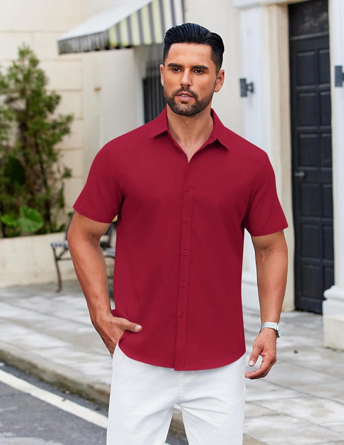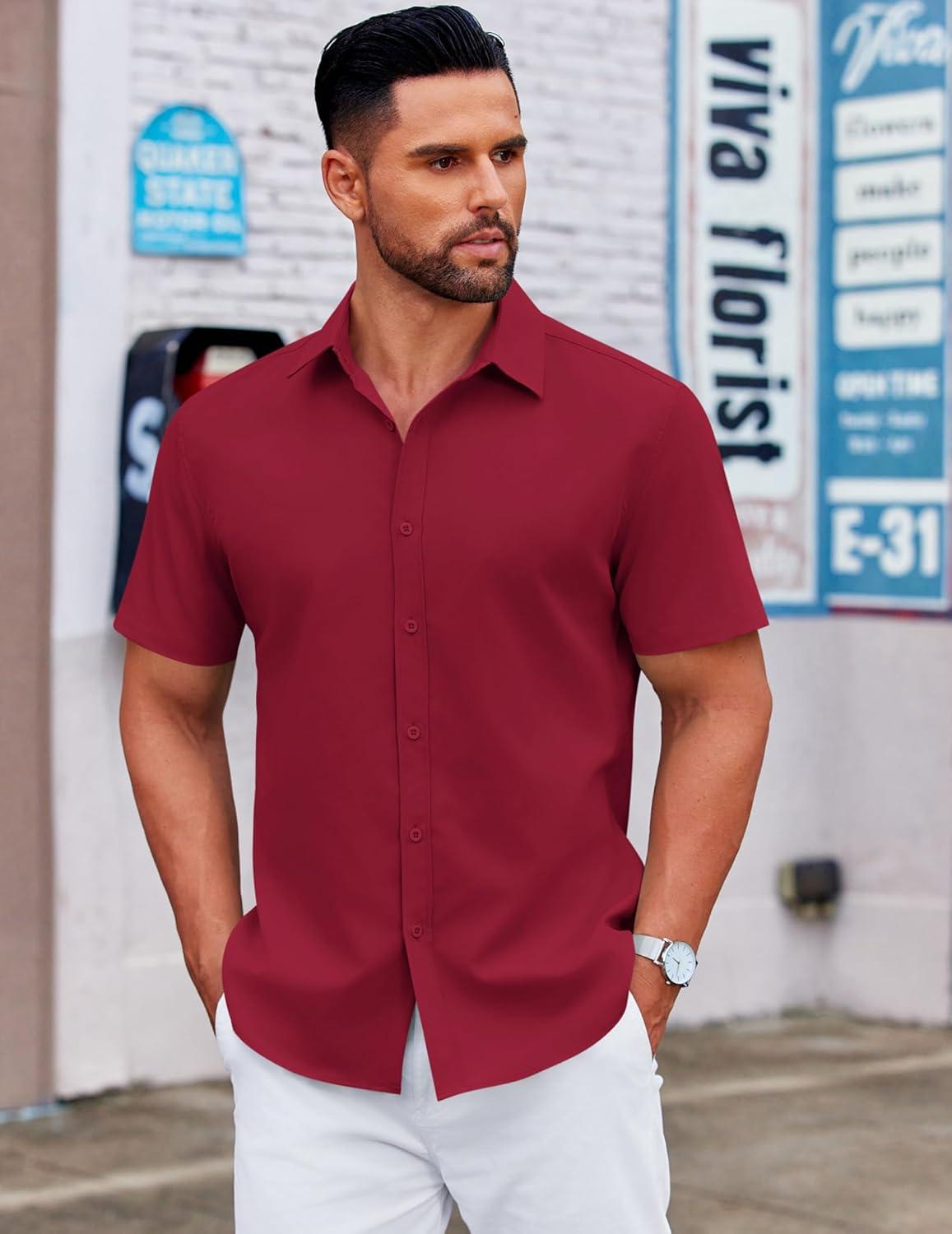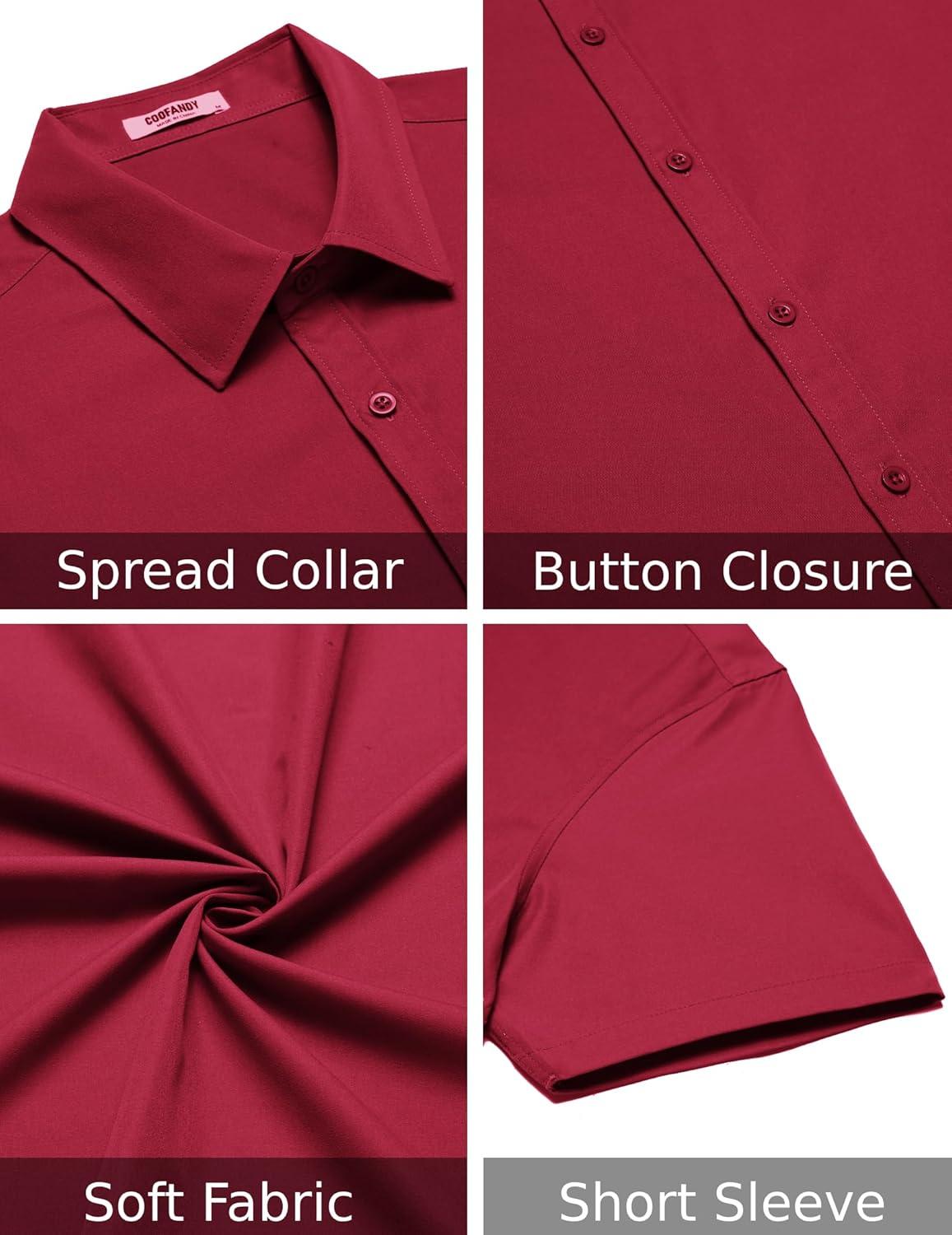 COOFANDY Men's Casual Dress Shirt Short Sleeve Button Down Shirts Summer Wedding Untucked Shirt(Carmine)
