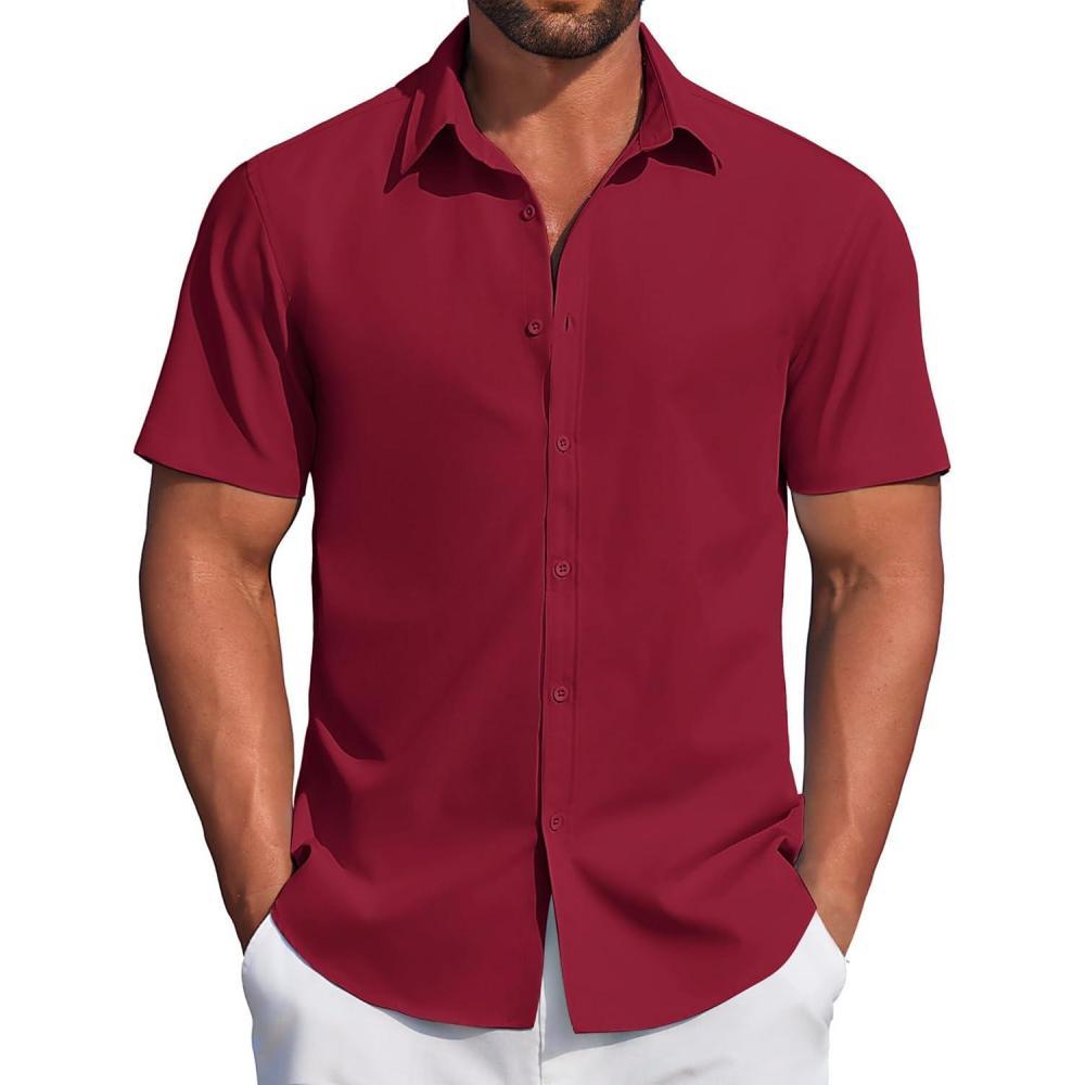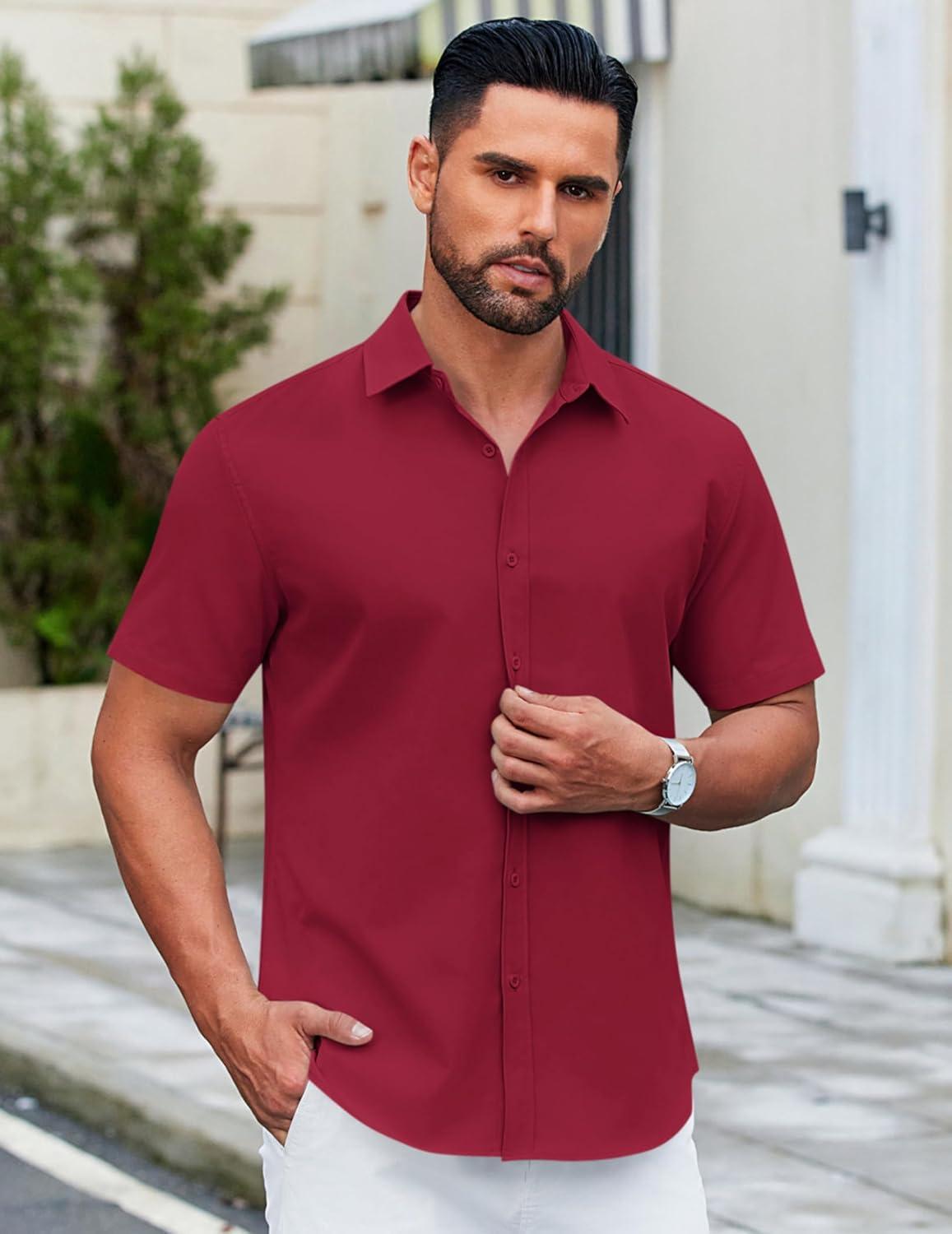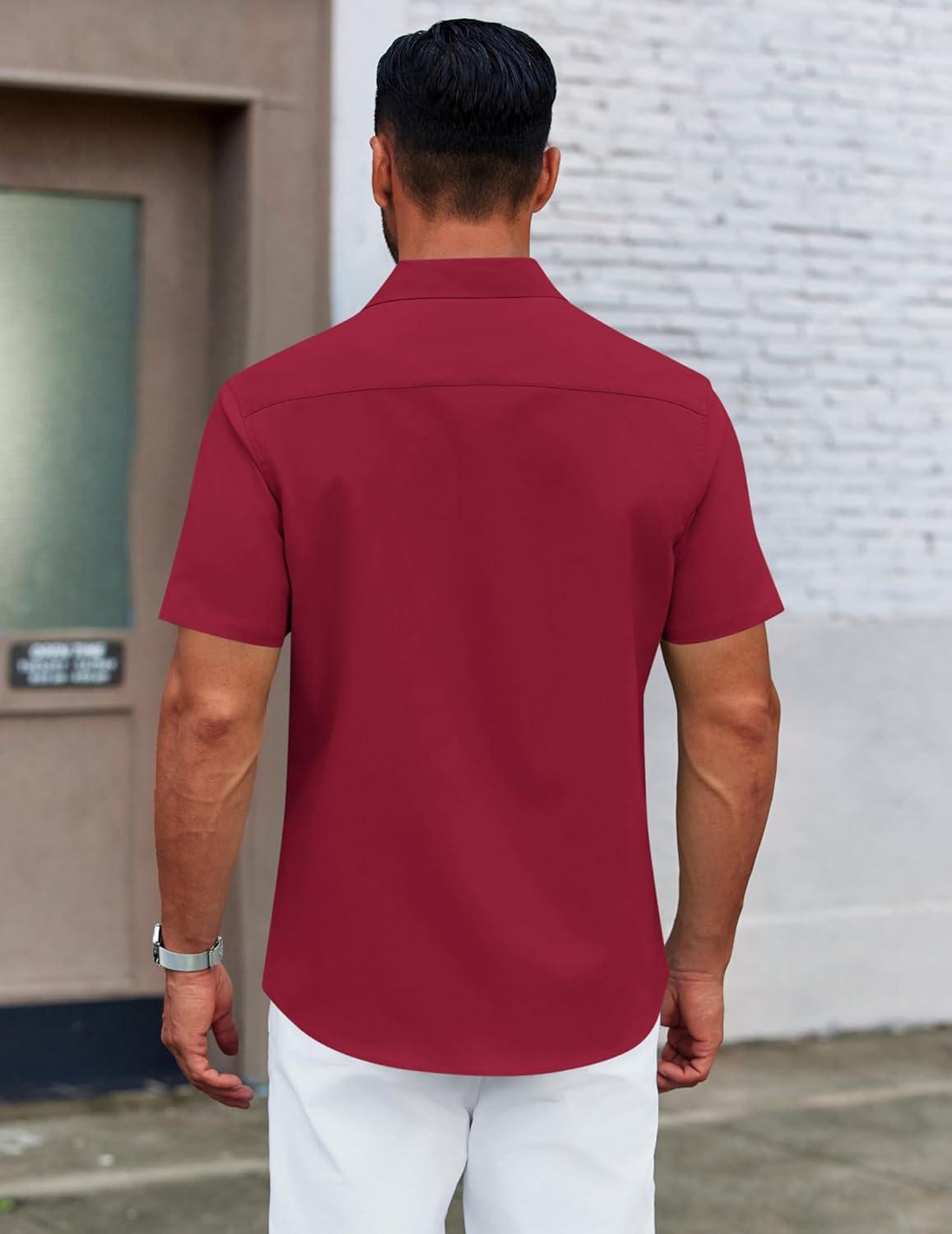 COOFANDY Men's Casual Dress Shirt Short Sleeve Button Down Shirts Summer Wedding Untucked Shirt(Carmine)