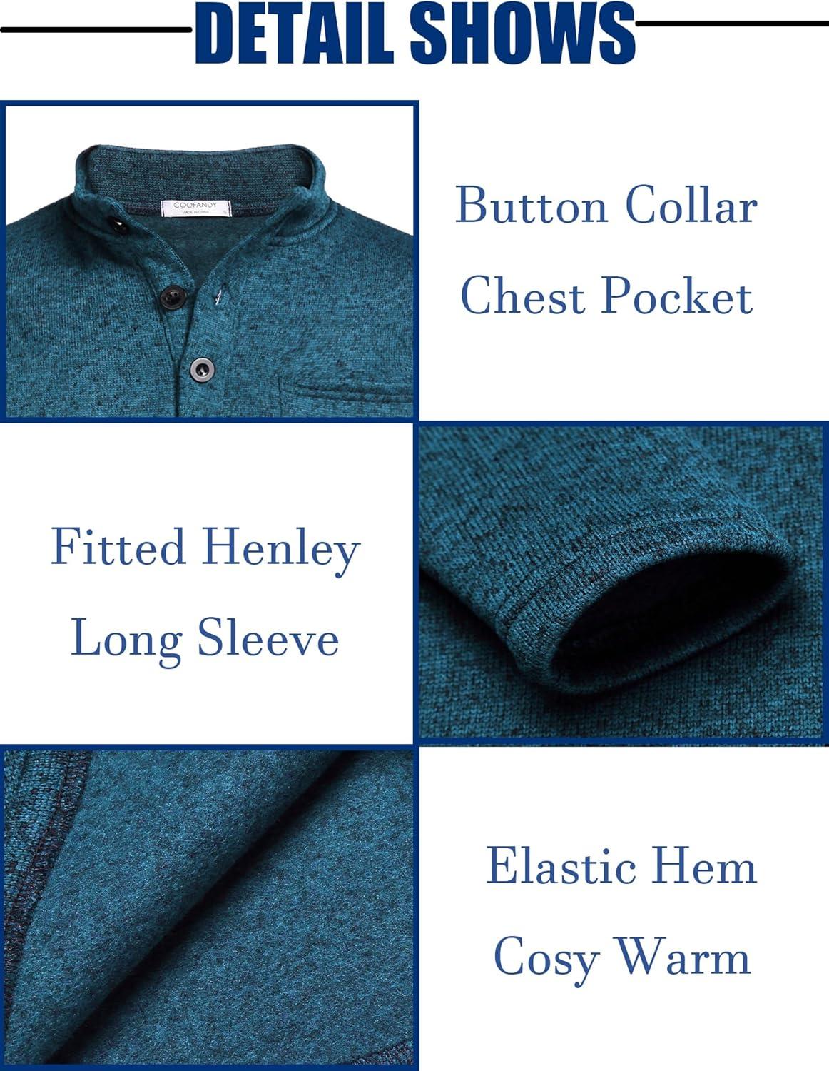 COOFANDY Men’s Casual Henley Pullover Sweatshirt Thermal Fleece Slim Fit Sweater(Dark Blue and Black)
