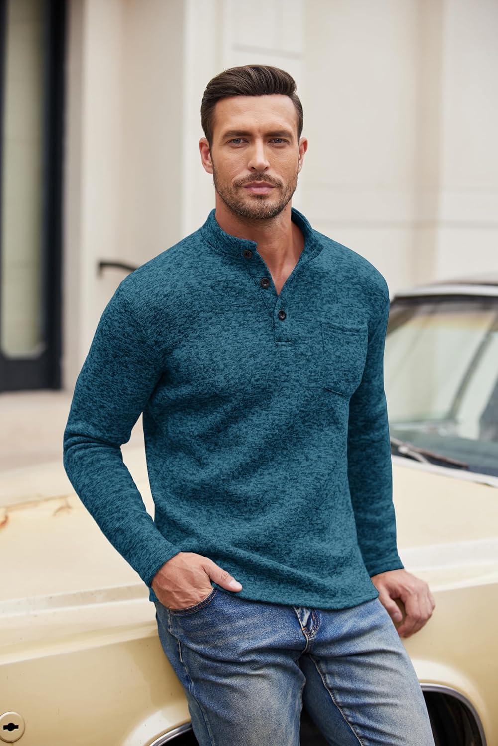 COOFANDY Men's Casual Henley Pullover Sweatshirt Thermal Fleece Slim Fit Sweater(Dark Blue and Black)