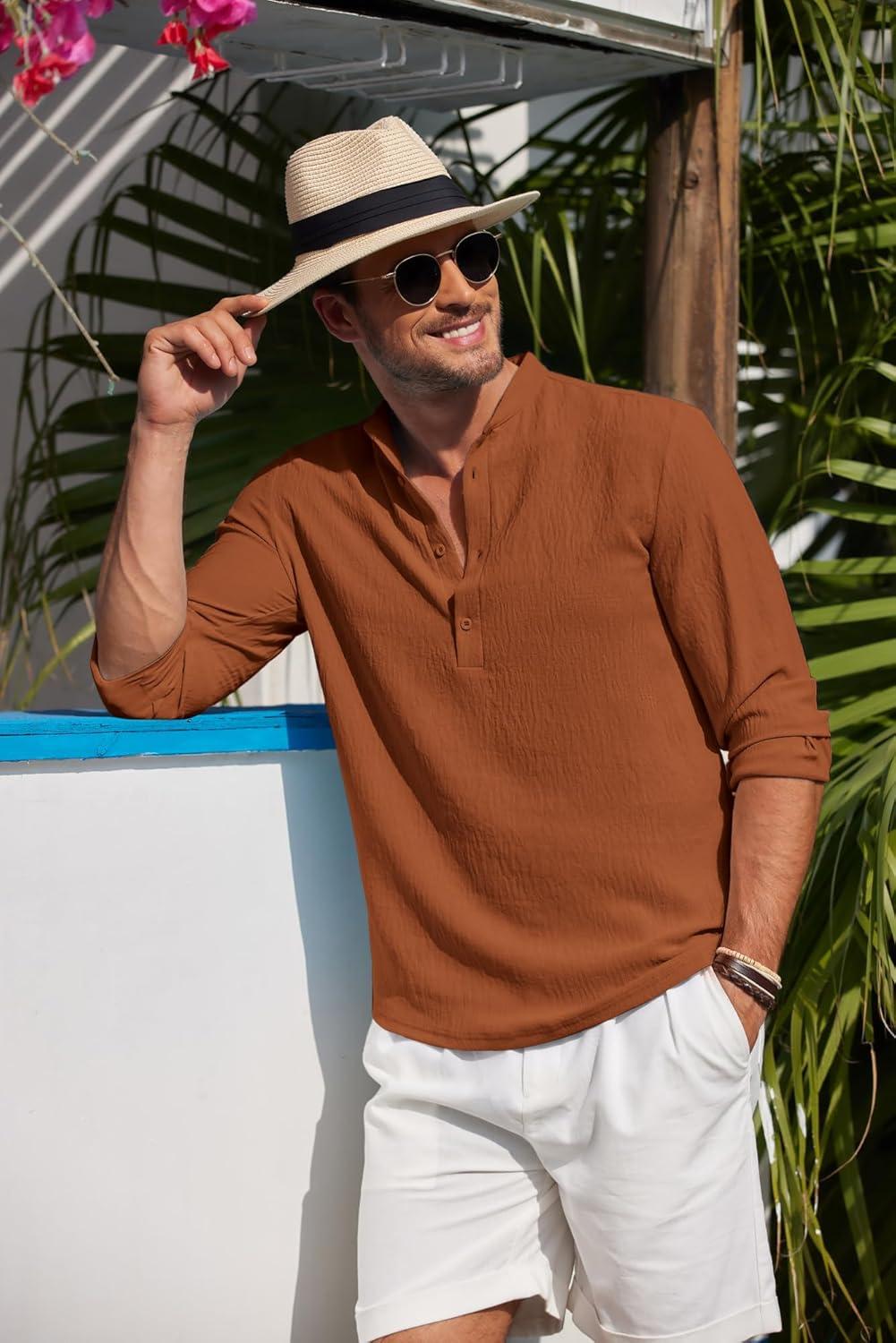 COOFANDY Men's Casual Henley Shirt Band Collar Long Sleeve Shirt Beach Hippie Summer Button T Shirt(Brown)
