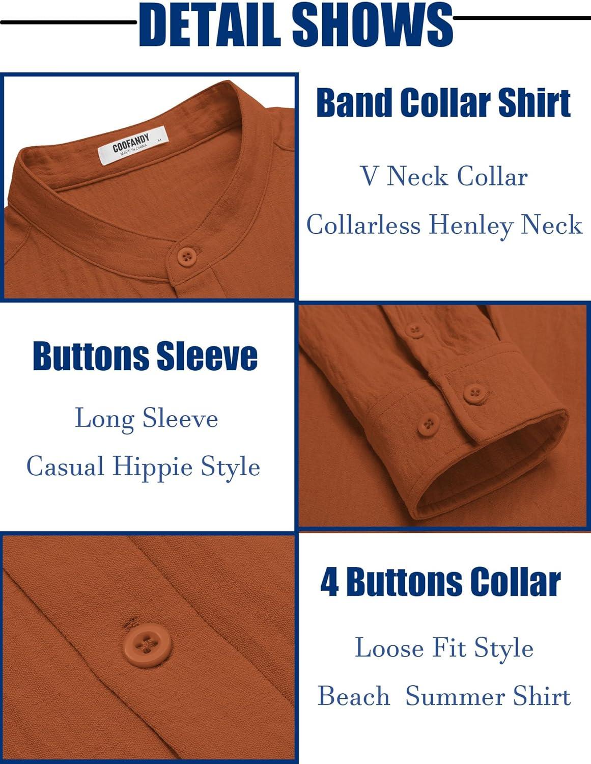 COOFANDY Men's Casual Henley Shirt Band Collar Long Sleeve Shirt Beach Hippie Summer Button T Shirt