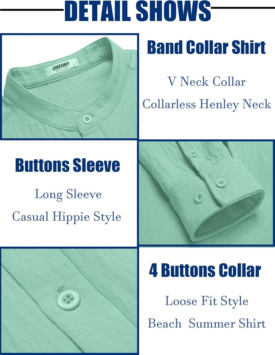 COOFANDY Men's Casual Henley Shirt Band Collar Long Sleeve Shirt Beach Hippie Summer Button T Shirt