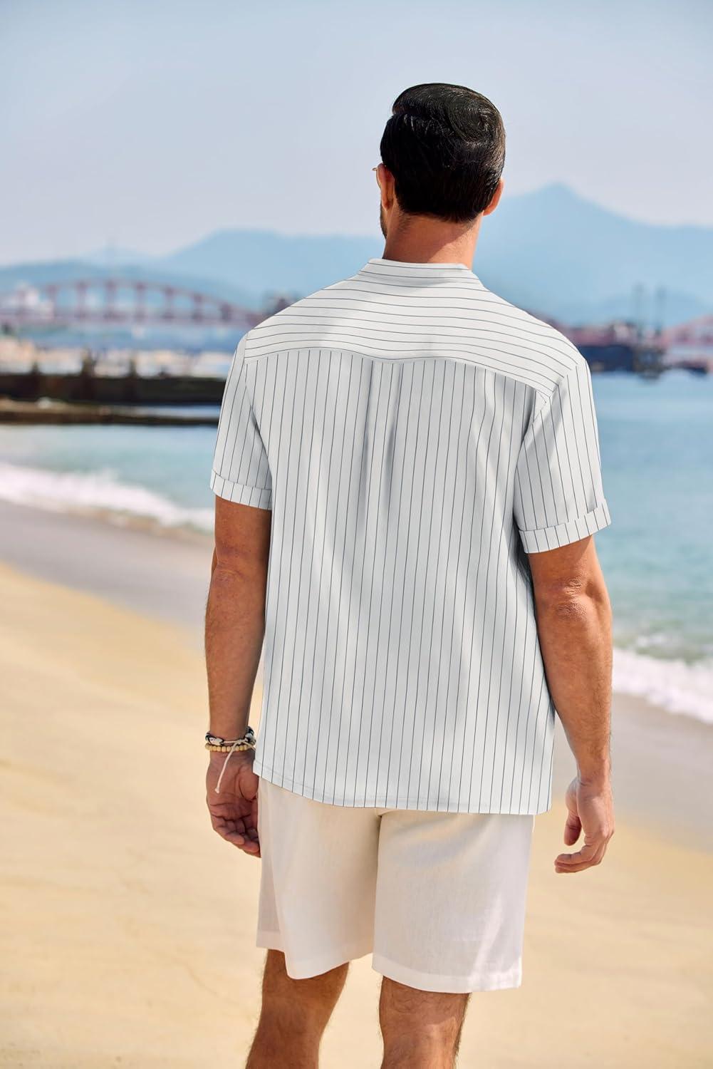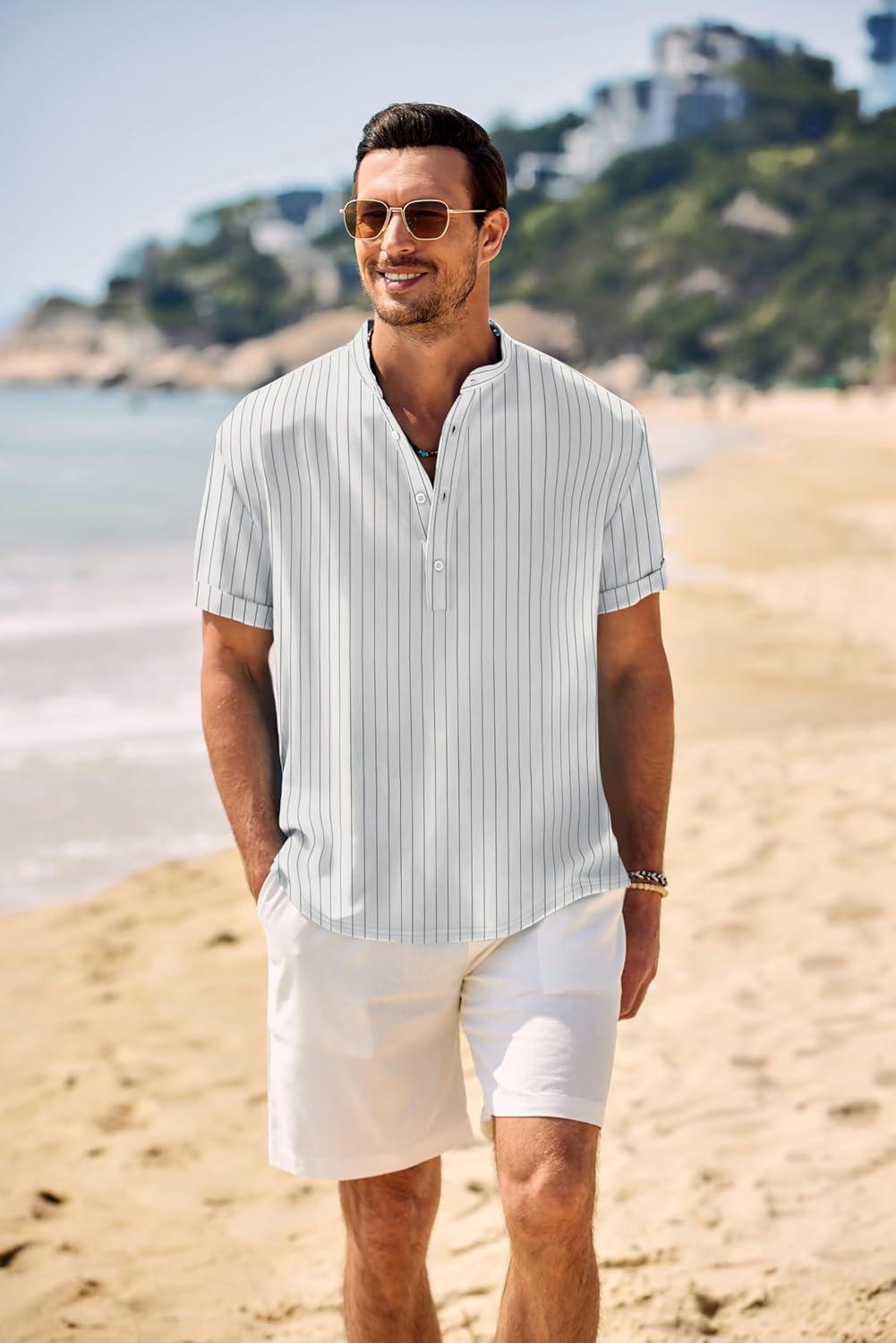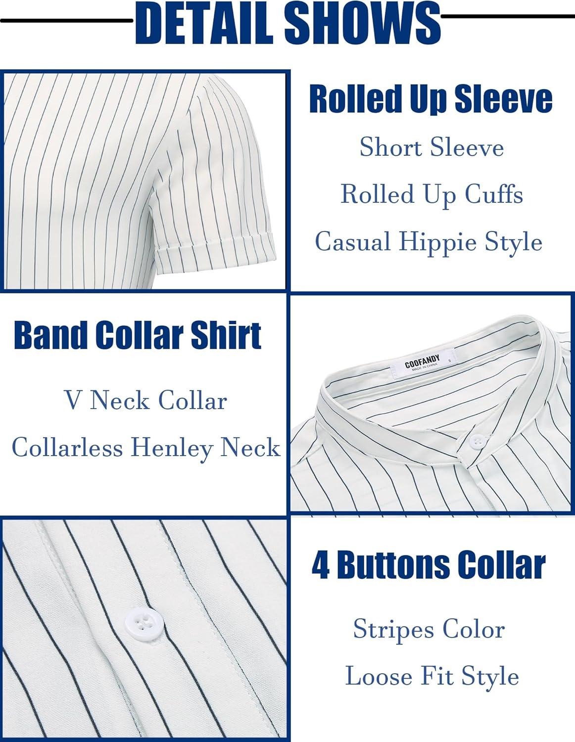 COOFANDY Men’s Casual Henley Shirt Band Collar Short Sleeve Shirt Summer Beach Hippie T-Shirt(White Stripes on Blue)