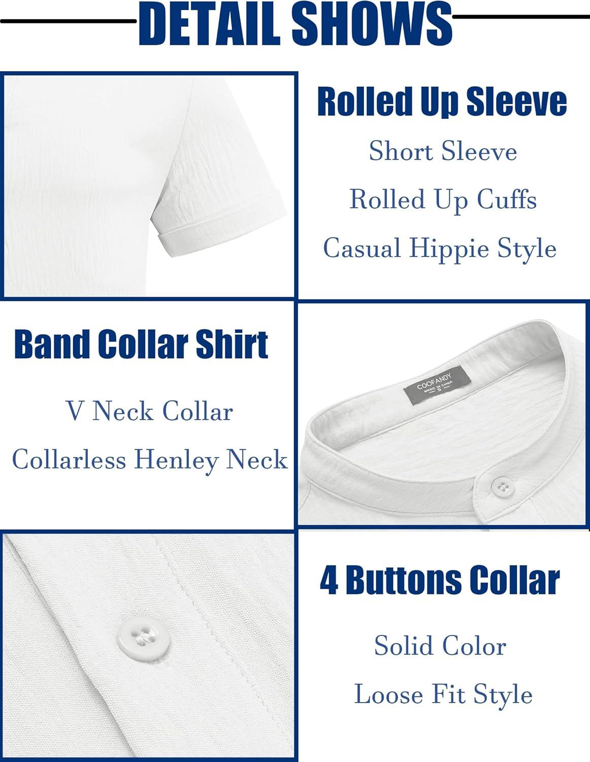 COOFANDY Men’s Casual Henley Shirt Band Collar Short Sleeve Shirt Summer Beach Hippie T-Shirt(White)