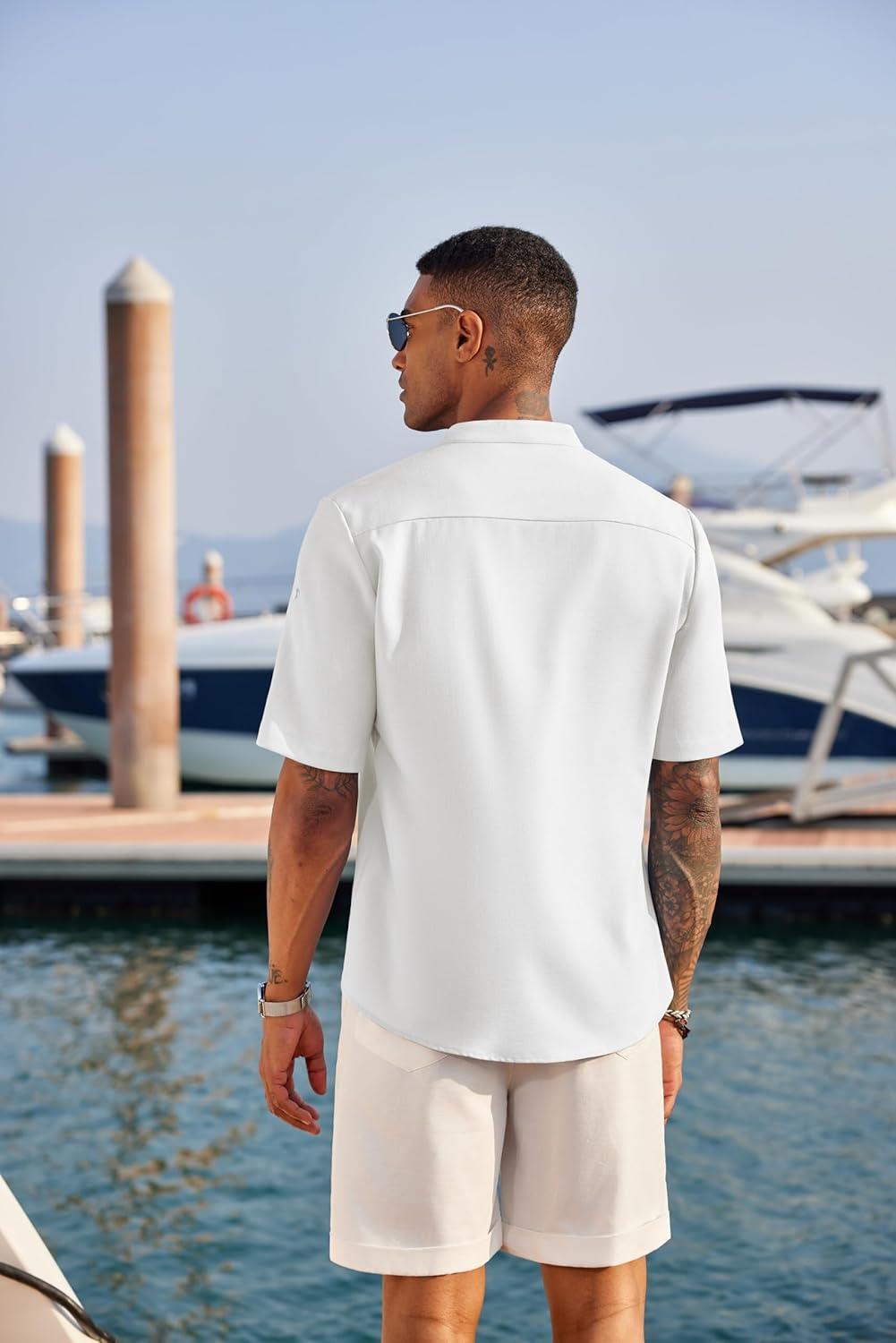 COOFANDY Men’s Casual Henley Shirt Short Sleeve Band Collar Linen Shirt Summer Beach Hippie T-Shirts(A-white)