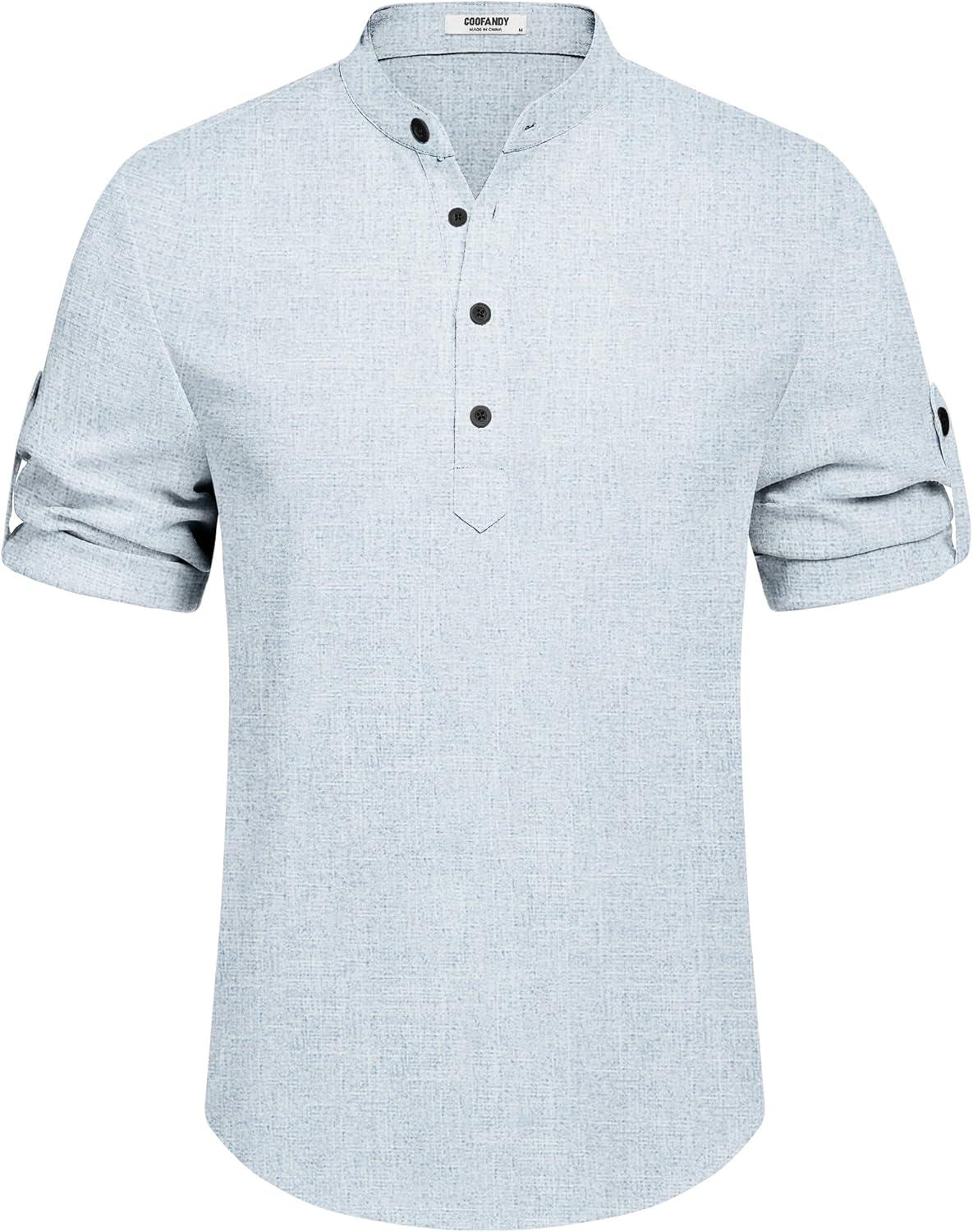 COOFANDY Men's Casual Henley Shirt Short Sleeve Band Collar Linen Shirt Summer Beach Hippie T-Shirts(Flecking Light Blue)