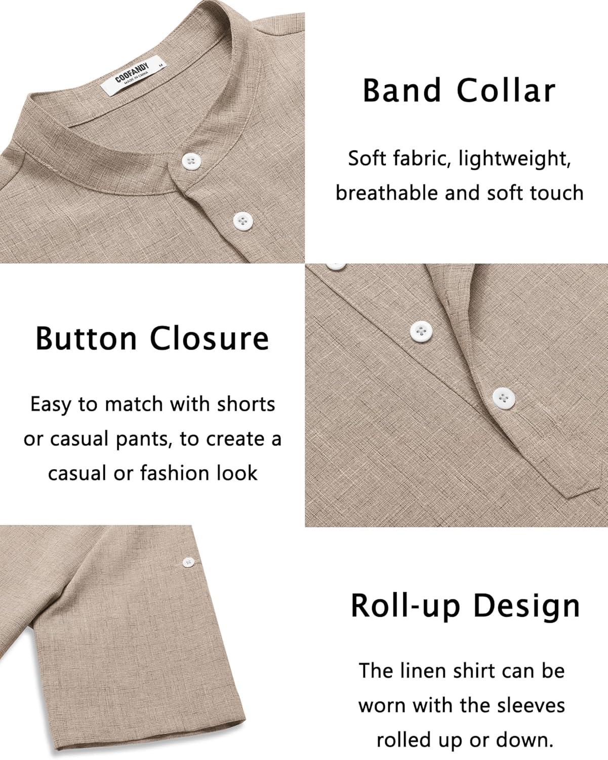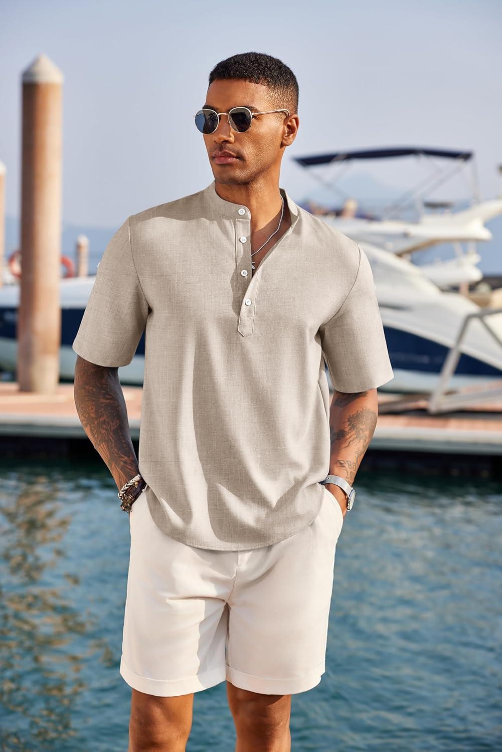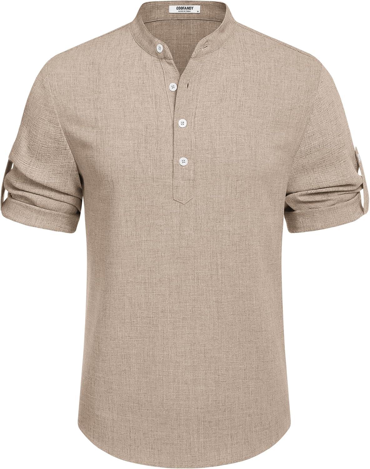 COOFANDY Men's Casual Henley Shirt Short Sleeve Band Collar Linen Shirt Summer Beach Hippie T-Shirts(Khaki)
