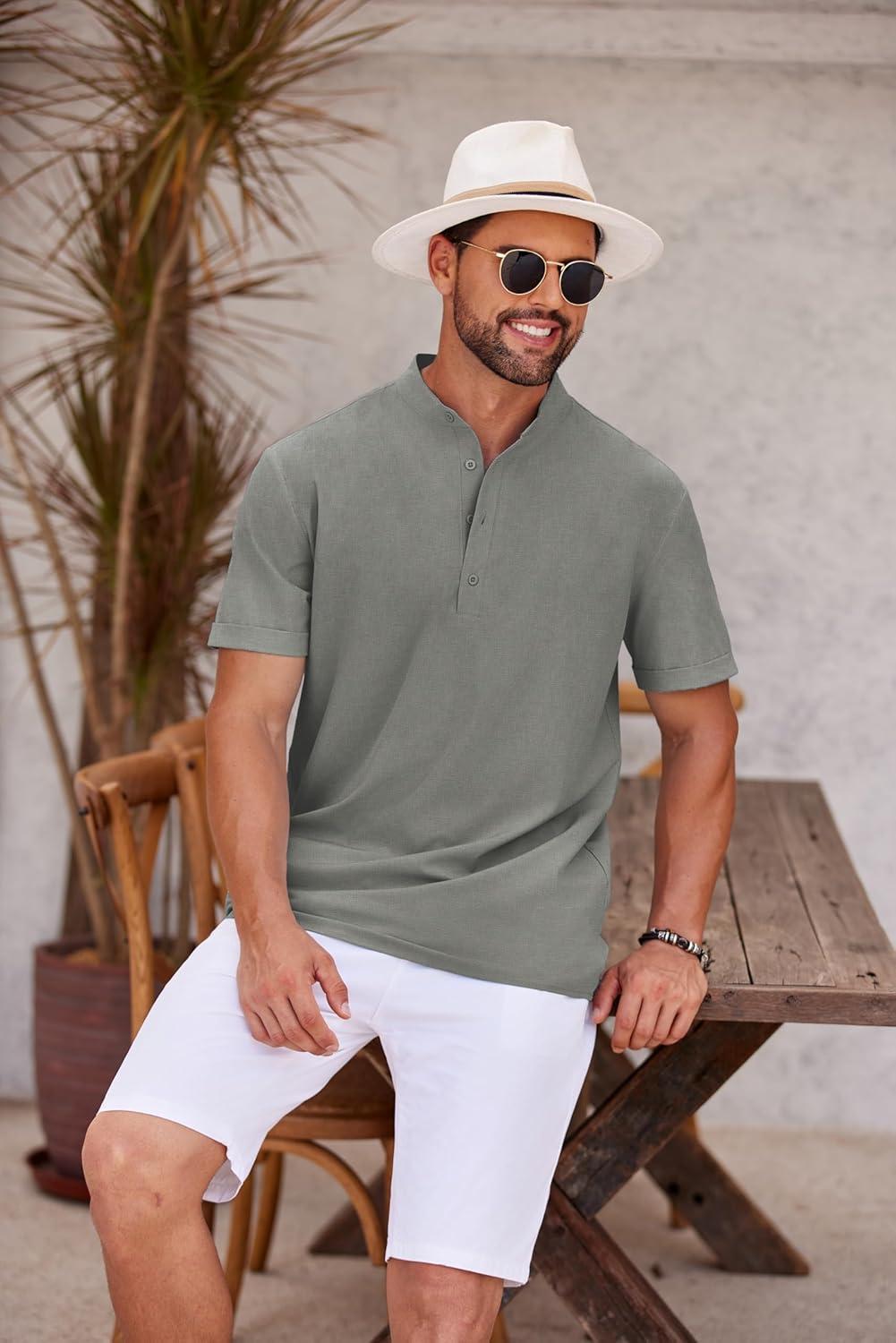 COOFANDY Men’s Casual Henley Shirt Short Sleeve Band Collar Shirt Summer Beach Hippie Vacation T Shirt with Button(Light Green)