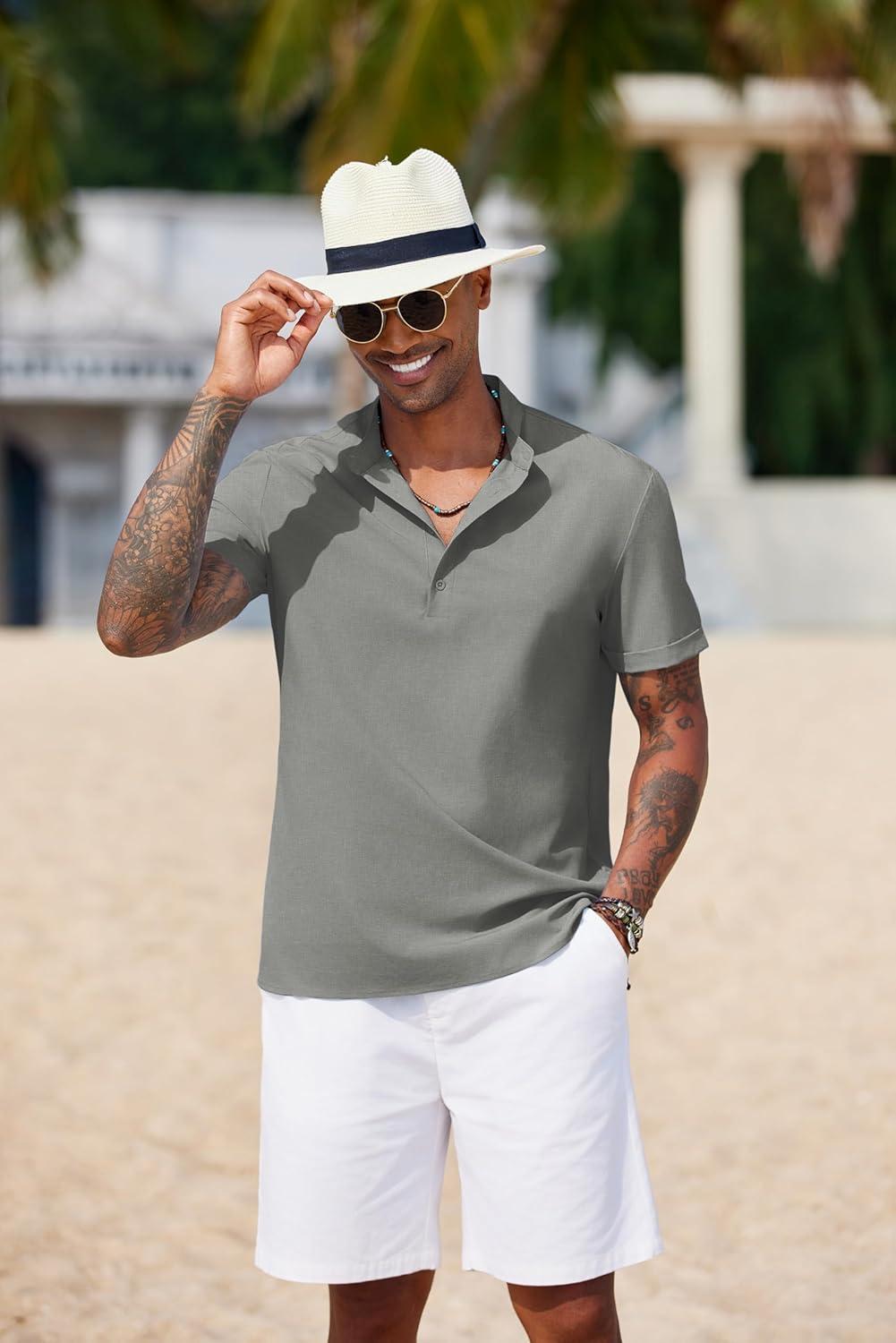 COOFANDY Men's Casual Henley Shirt Short Sleeve Band Collar Shirt Summer Beach Hippie Vacation T Shirt with Button(Dark Grey)