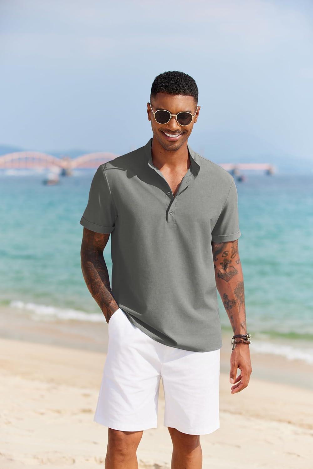COOFANDY Men’s Casual Henley Shirt Short Sleeve Band Collar Shirt Summer Beach Hippie Vacation T Shirt with Button(Dark Grey)