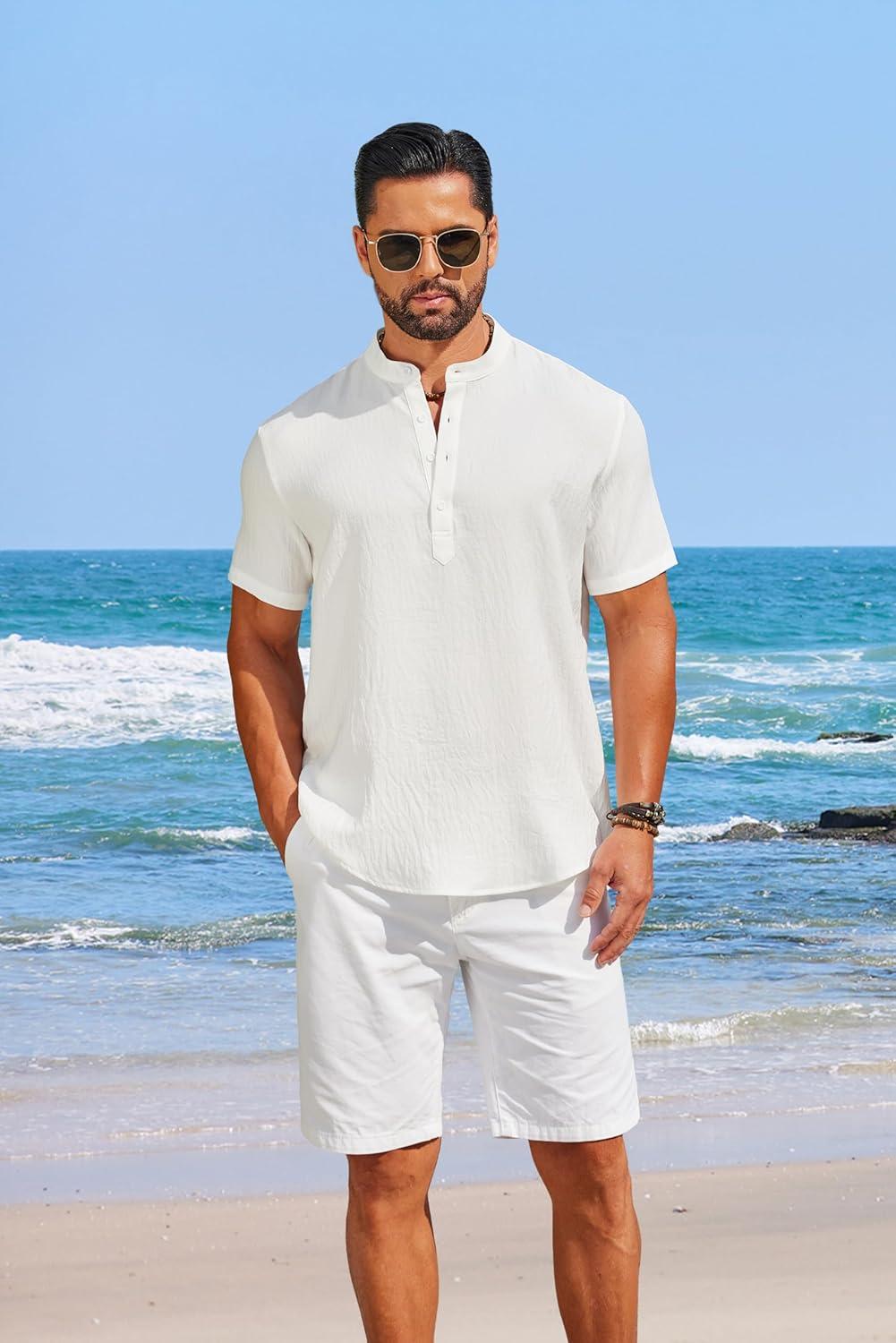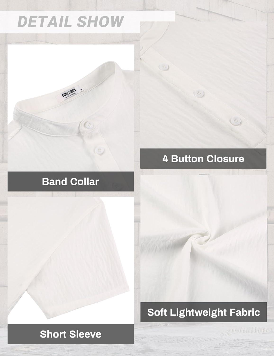 COOFANDY Men's Casual Henley Shirt Short Sleeve Linen Shirt Band Collar Summer Hippie Beach T-Shirts(01-white)