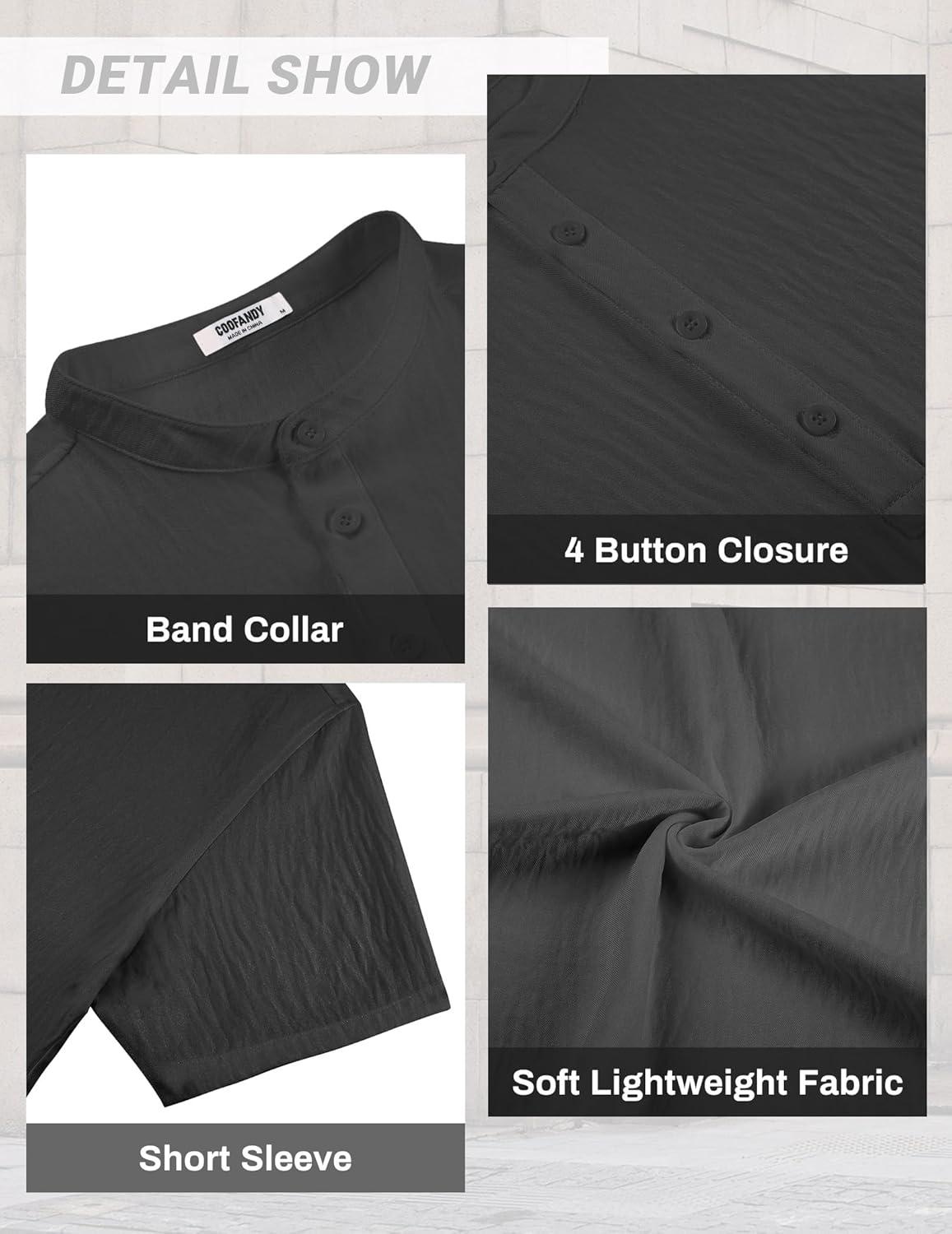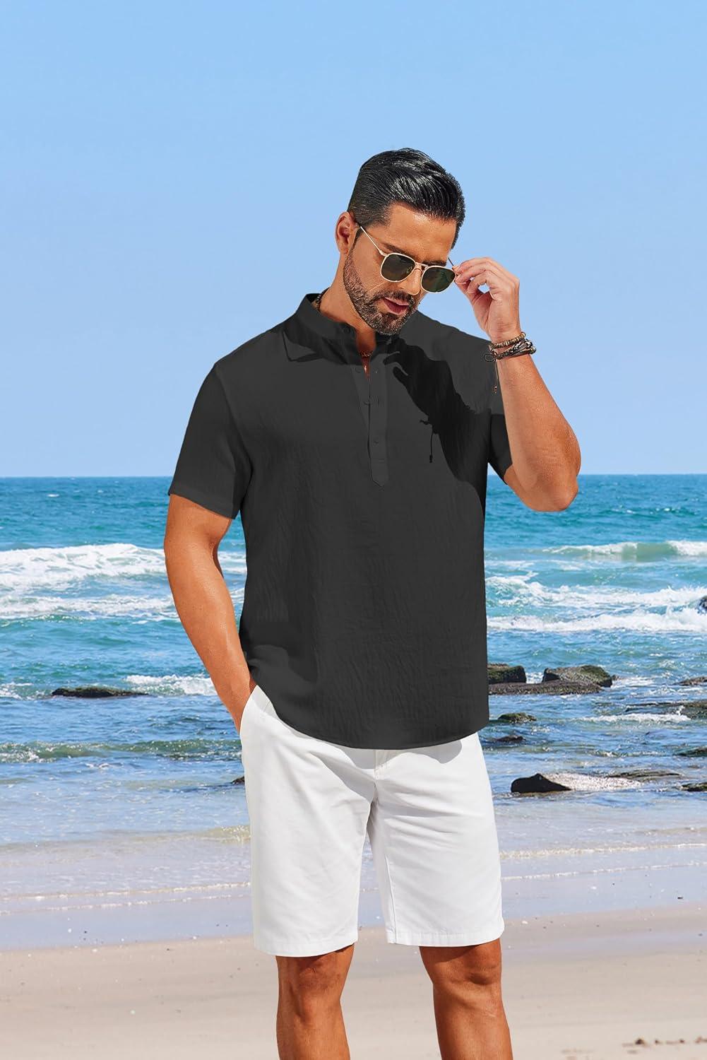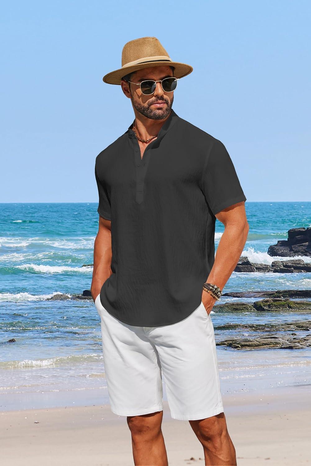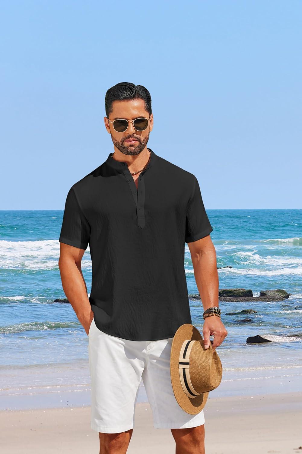 COOFANDY Men's Casual Henley Shirt Short Sleeve Linen Shirt Band Collar Summer Hippie Beach T-Shirts(Black)