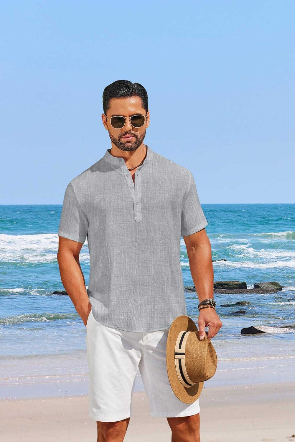 COOFANDY Men’s Casual Henley Shirt Short Sleeve Linen Shirt Band Collar Summer Hippie Beach T-Shirts(Grey)