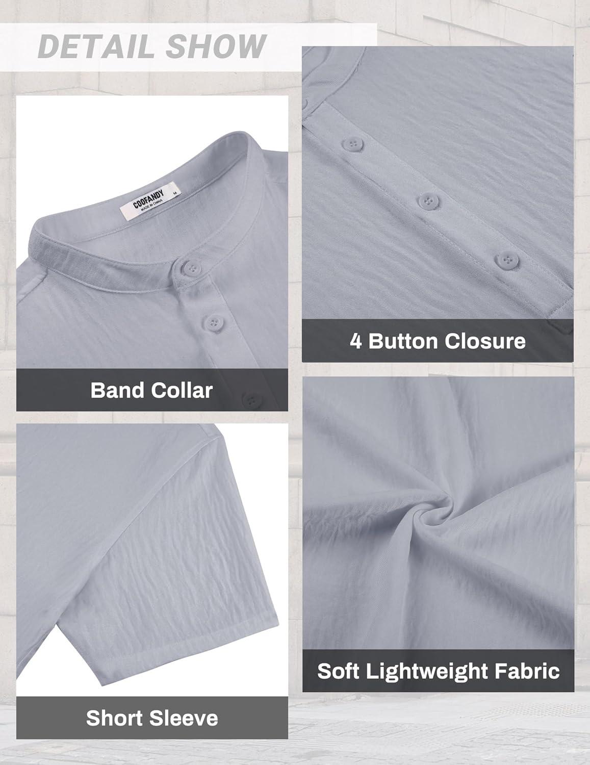 COOFANDY Men's Casual Henley Shirt Short Sleeve Linen Shirt Band Collar Summer Hippie Beach T-Shirts(Grey)