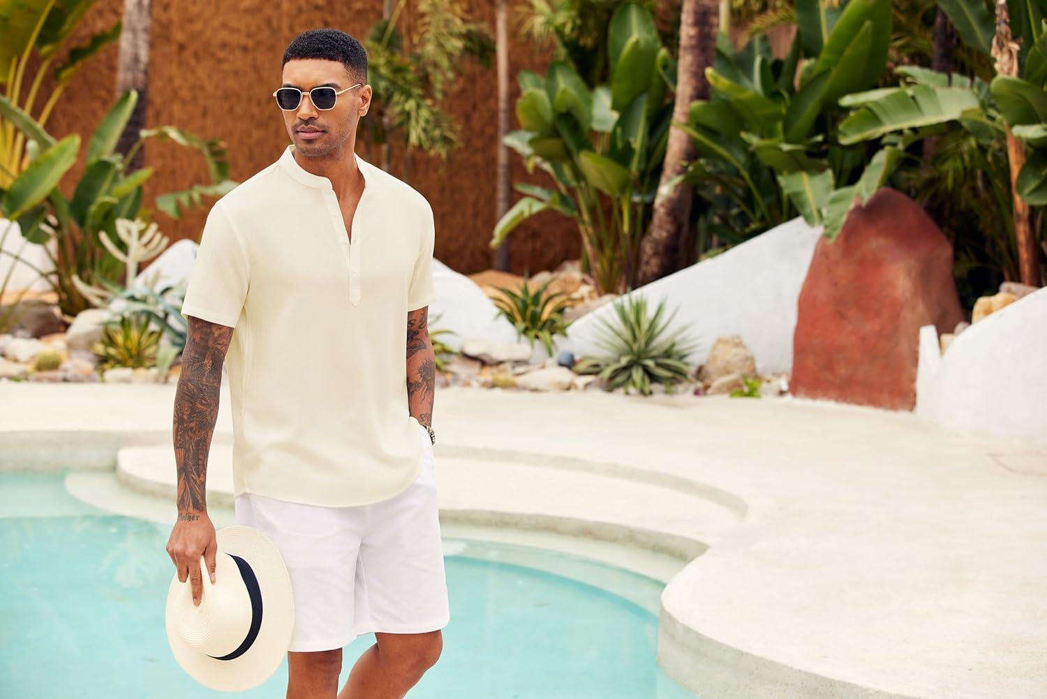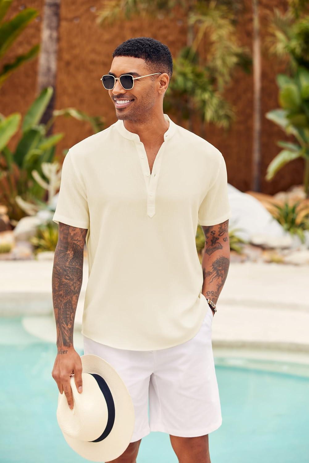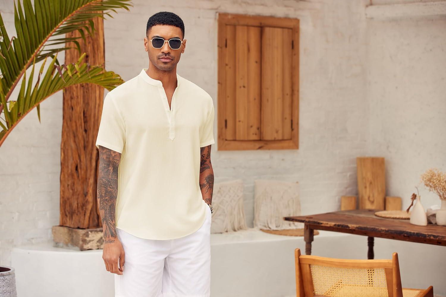 COOFANDY Men’s Casual Henley Shirt Short Sleeve Summer Shirts Linen Band Collar Summer Beach Hippie T-Shirts(Beige)