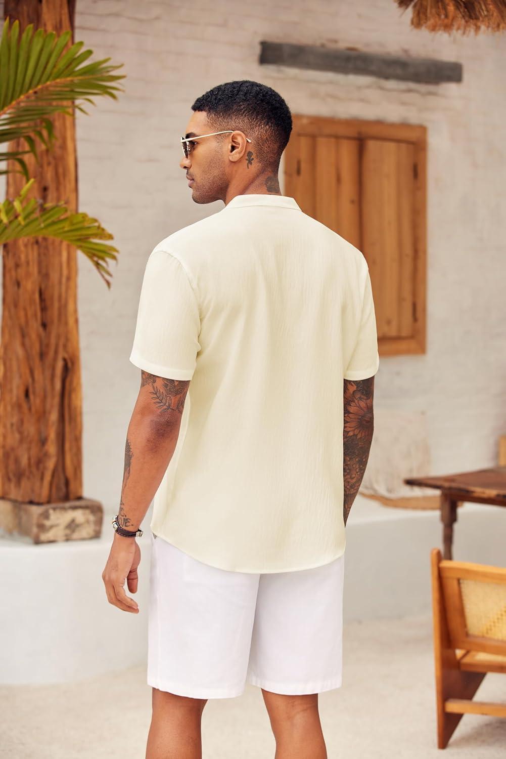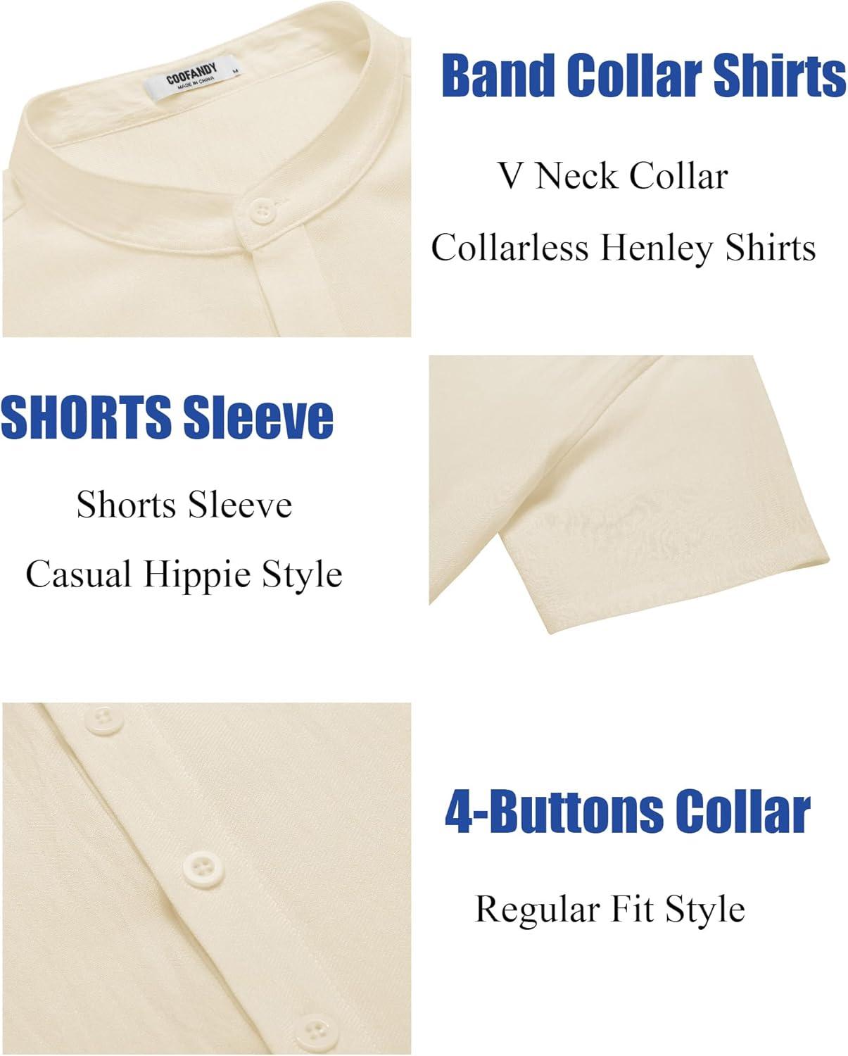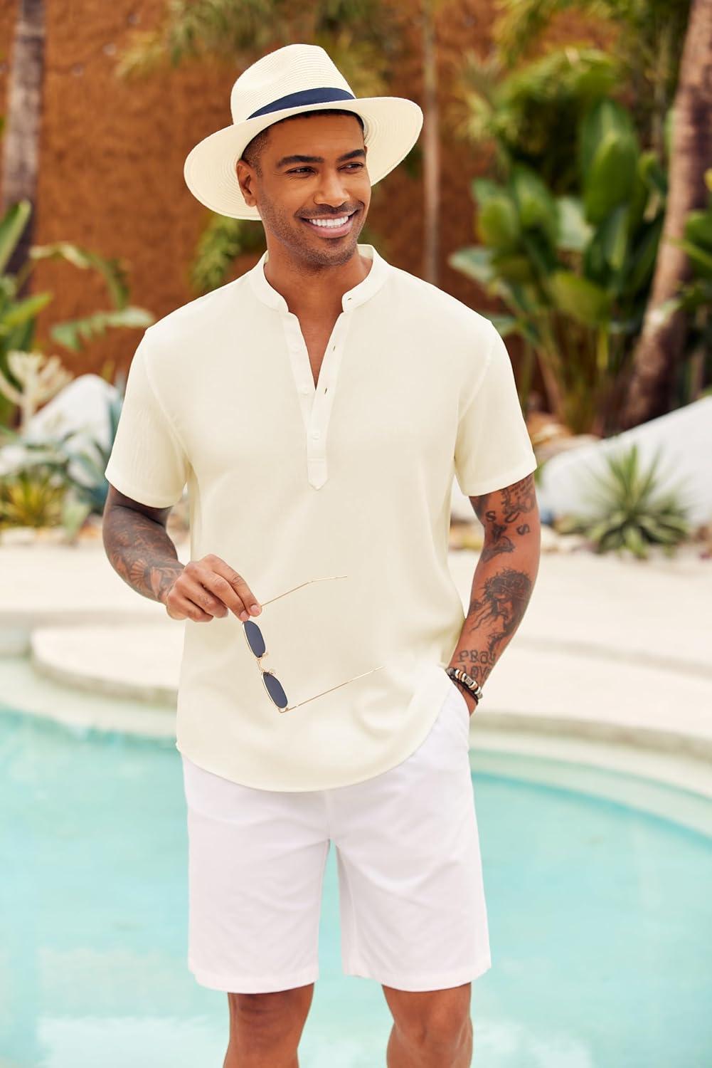 COOFANDY Men’s Casual Henley Shirt Short Sleeve Summer Shirts Linen Band Collar Summer Beach Hippie T-Shirts(01-white)