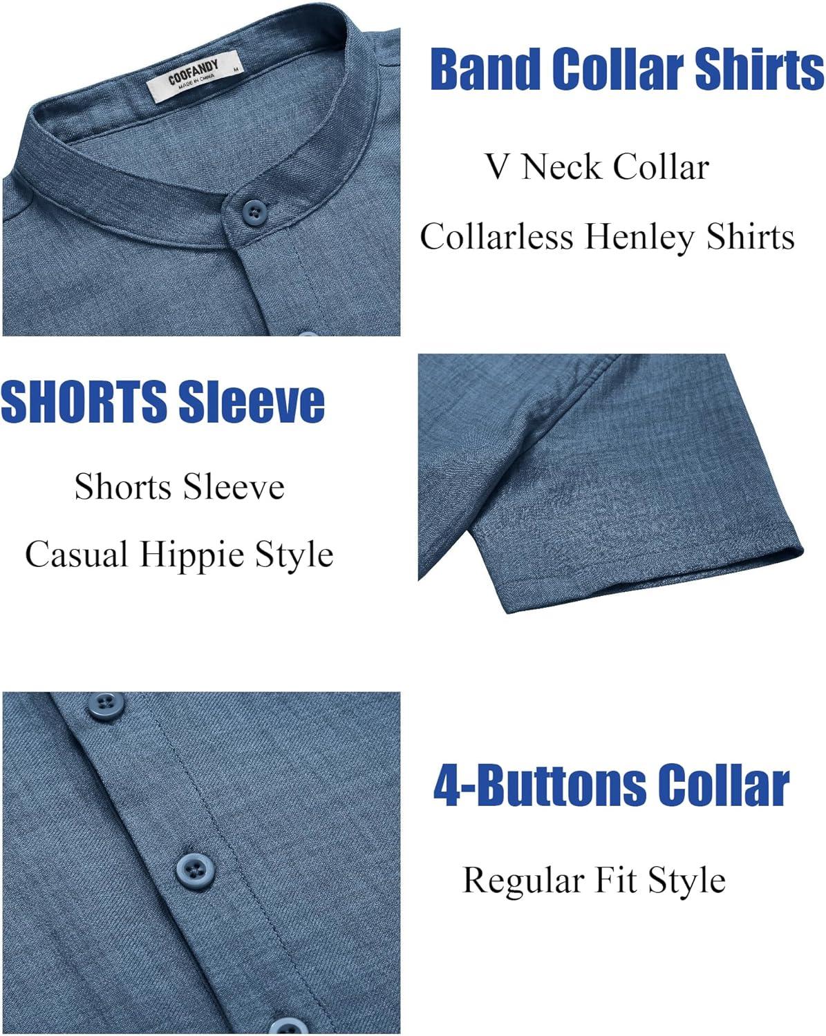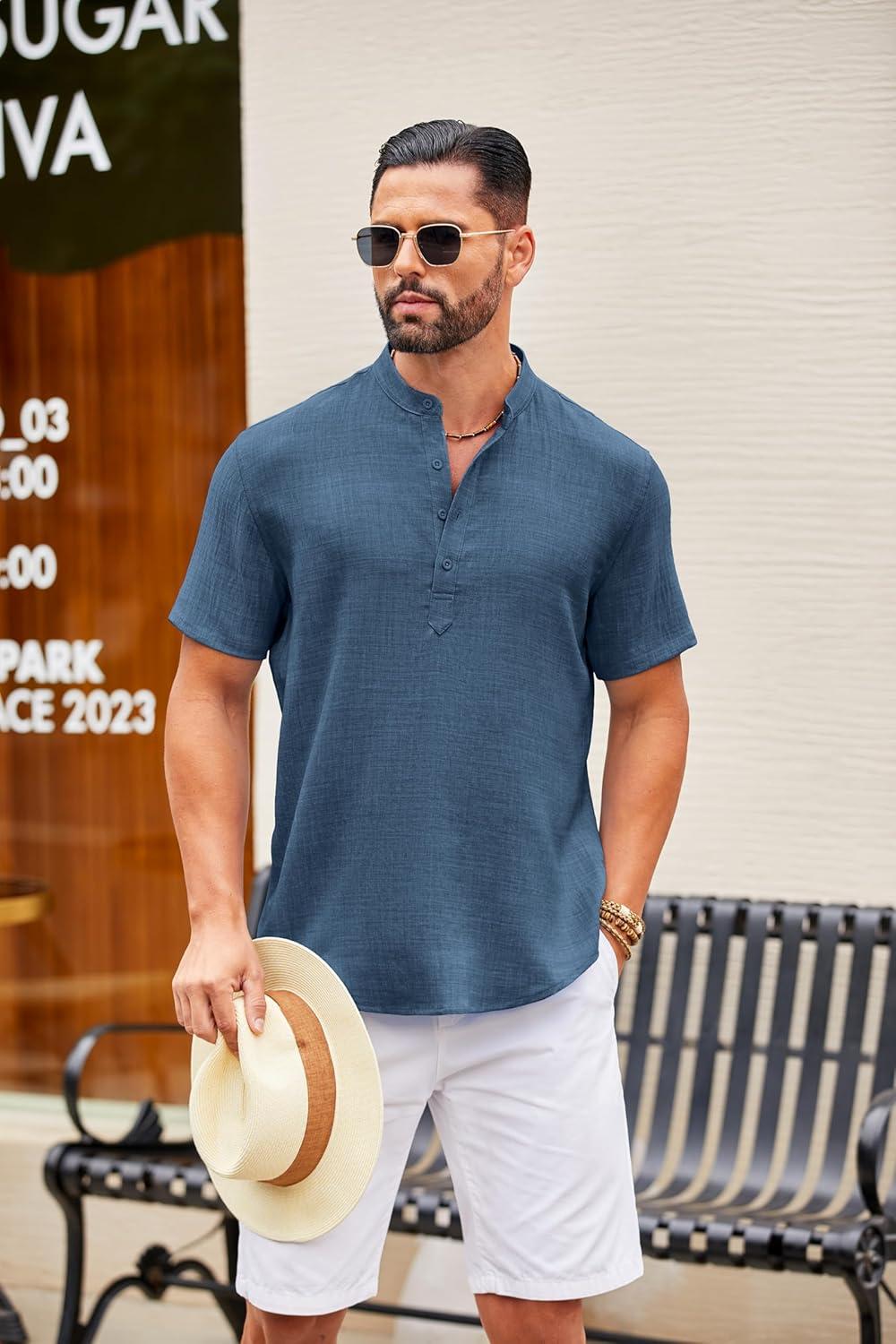 COOFANDY Men's Casual Henley Shirt Short Sleeve Summer Shirts Linen Band Collar Summer Beach Hippie T-Shirts(Dark Blue)