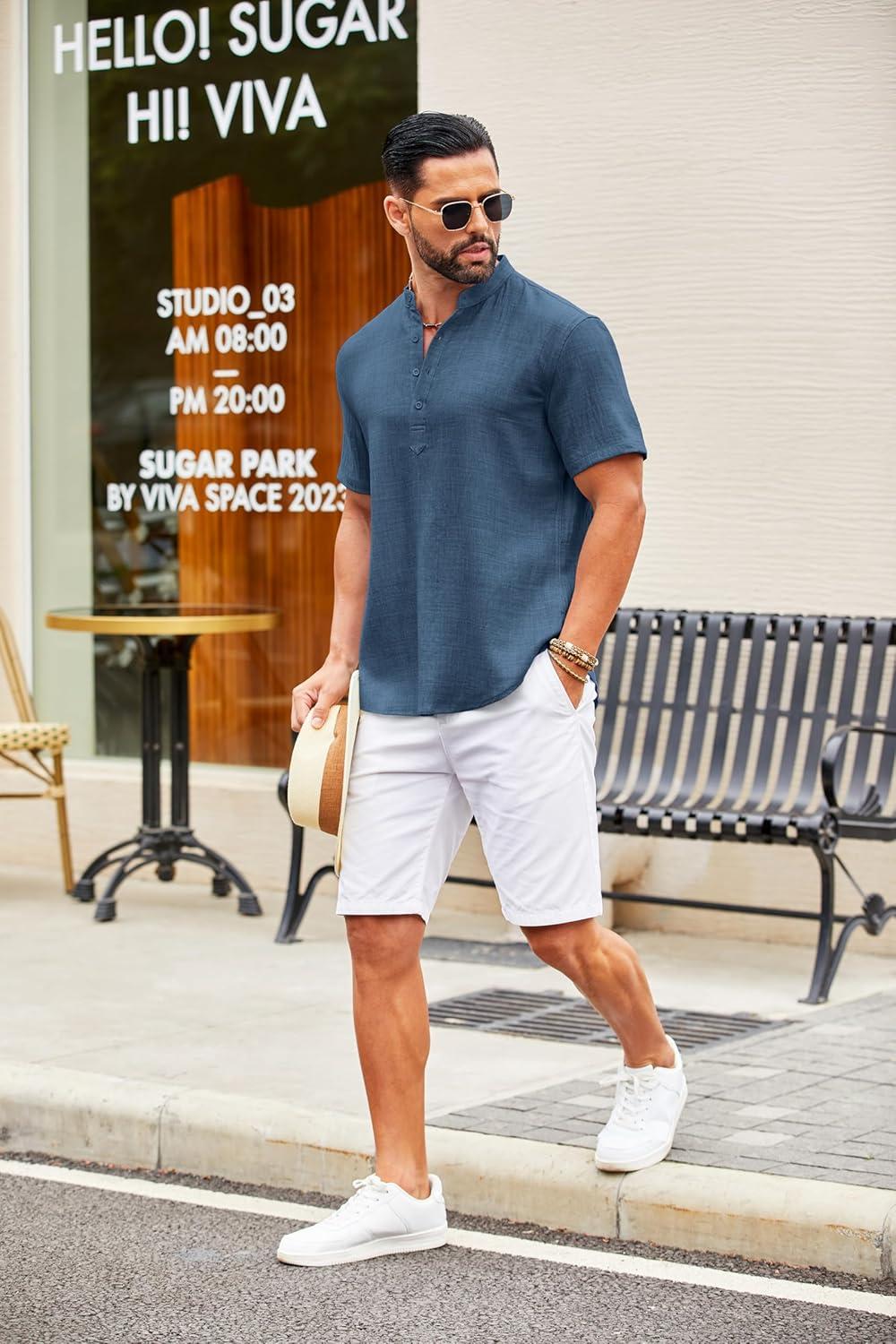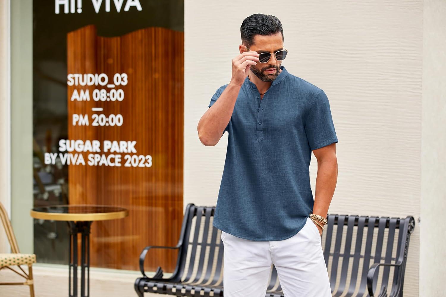 COOFANDY Men’s Casual Henley Shirt Short Sleeve Summer Shirts Linen Band Collar Summer Beach Hippie T-Shirts(Dark Blue)