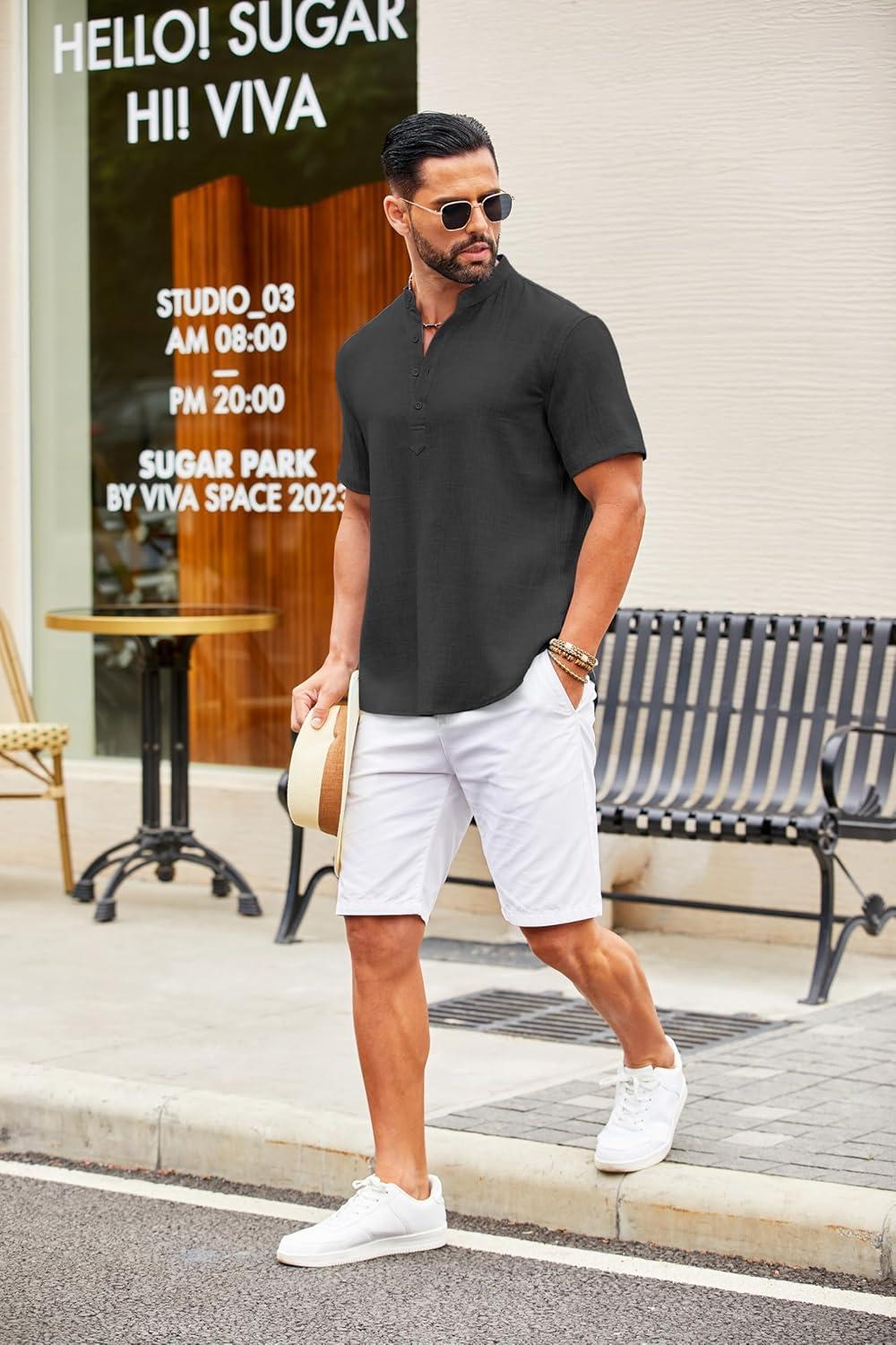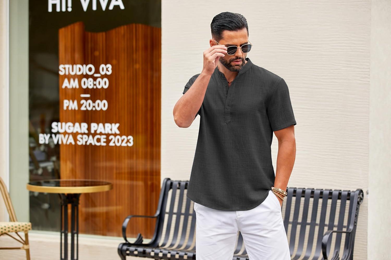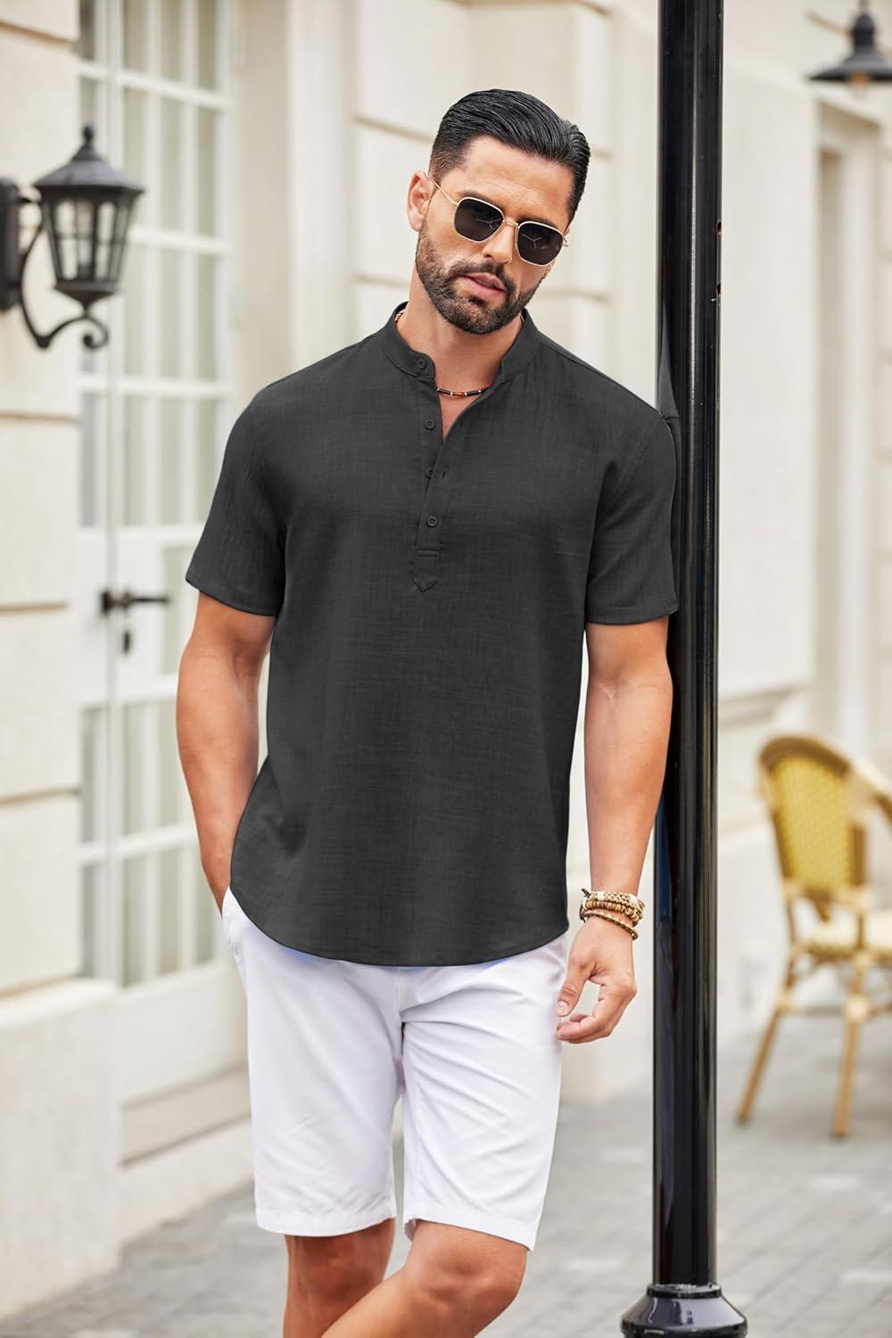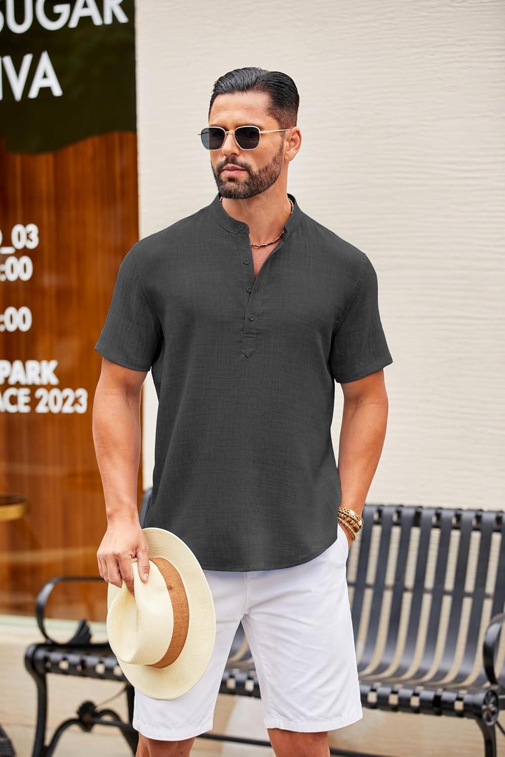 COOFANDY Men’s Casual Henley Shirt Short Sleeve Summer Shirts Linen Band Collar Summer Beach Hippie T-Shirts(Dark Grey)