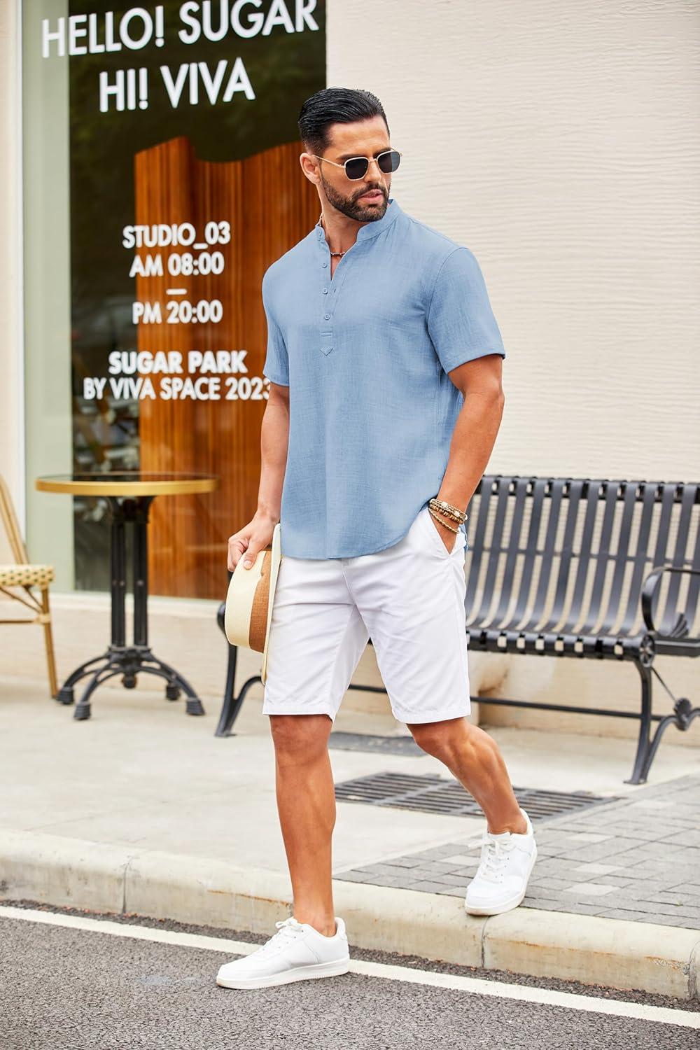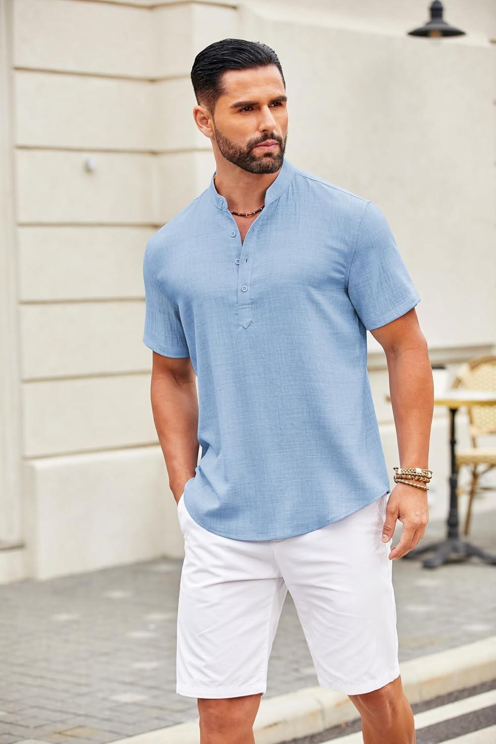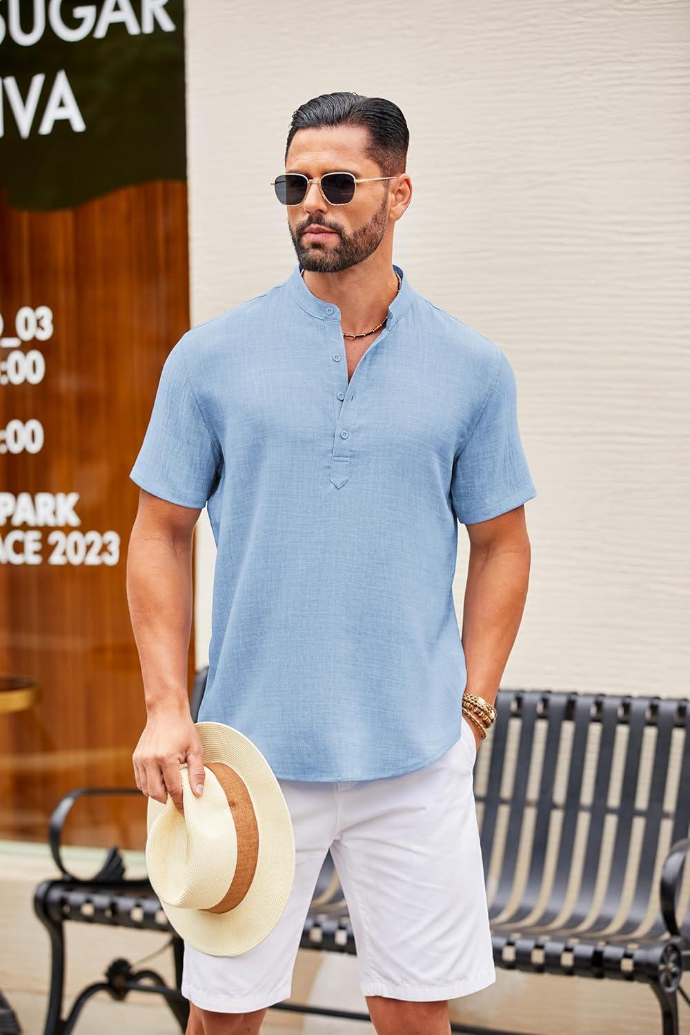 COOFANDY Men’s Casual Henley Shirt Short Sleeve Summer Shirts Linen Band Collar Summer Beach Hippie T-Shirts(Light Blue)