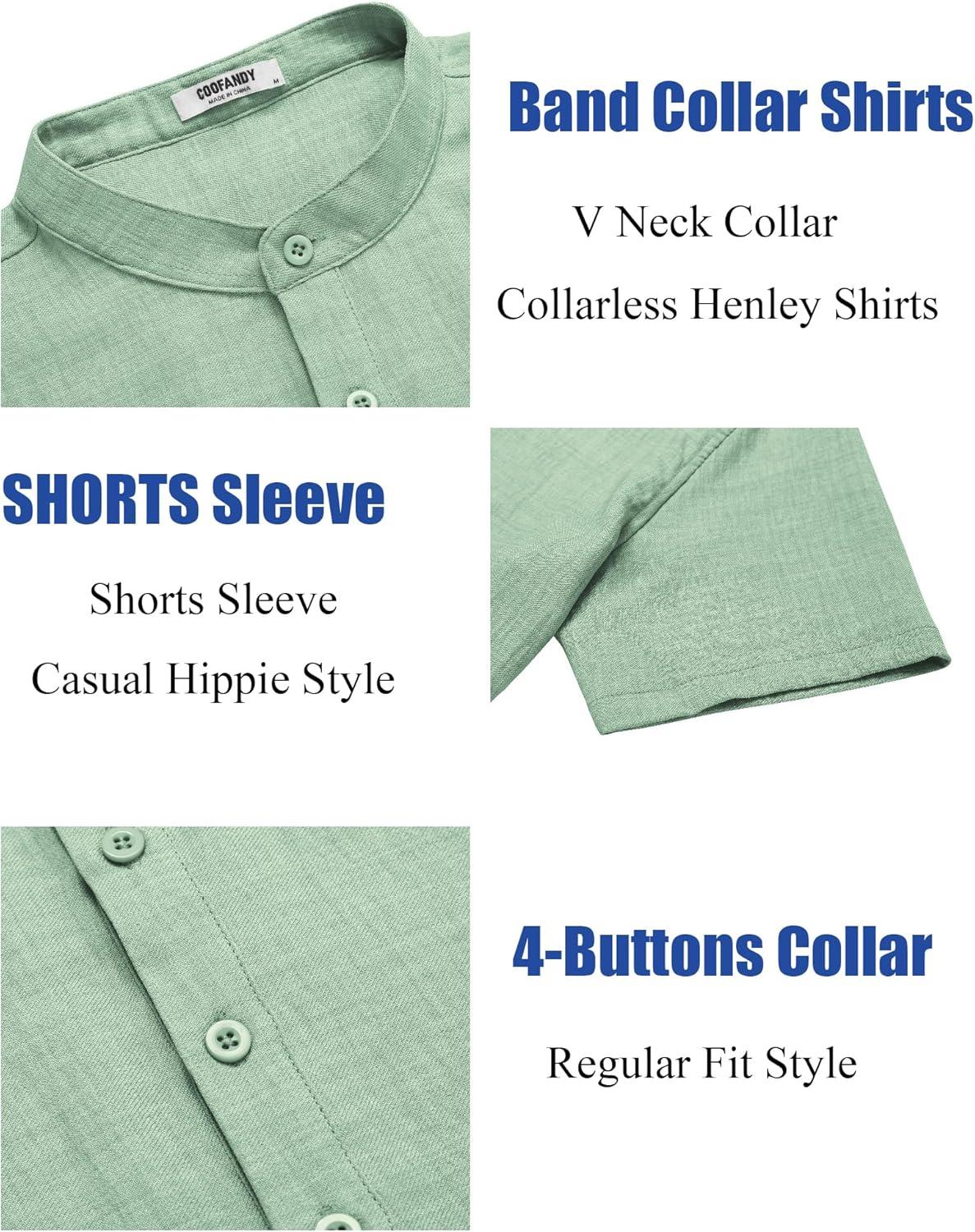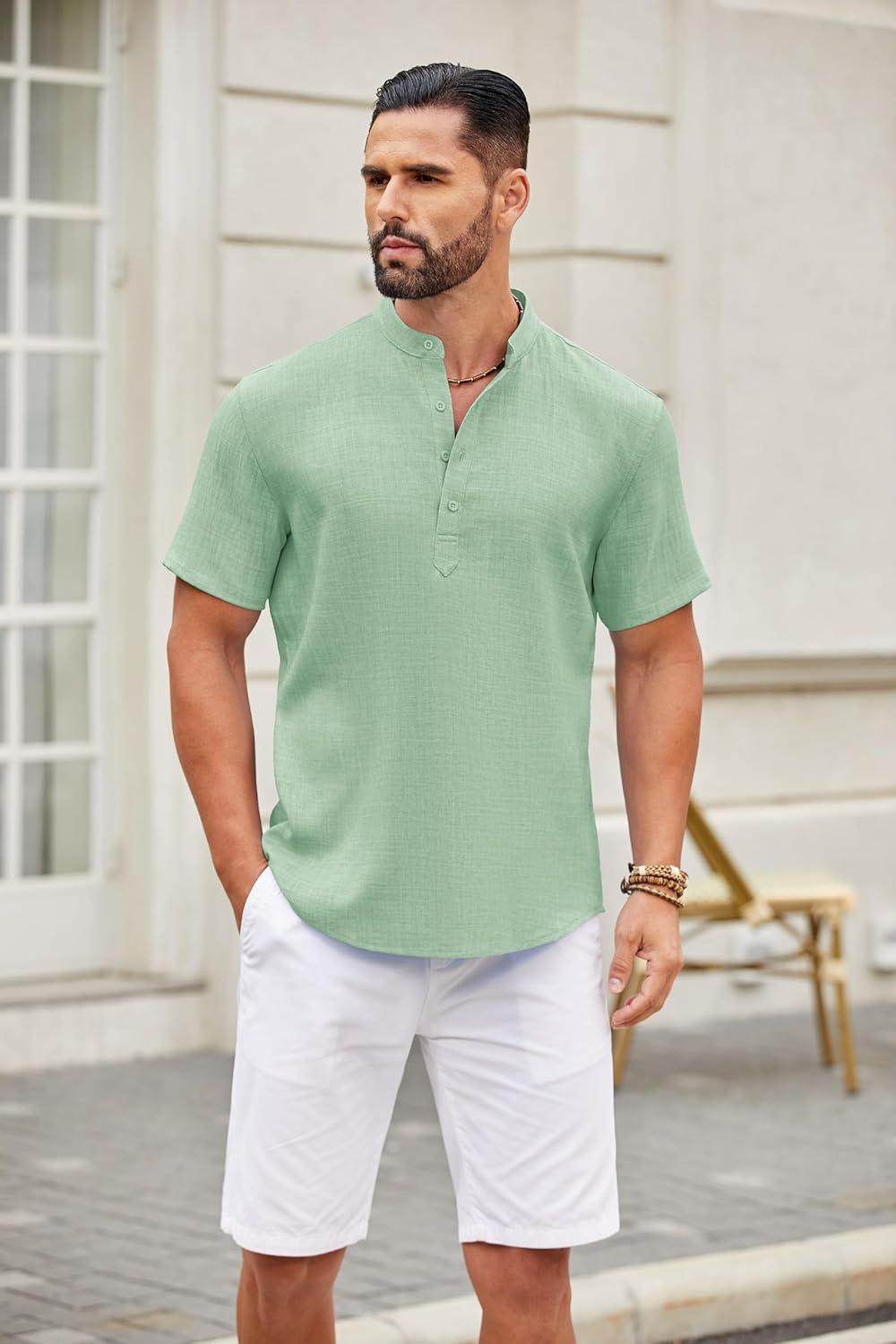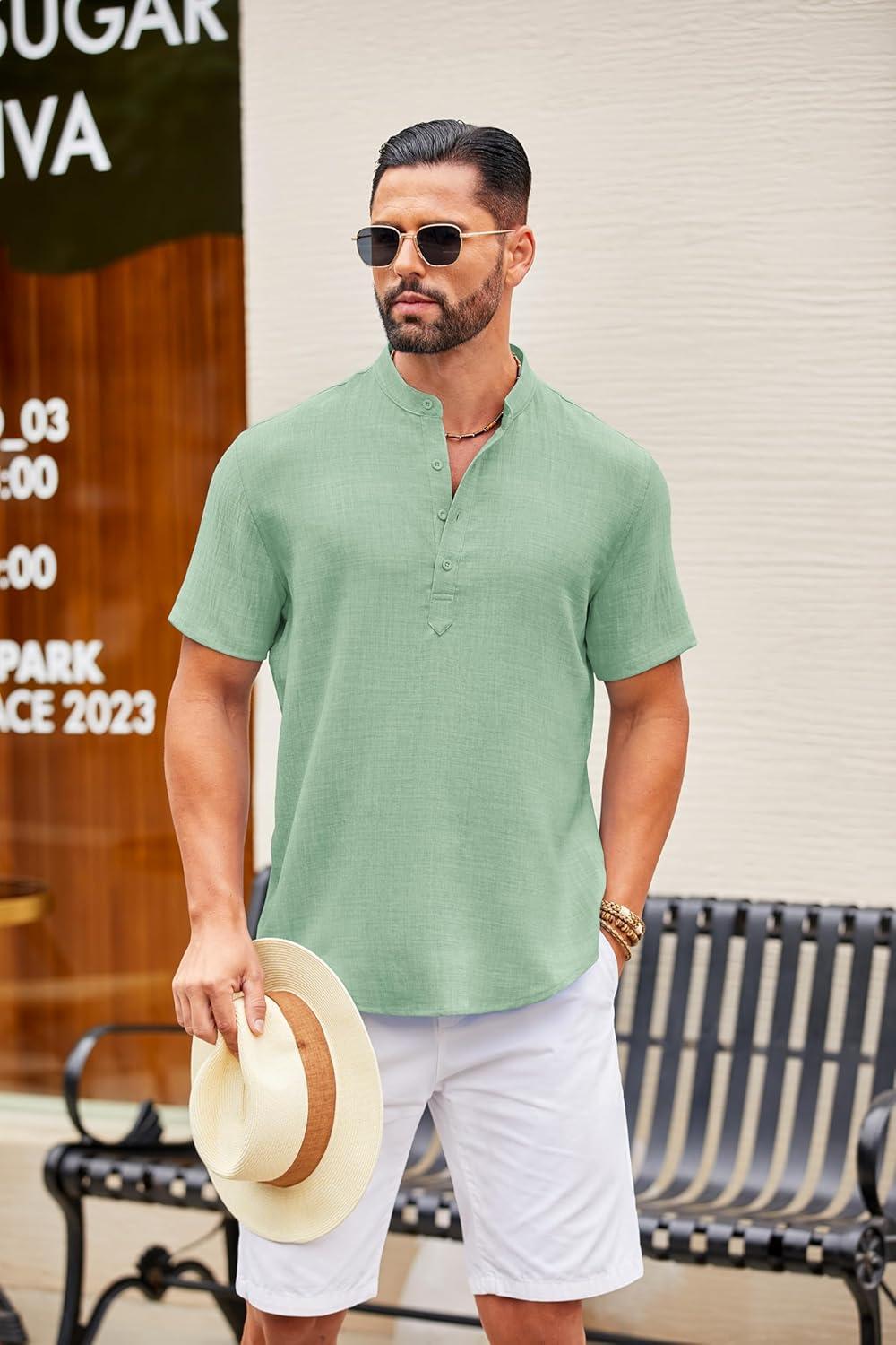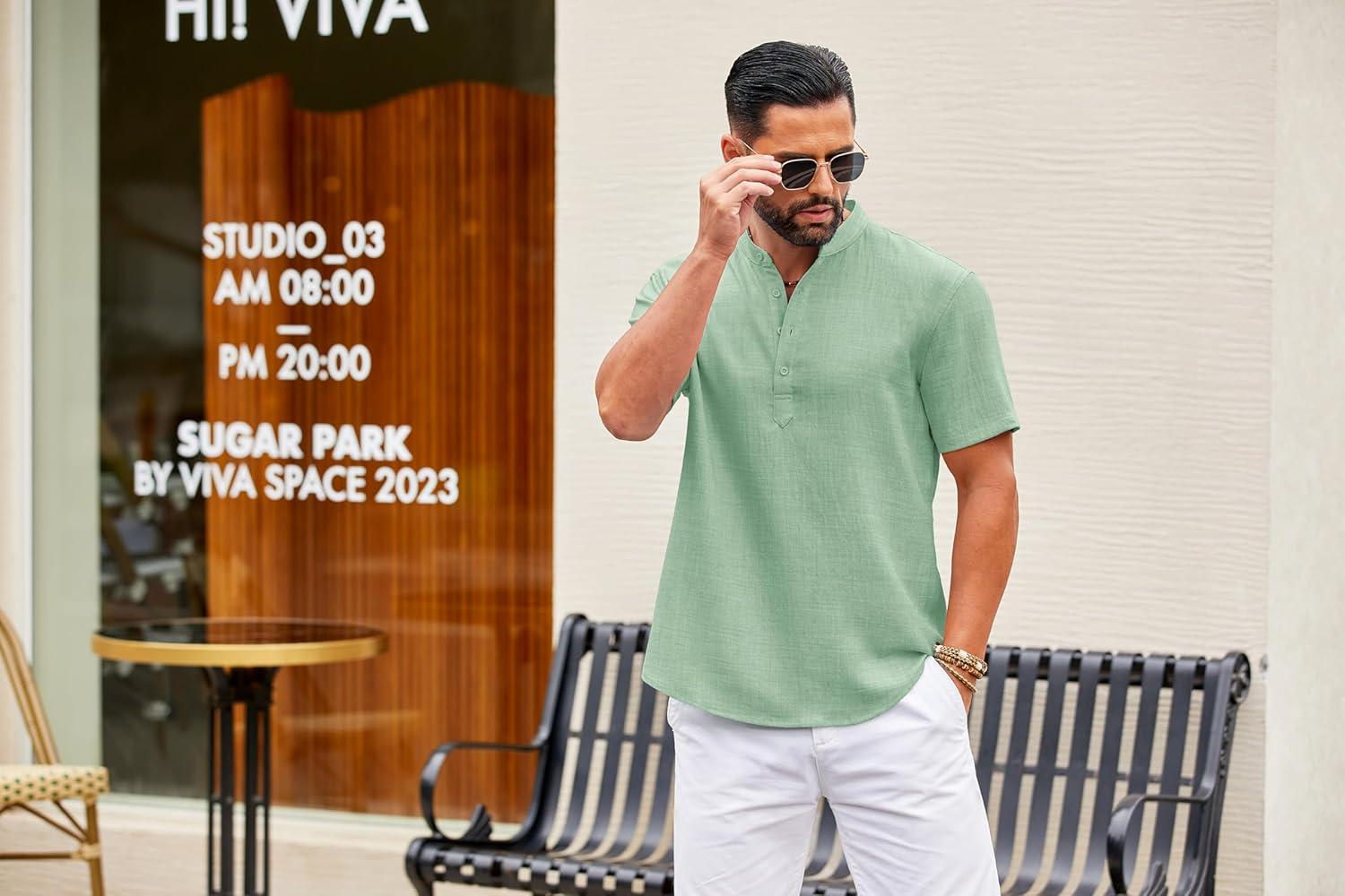 COOFANDY Men's Casual Henley Shirt Short Sleeve Summer Shirts Linen Band Collar Summer Beach Hippie T-Shirts(Light Green)