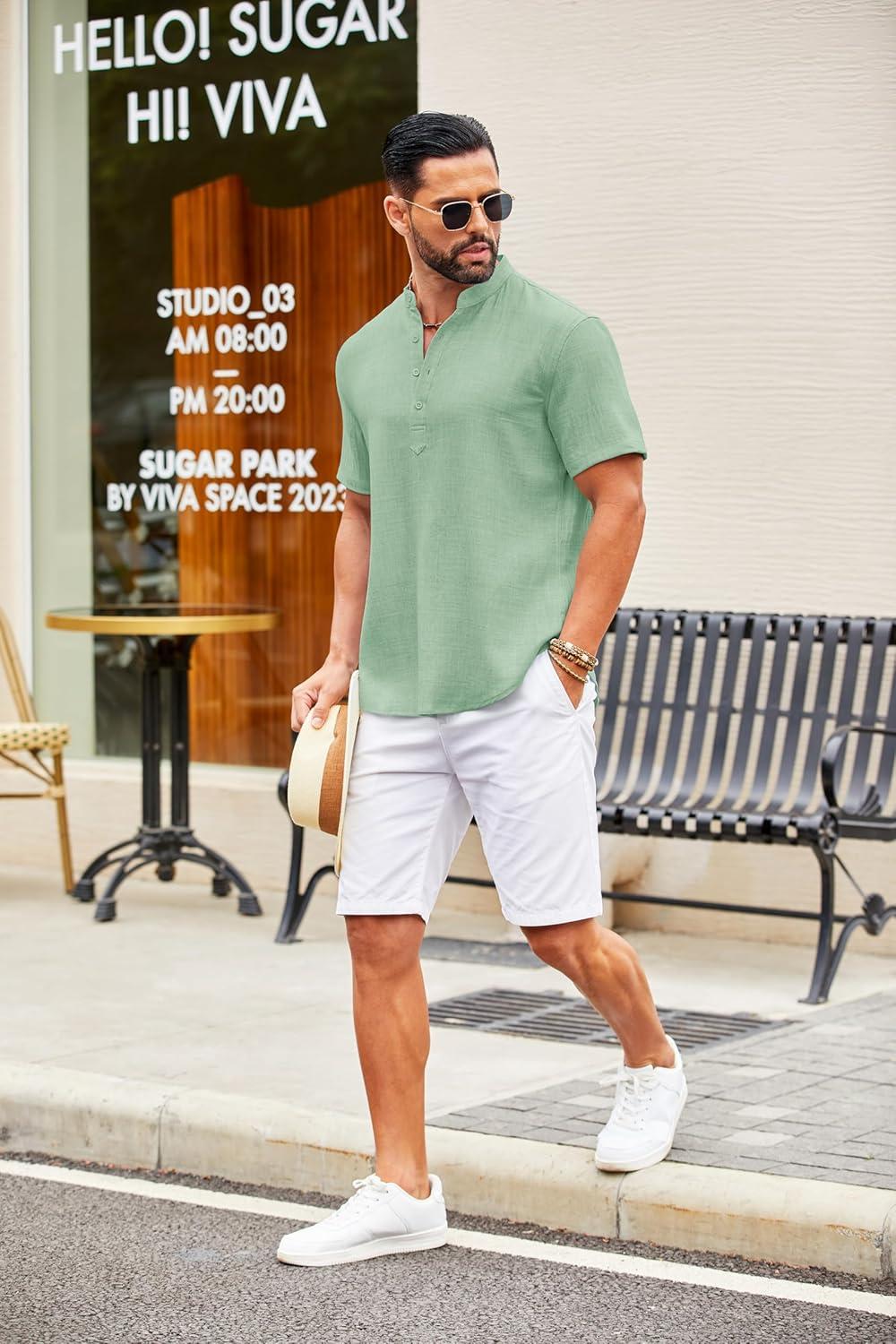 COOFANDY Men’s Casual Henley Shirt Short Sleeve Summer Shirts Linen Band Collar Summer Beach Hippie T-Shirts(Light Green)