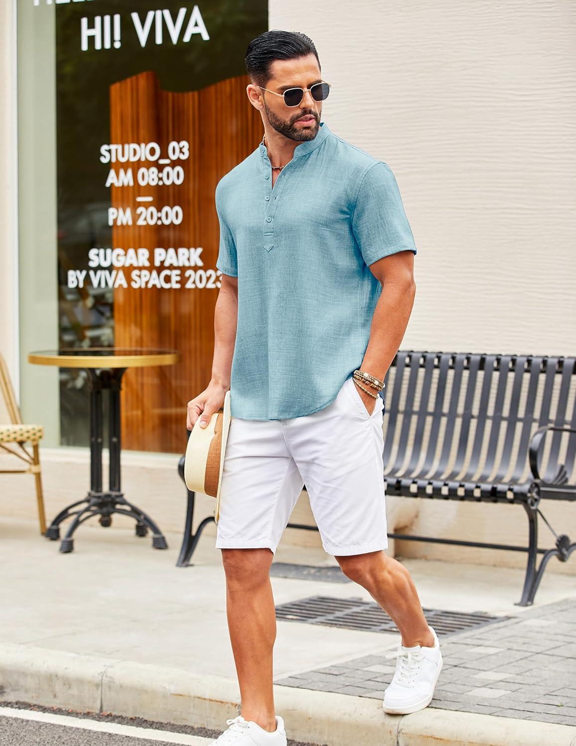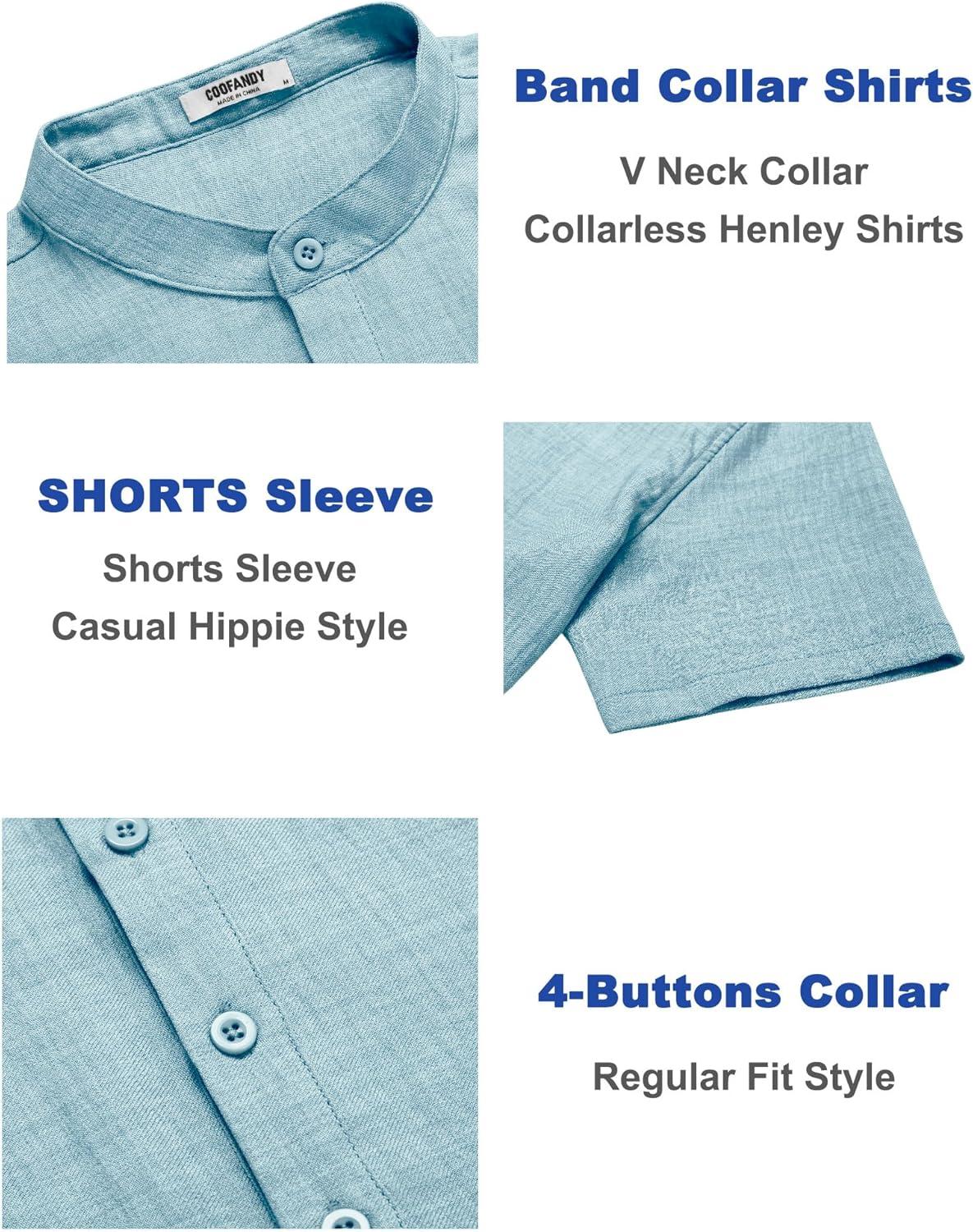 COOFANDY Men’s Casual Henley Shirt Short Sleeve Summer Shirts Linen Band Collar Summer Beach Hippie T-Shirts(Light Blue)