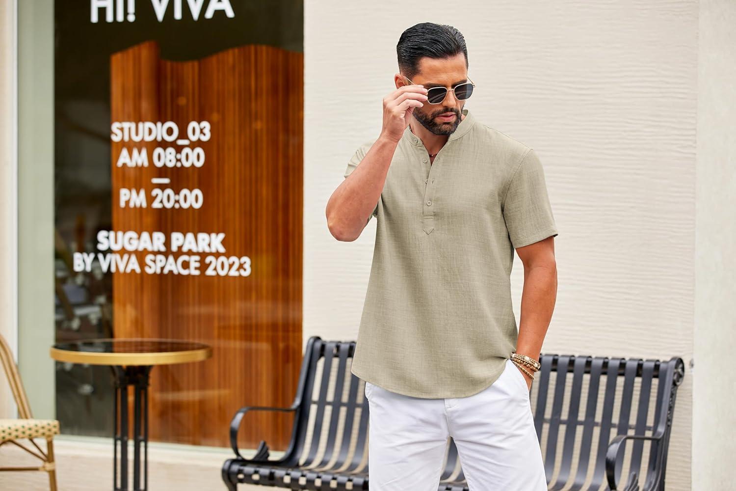 COOFANDY Men’s Casual Henley Shirt Short Sleeve Summer Shirts Linen Band Collar Summer Beach Hippie T-Shirts(Light Khaki)