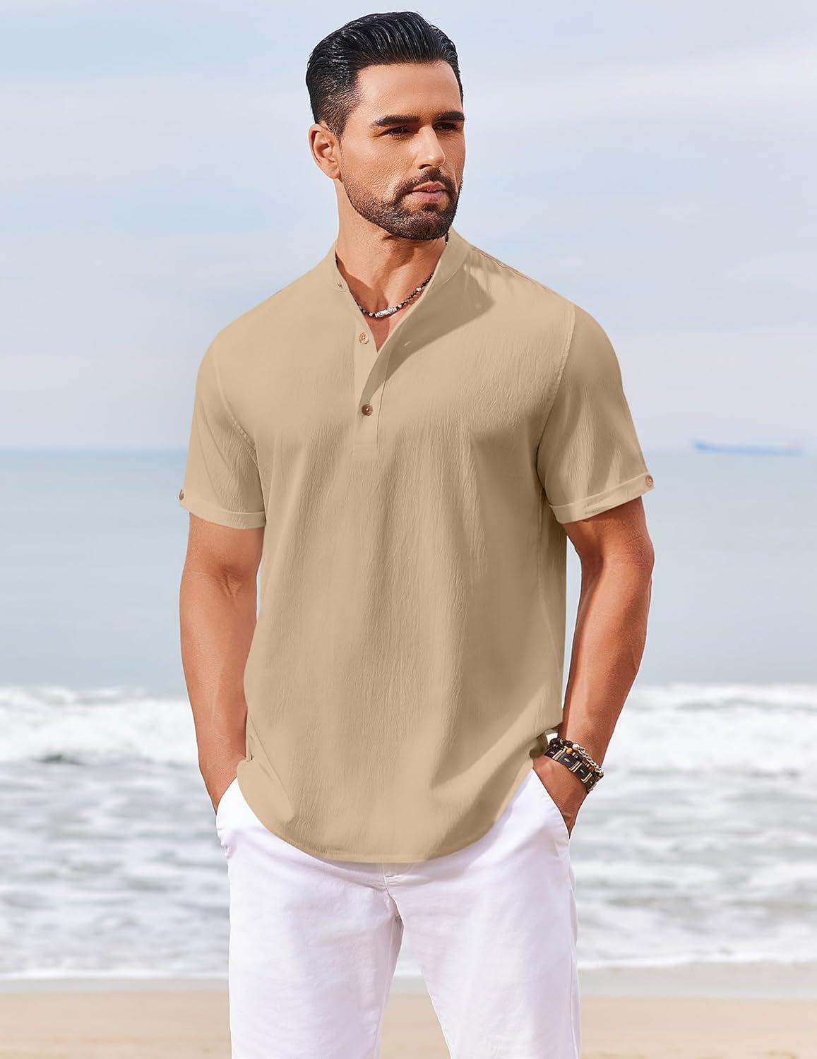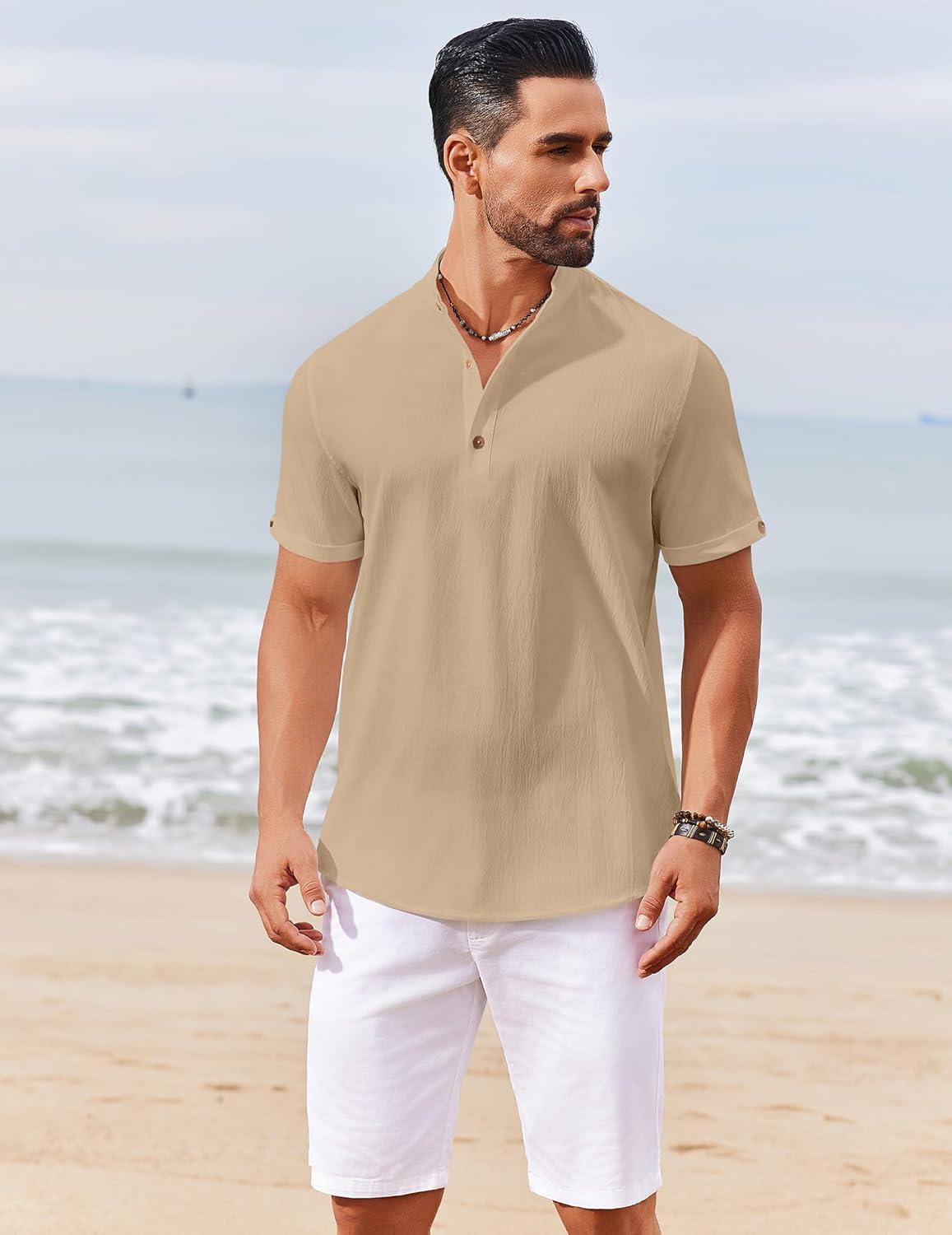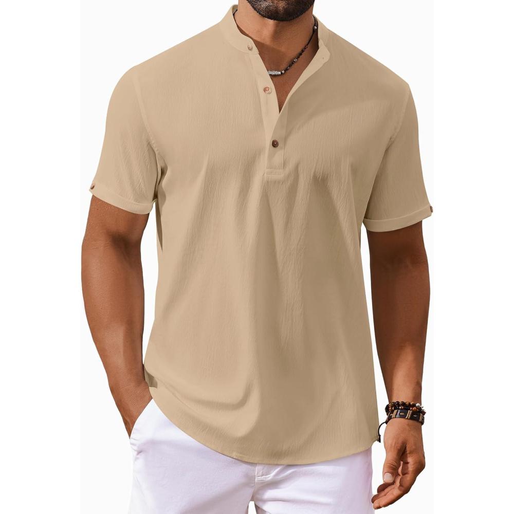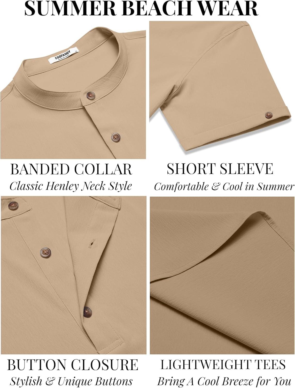 COOFANDY Men's Casual Henley Shirts Short Sleeve Summer Beach T-Shirts Banded Collar Henleys Button Tee Shirt(Khaki)